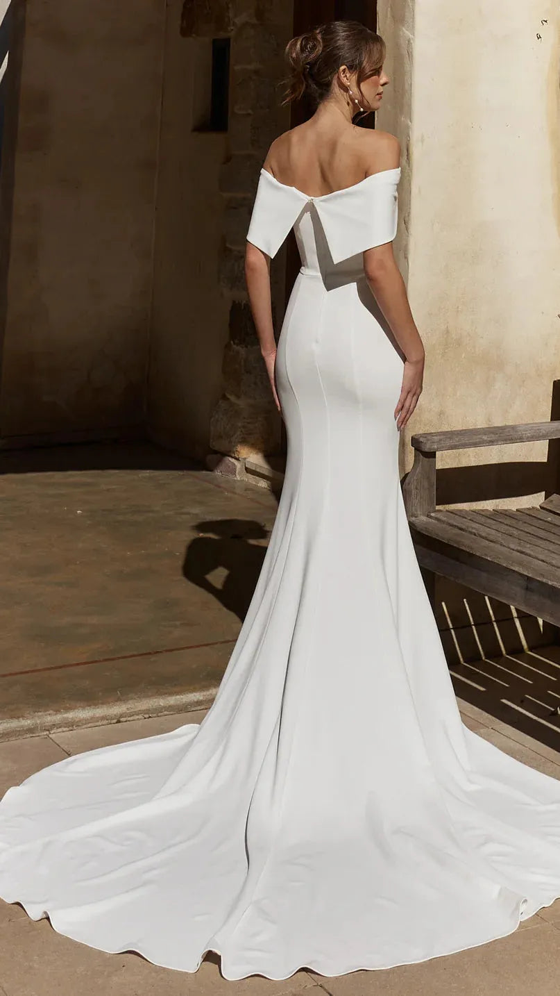 The Abbie wedding dress is a refined fit and flare gown crafted from luxurious stretch crepe. Pleats cascade from the left hip across the bodice and skirt, adding subtle detail while maintaining a clean, elegant silhouette. The straight neckline features a panel that flows across the bust into off-the-shoulder sleeves at the back, and the skirt extends into a graceful cathedral-length train.