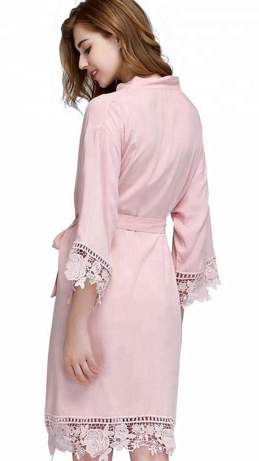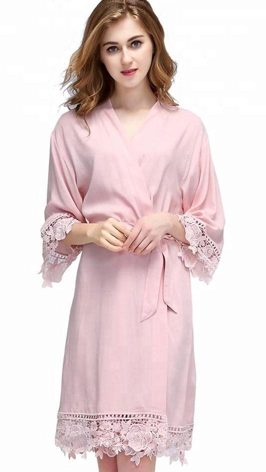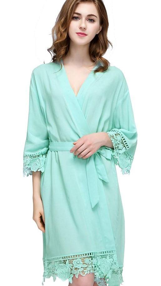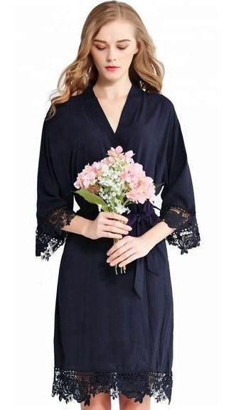 Perfect for brides and bridesmaids this lightweight cotton bridal party robe has a beautiful lace edging on sleeves and at the bottom.