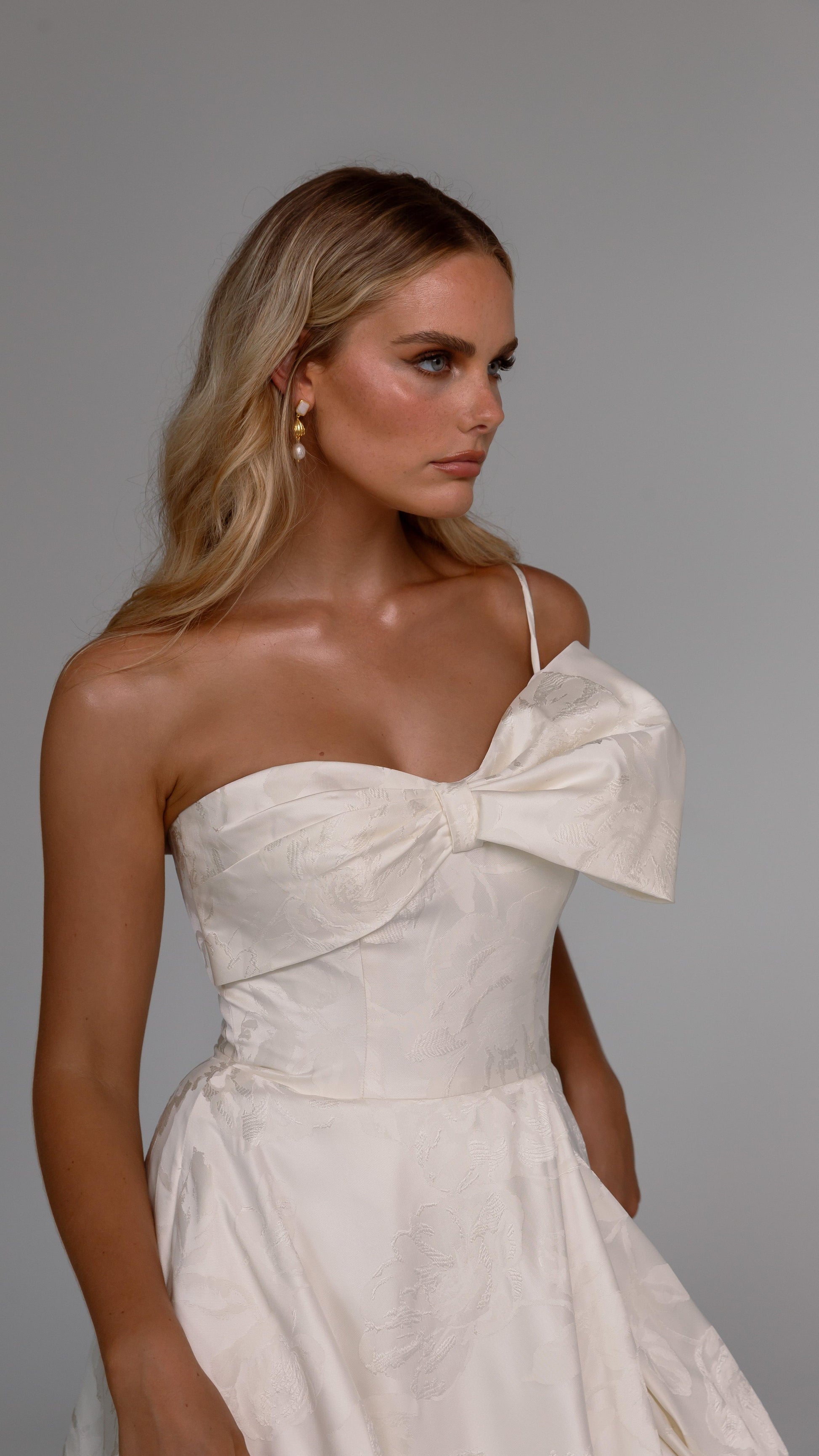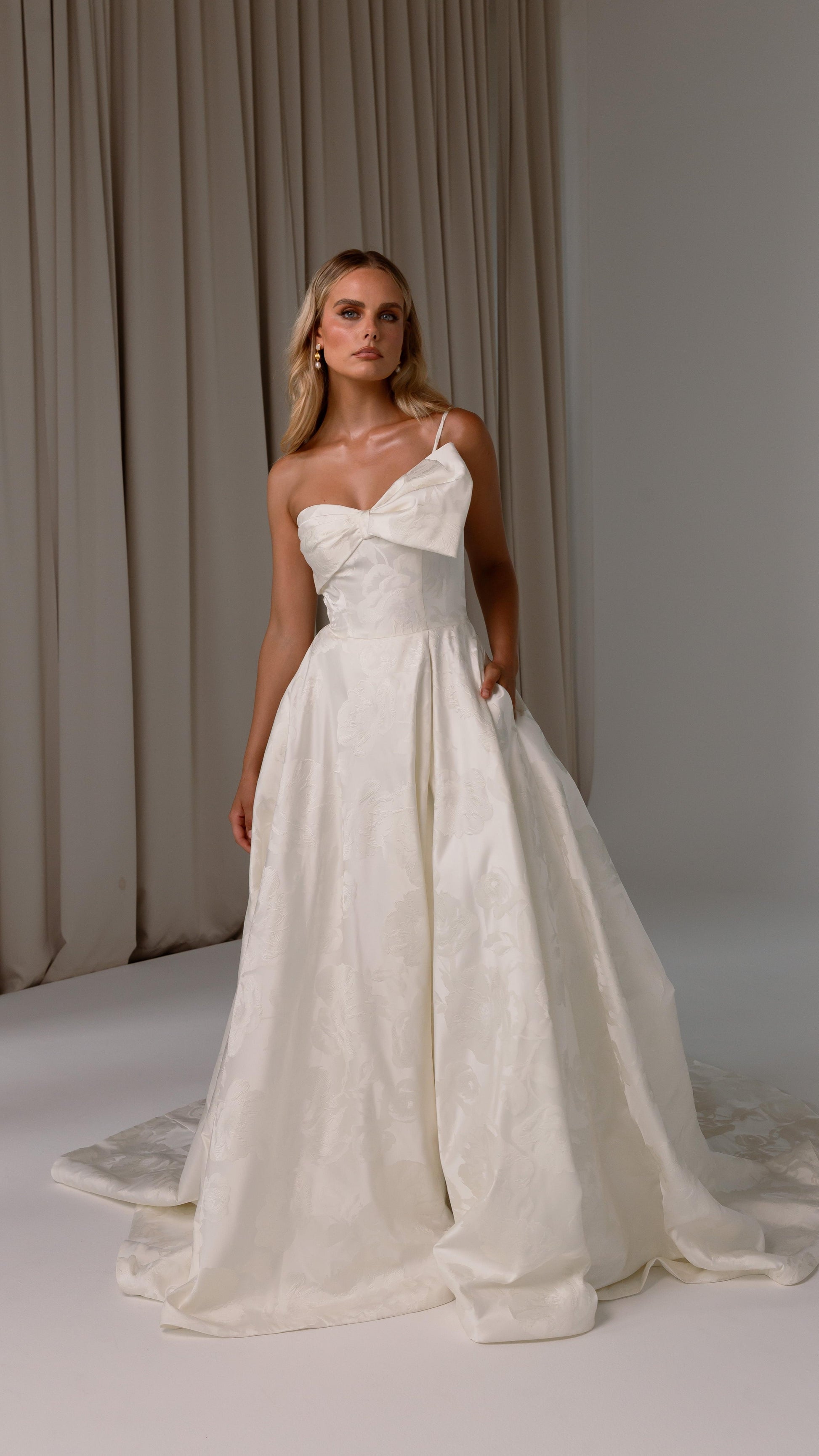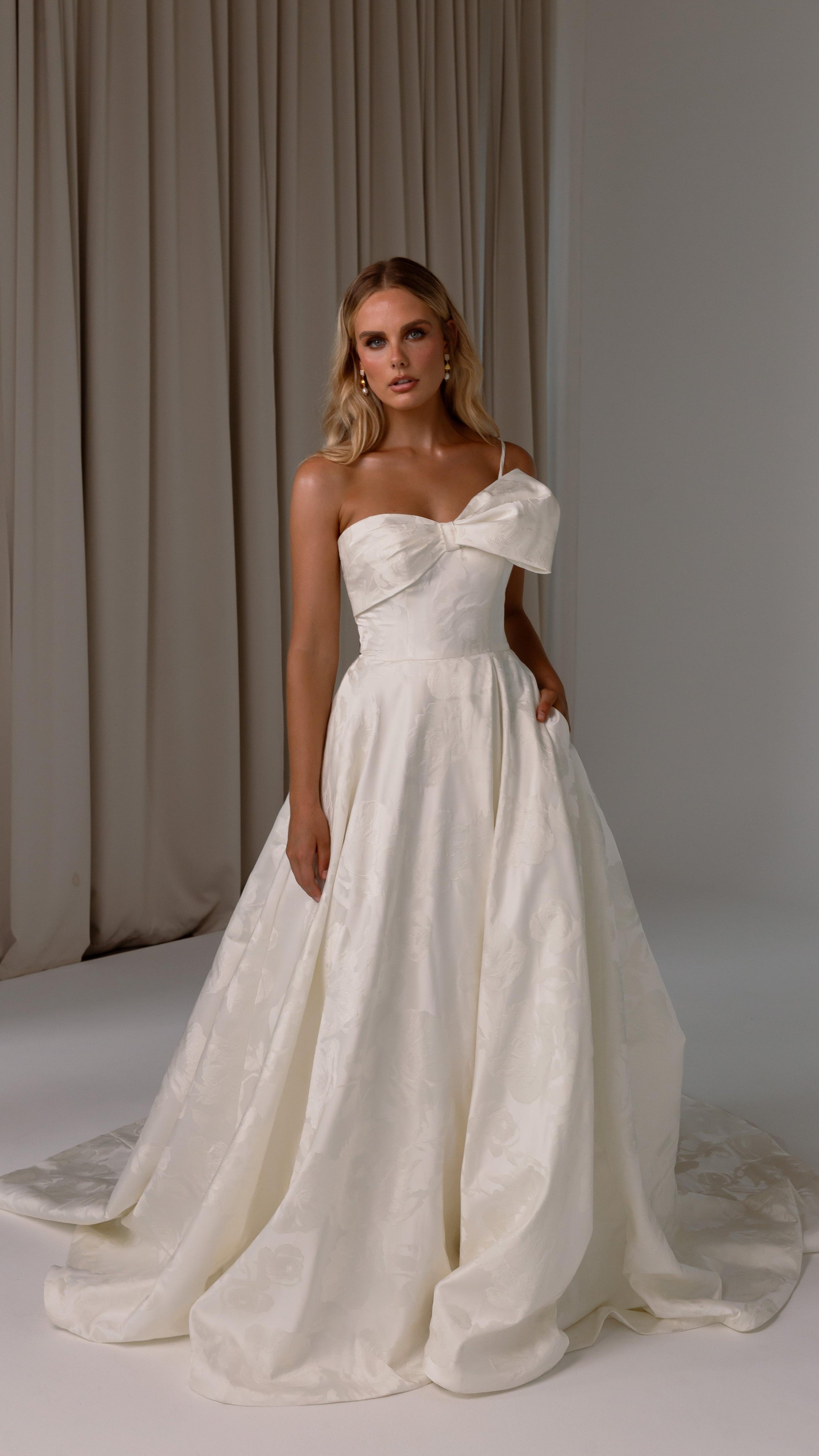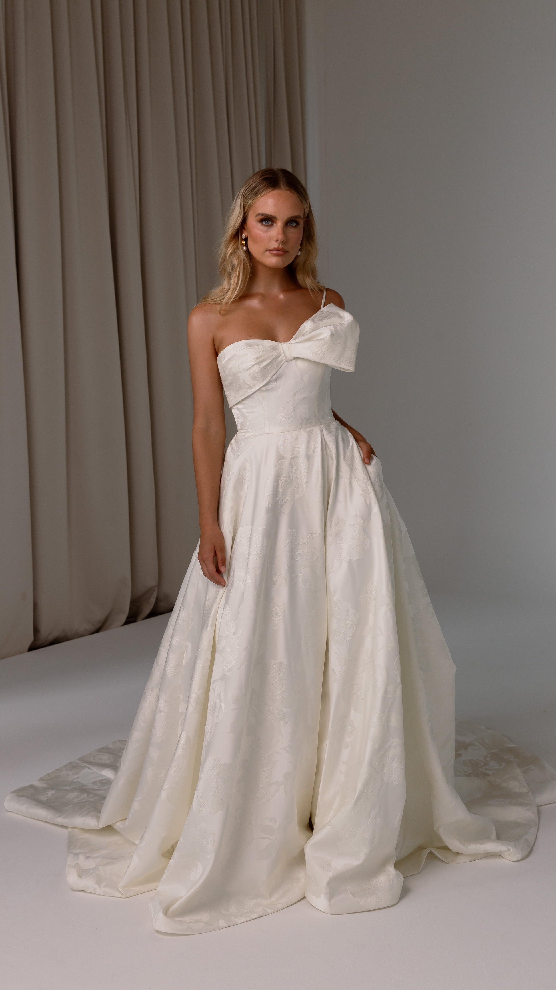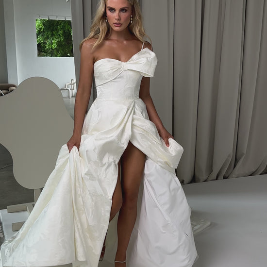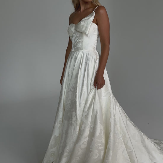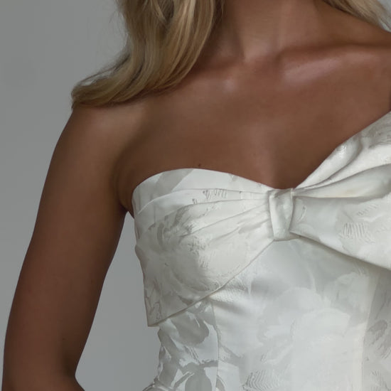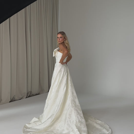 Make a bold yet graceful statement in our Ginger wedding dress by Tania Olsen Designs, designed for the modern bride with a flair for the dramatic. Crafted from luxe jacquard satin, the one-shoulder silhouette is elevated by a sculptural front bow, blending fashion-forward design with timeless sophistication.