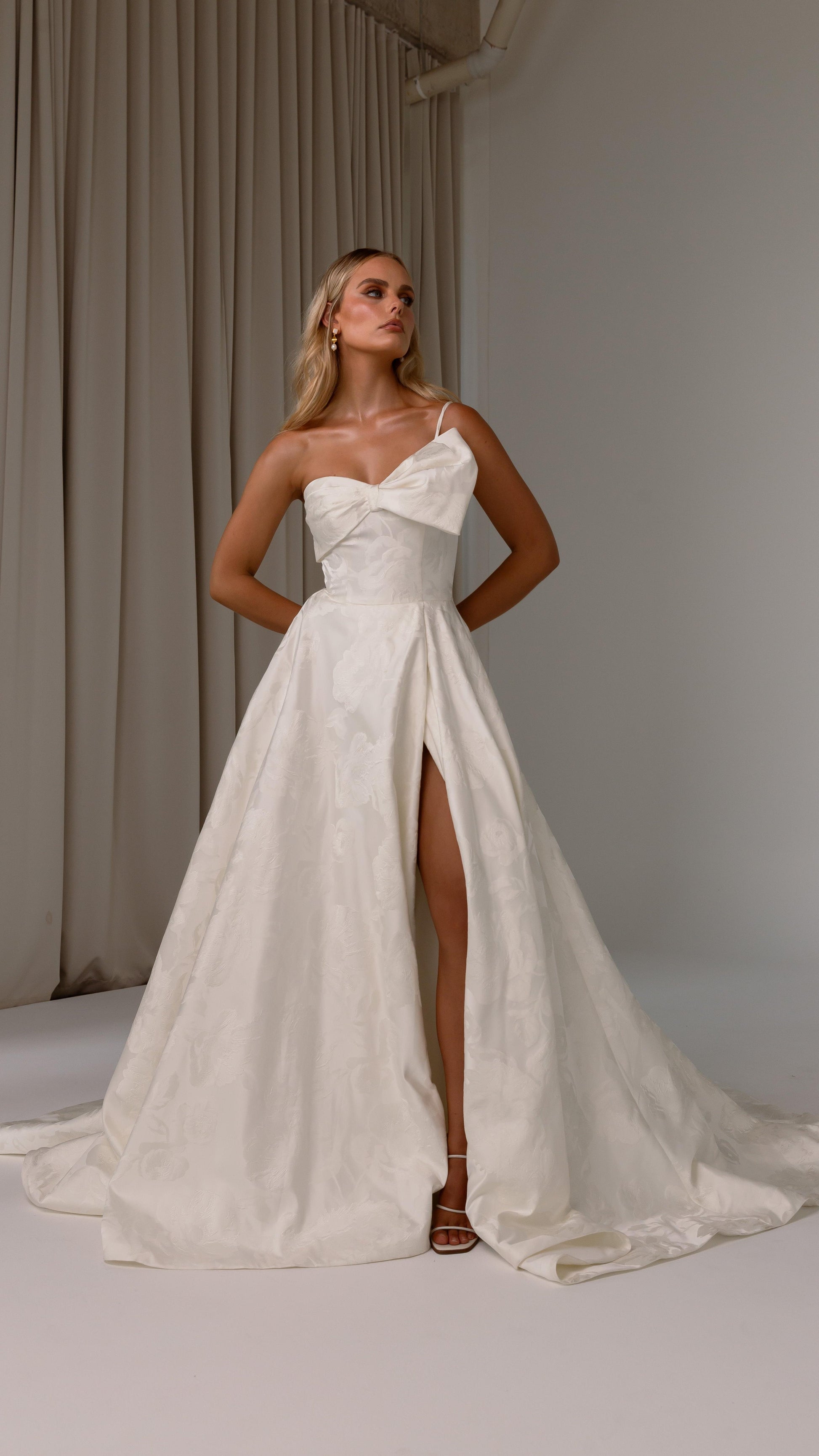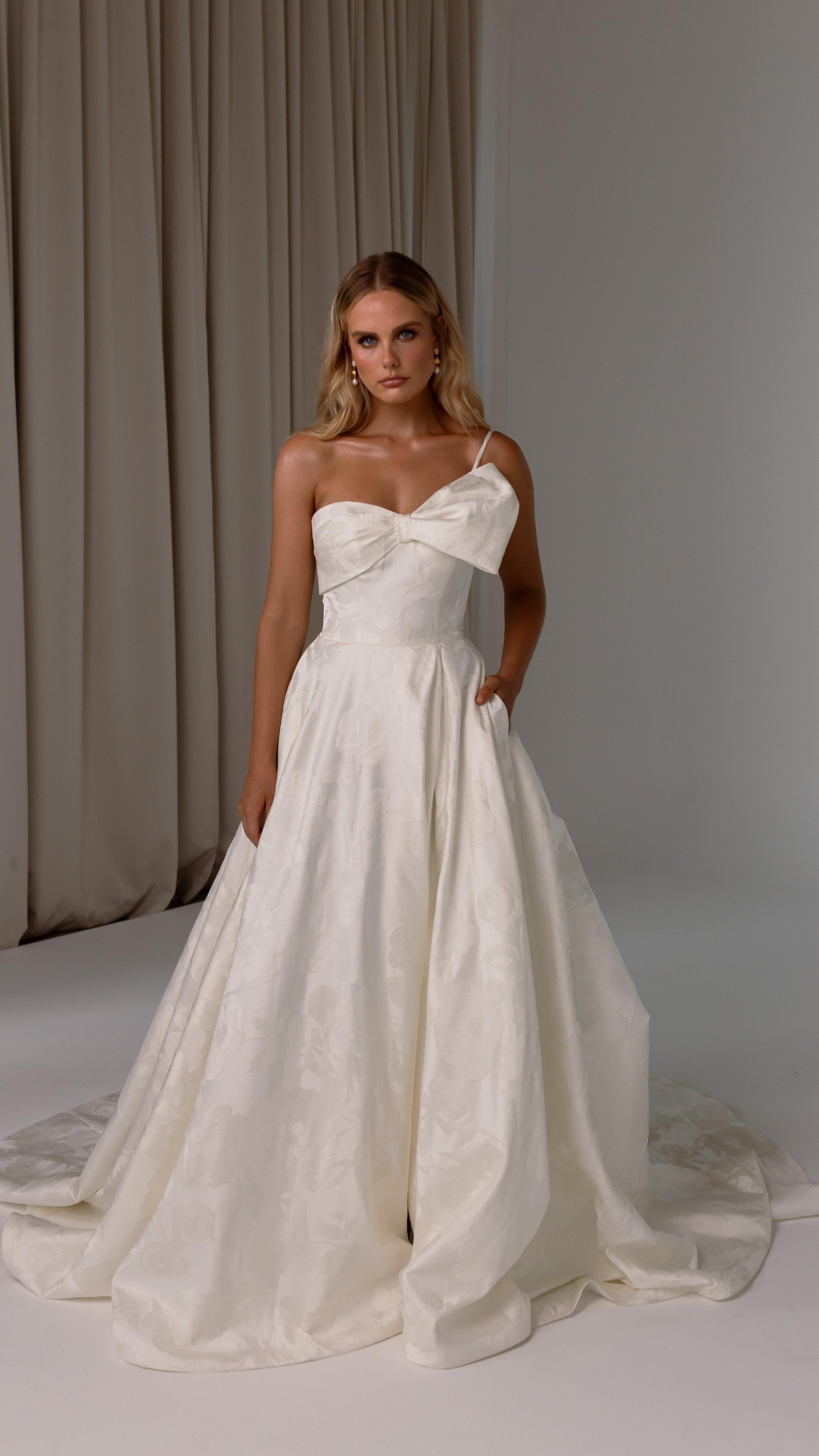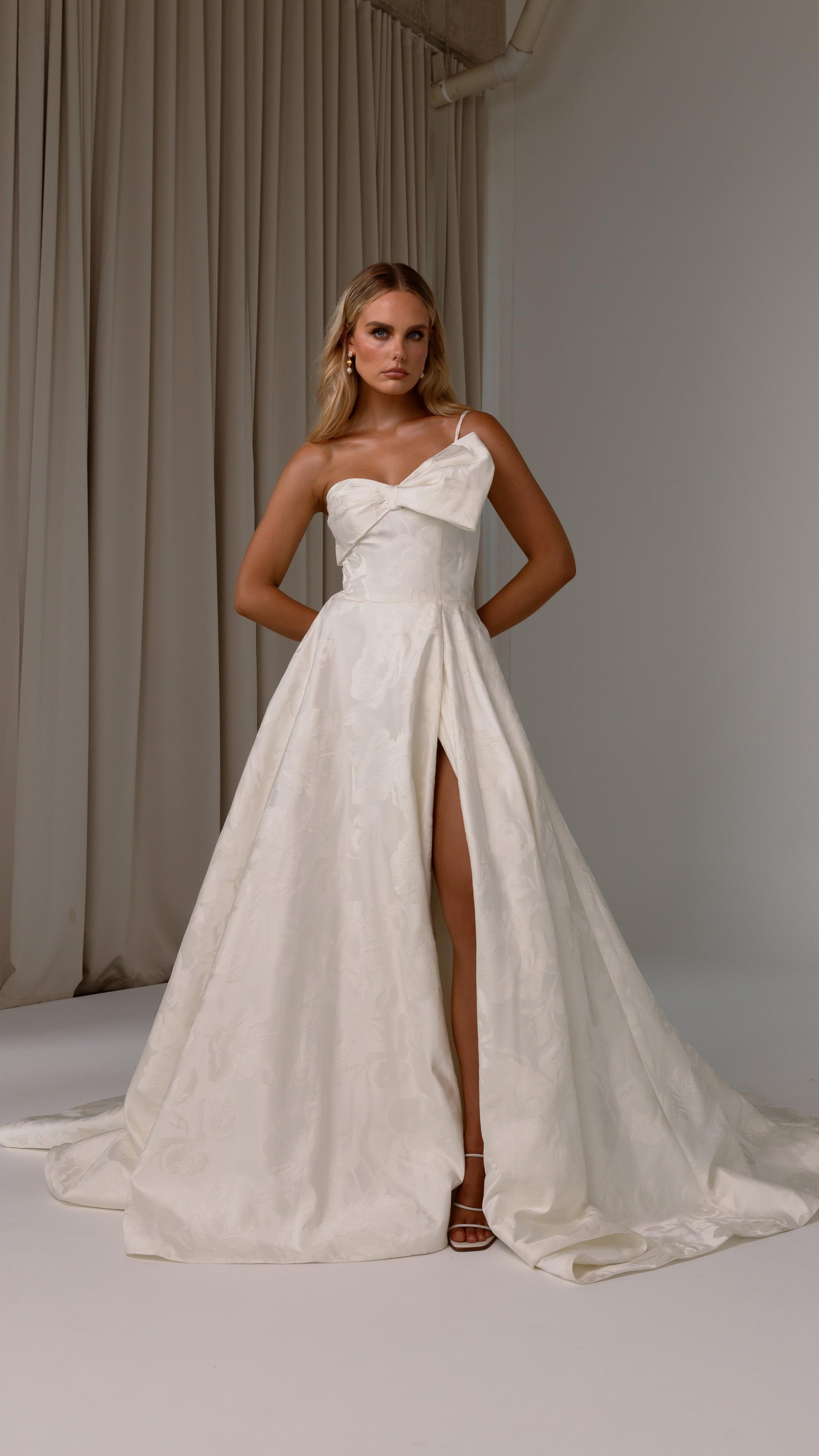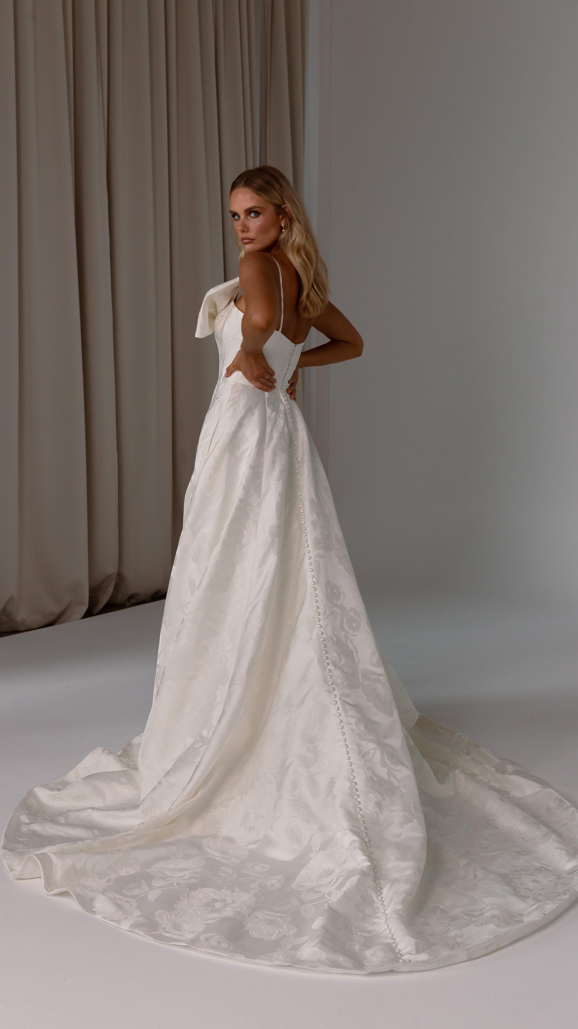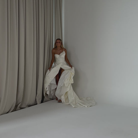 Make a bold yet graceful statement in our Ginger wedding dress by Tania Olsen Designs, designed for the modern bride with a flair for the dramatic. Crafted from luxe jacquard satin, the one-shoulder silhouette is elevated by a sculptural front bow, blending fashion-forward design with timeless sophistication.