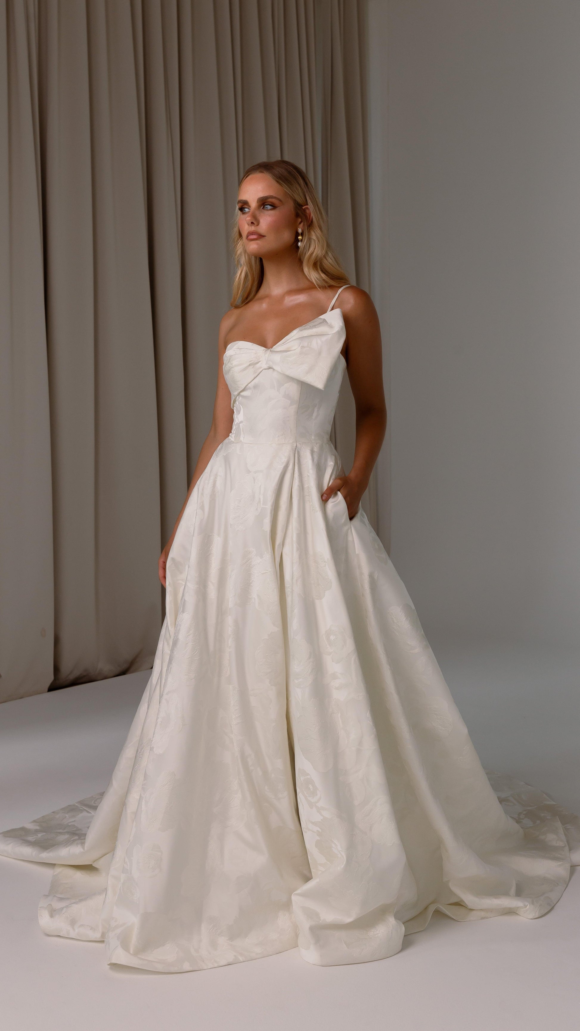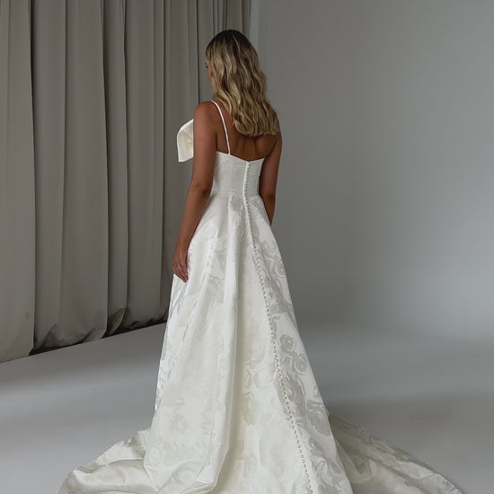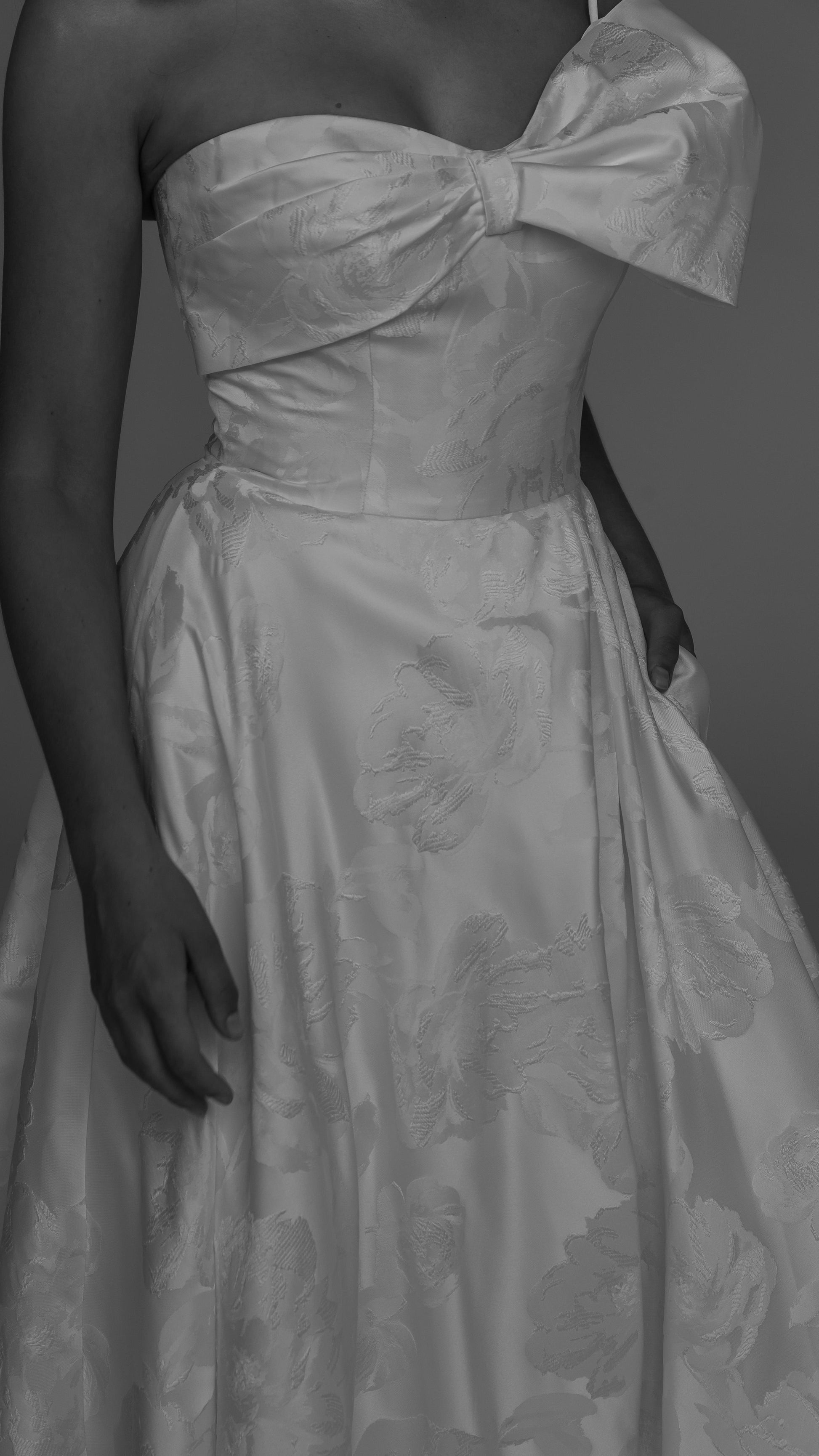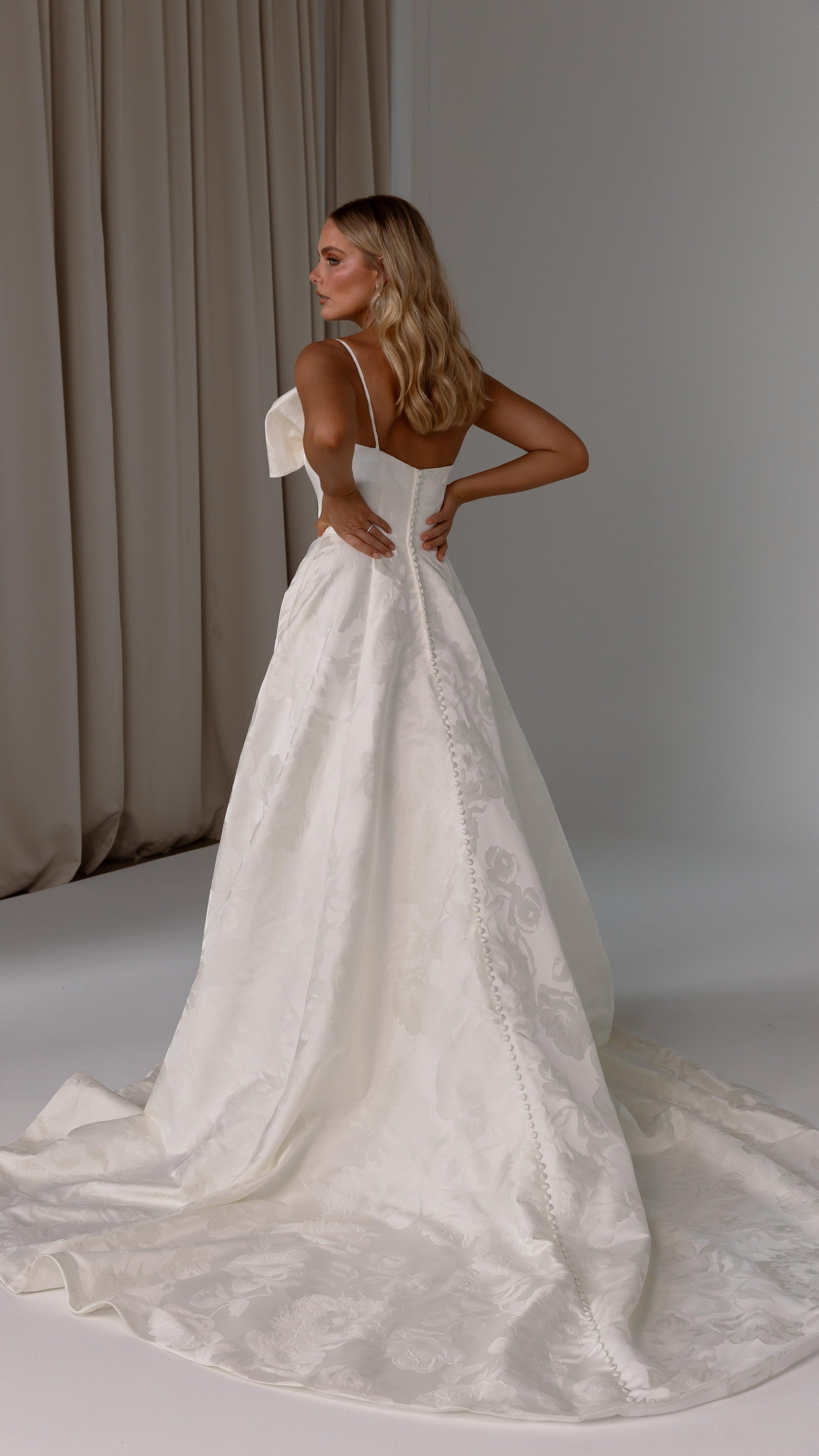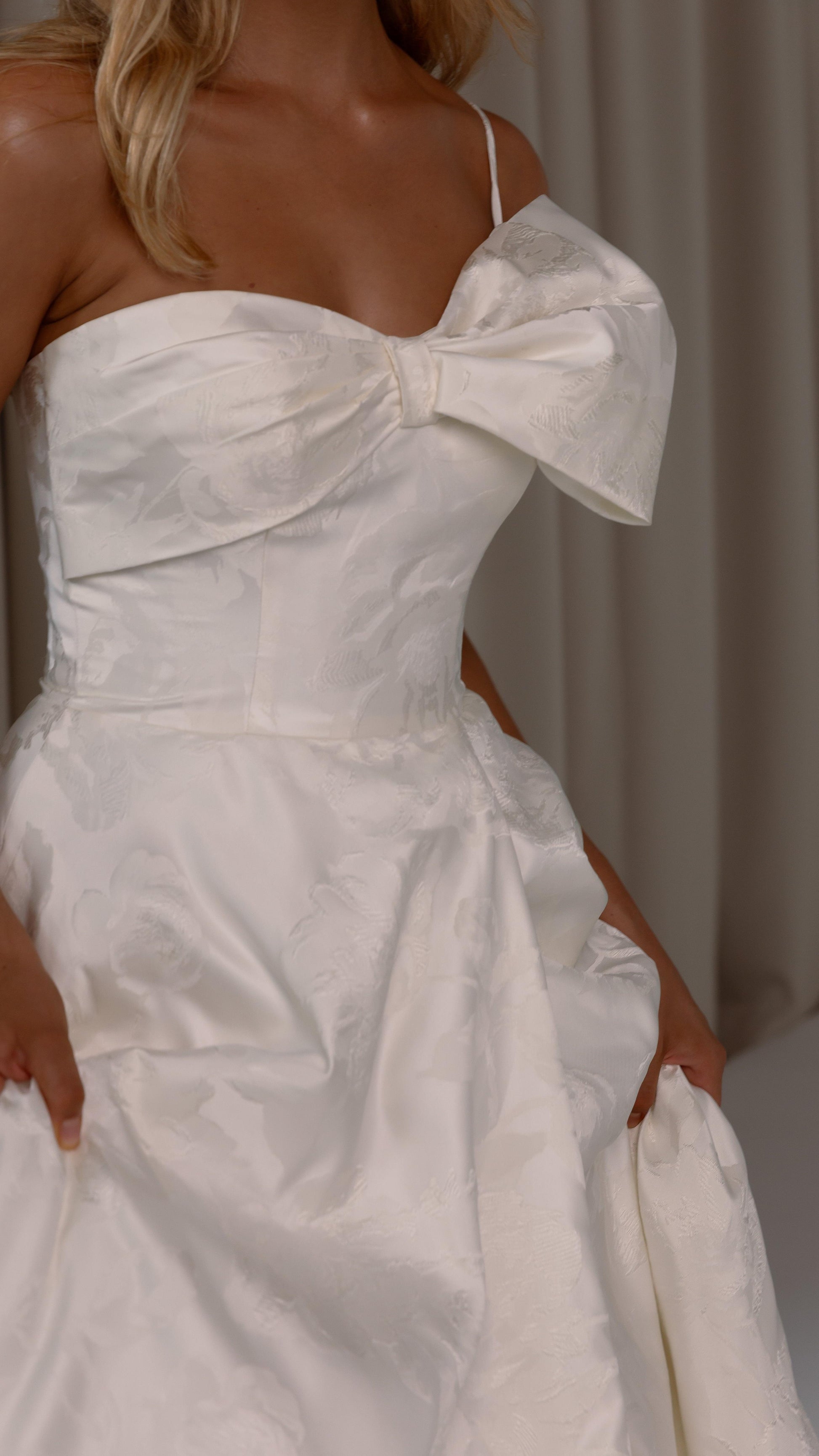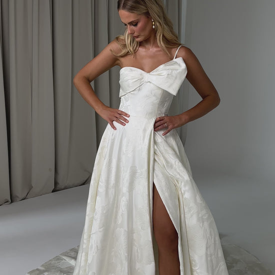 Make a bold yet graceful statement in our Ginger wedding dress by Tania Olsen Designs, designed for the modern bride with a flair for the dramatic. Crafted from luxe jacquard satin, the one-shoulder silhouette is elevated by a sculptural front bow, blending fashion-forward design with timeless sophistication.