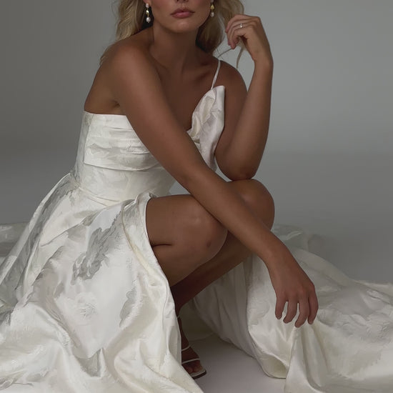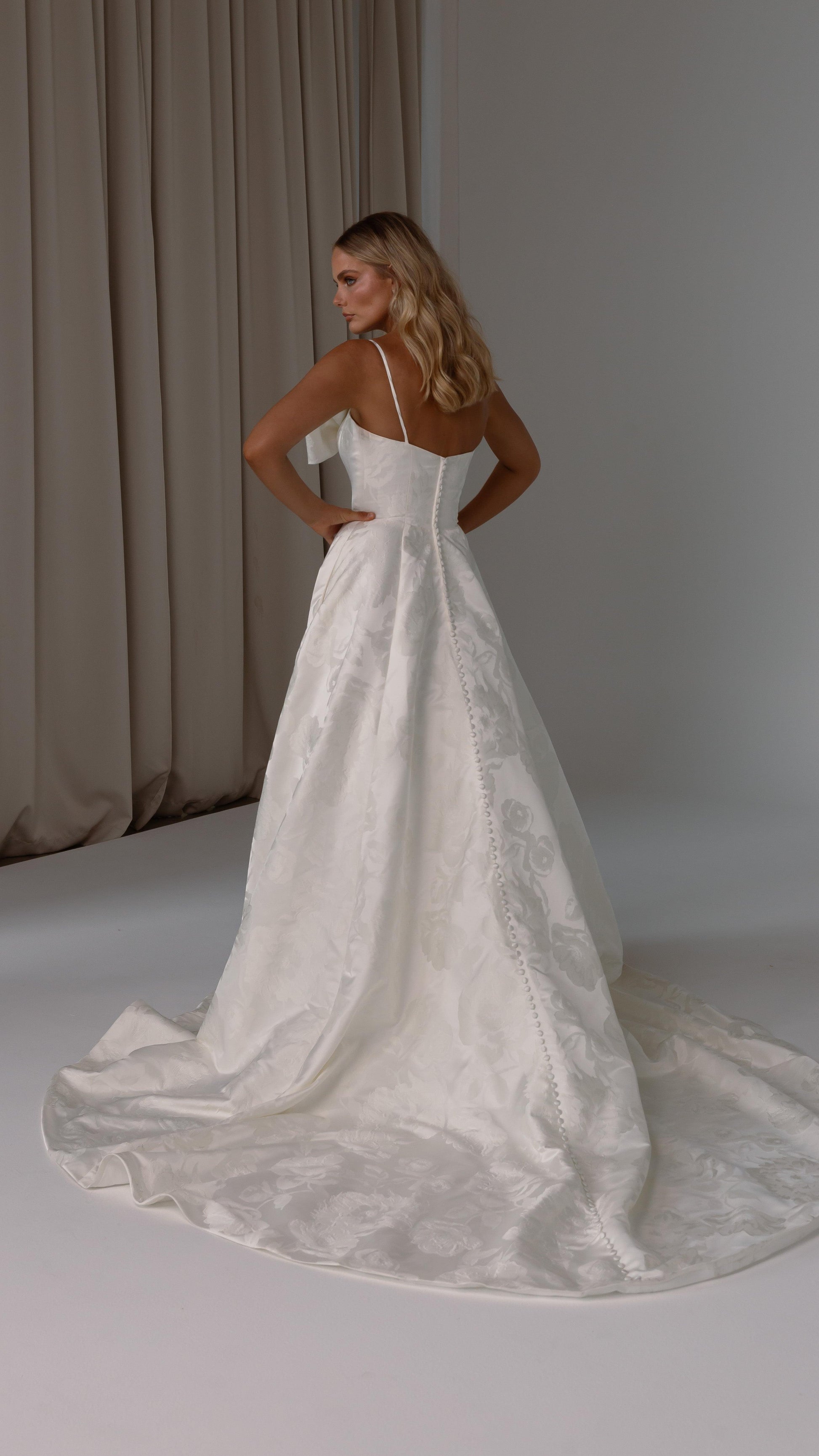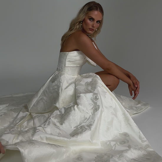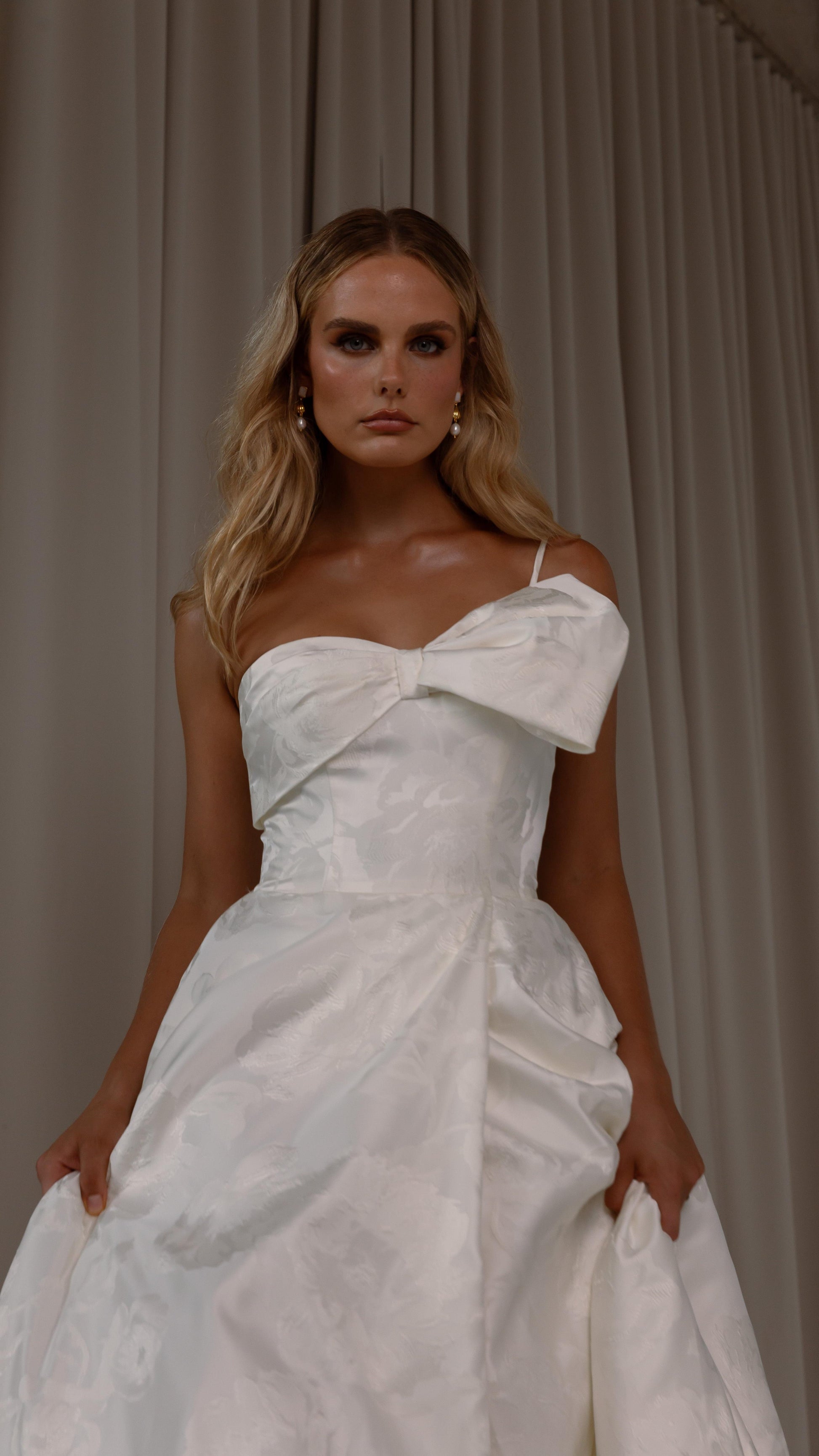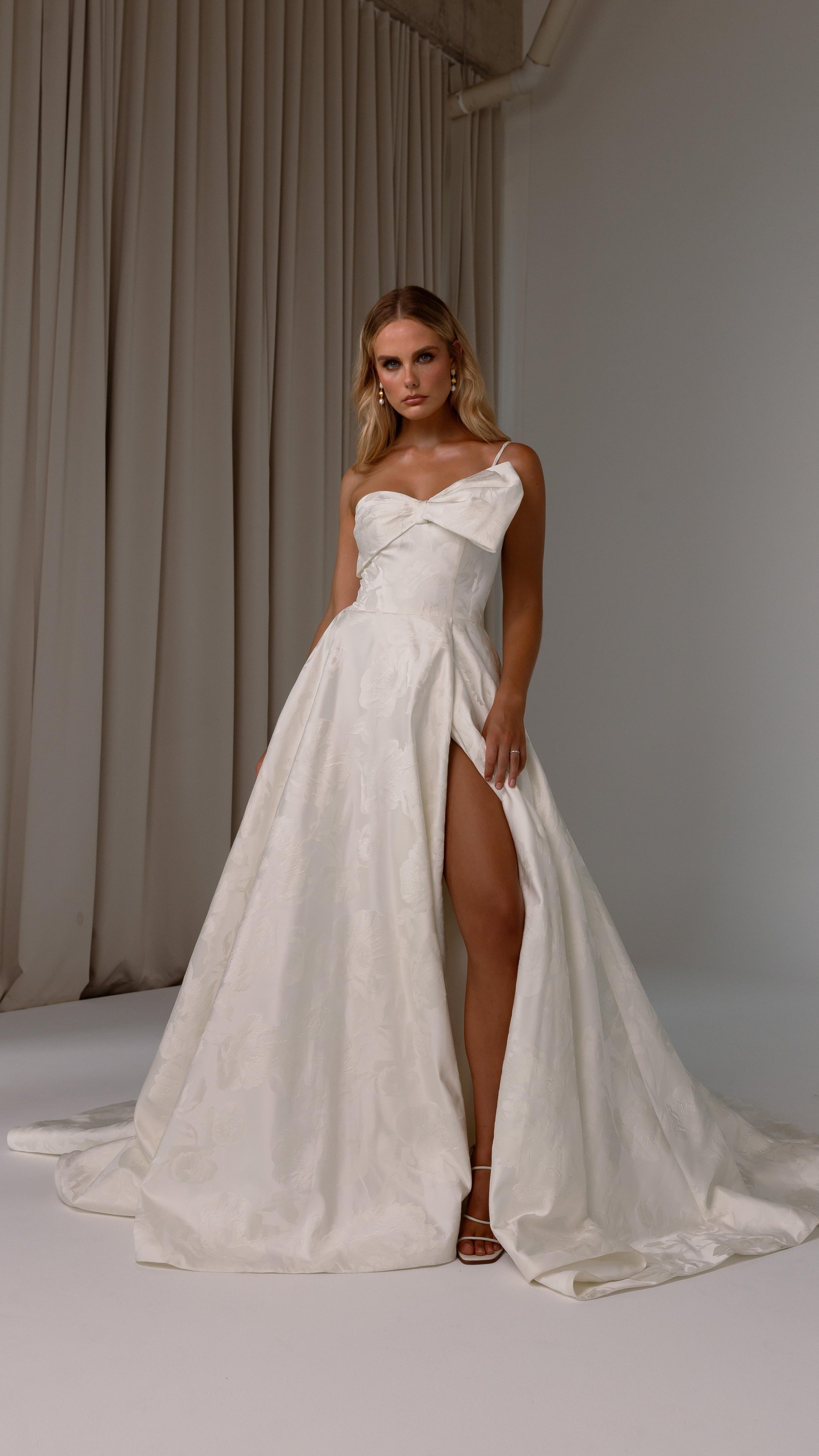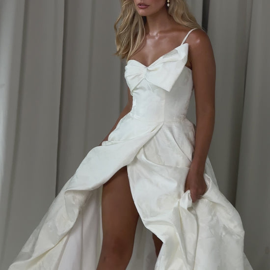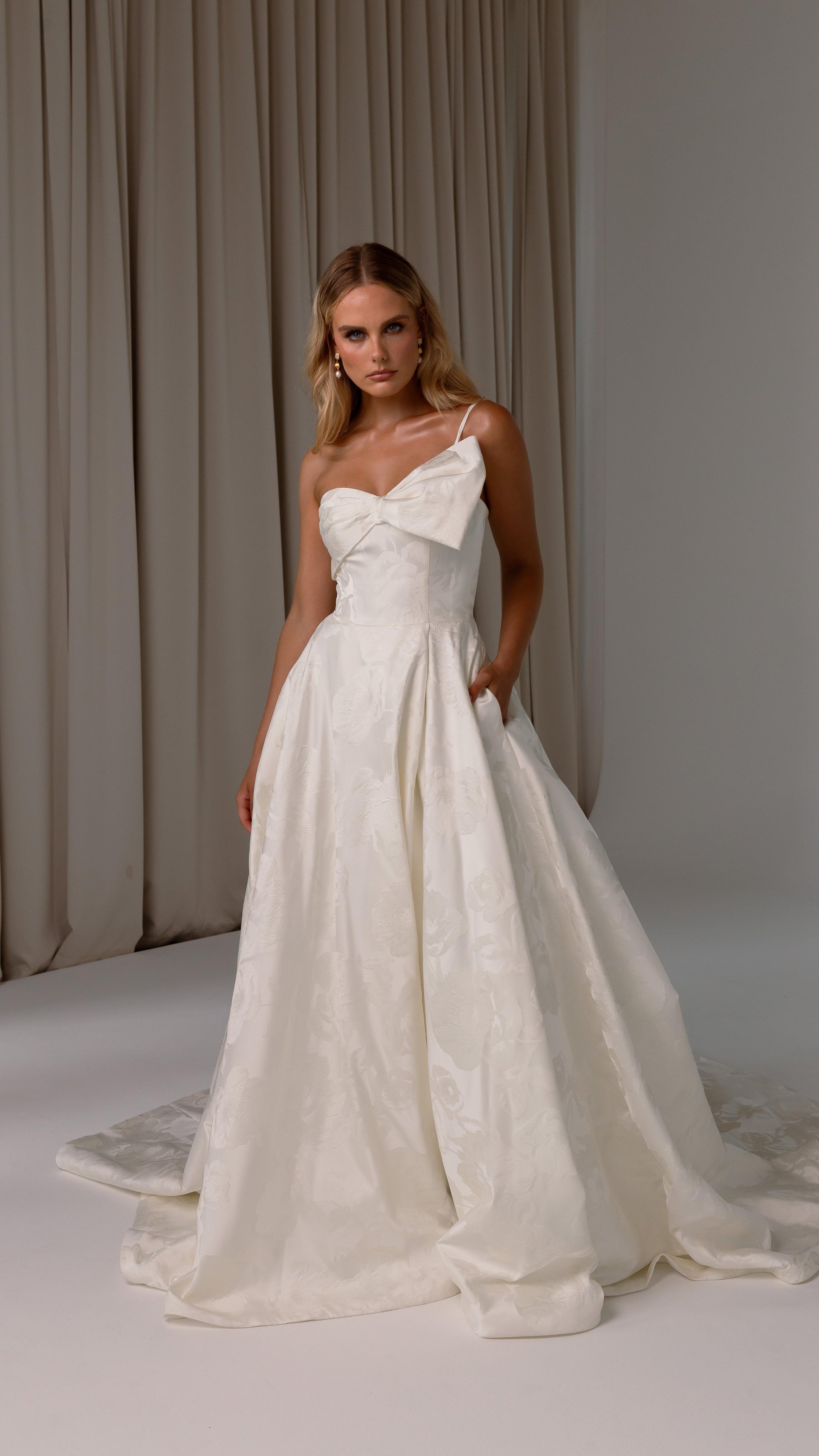 Make a bold yet graceful statement in our Ginger wedding dress by Tania Olsen Designs, designed for the modern bride with a flair for the dramatic. Crafted from luxe jacquard satin, the one-shoulder silhouette is elevated by a sculptural front bow, blending fashion-forward design with timeless sophistication.