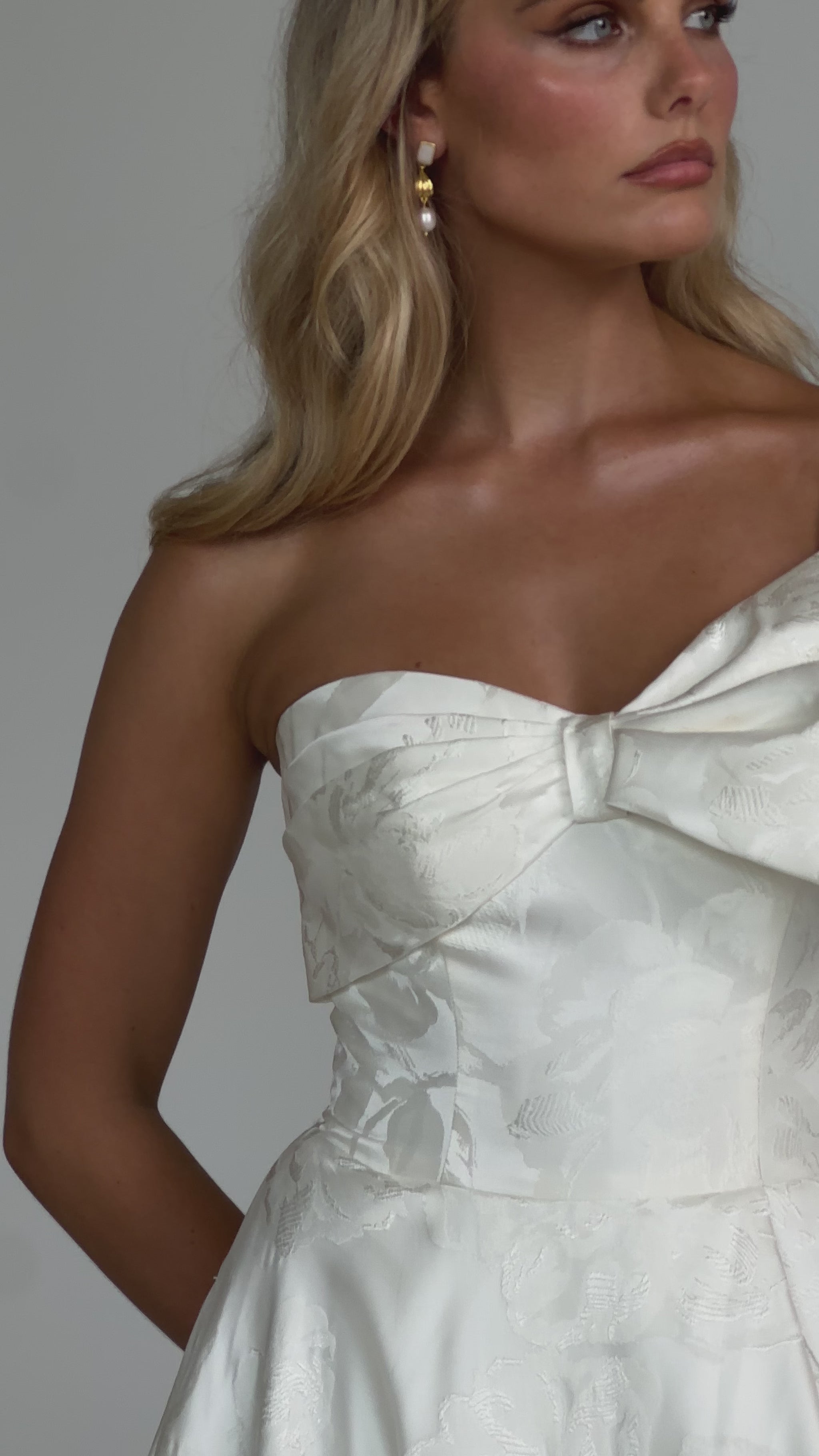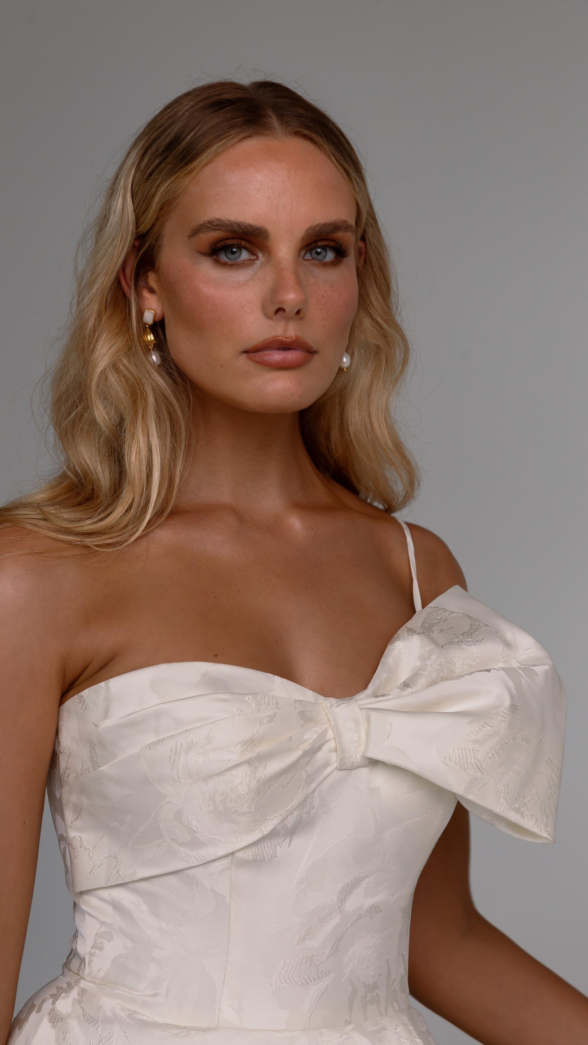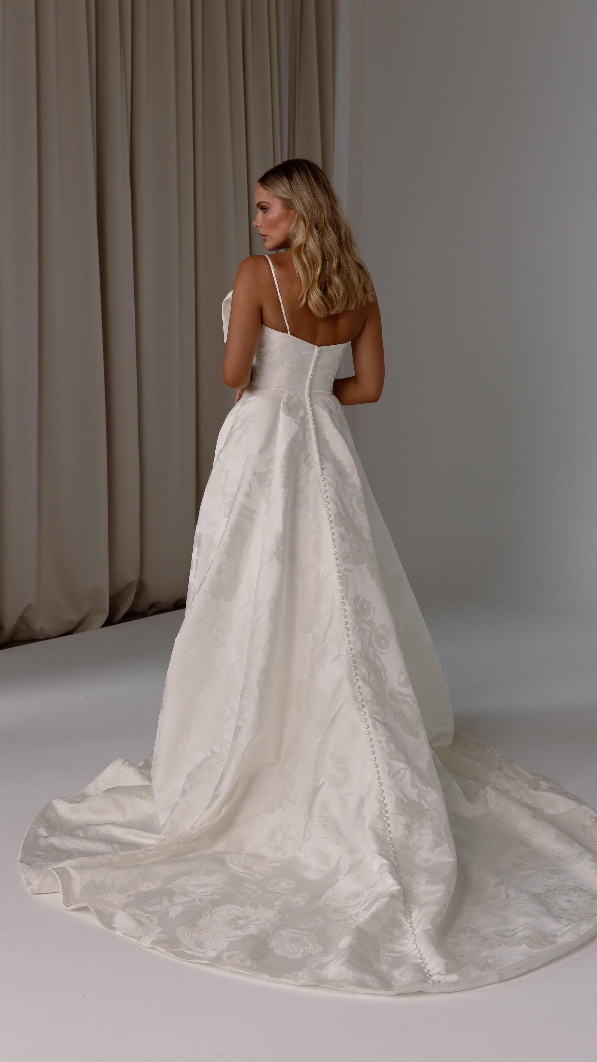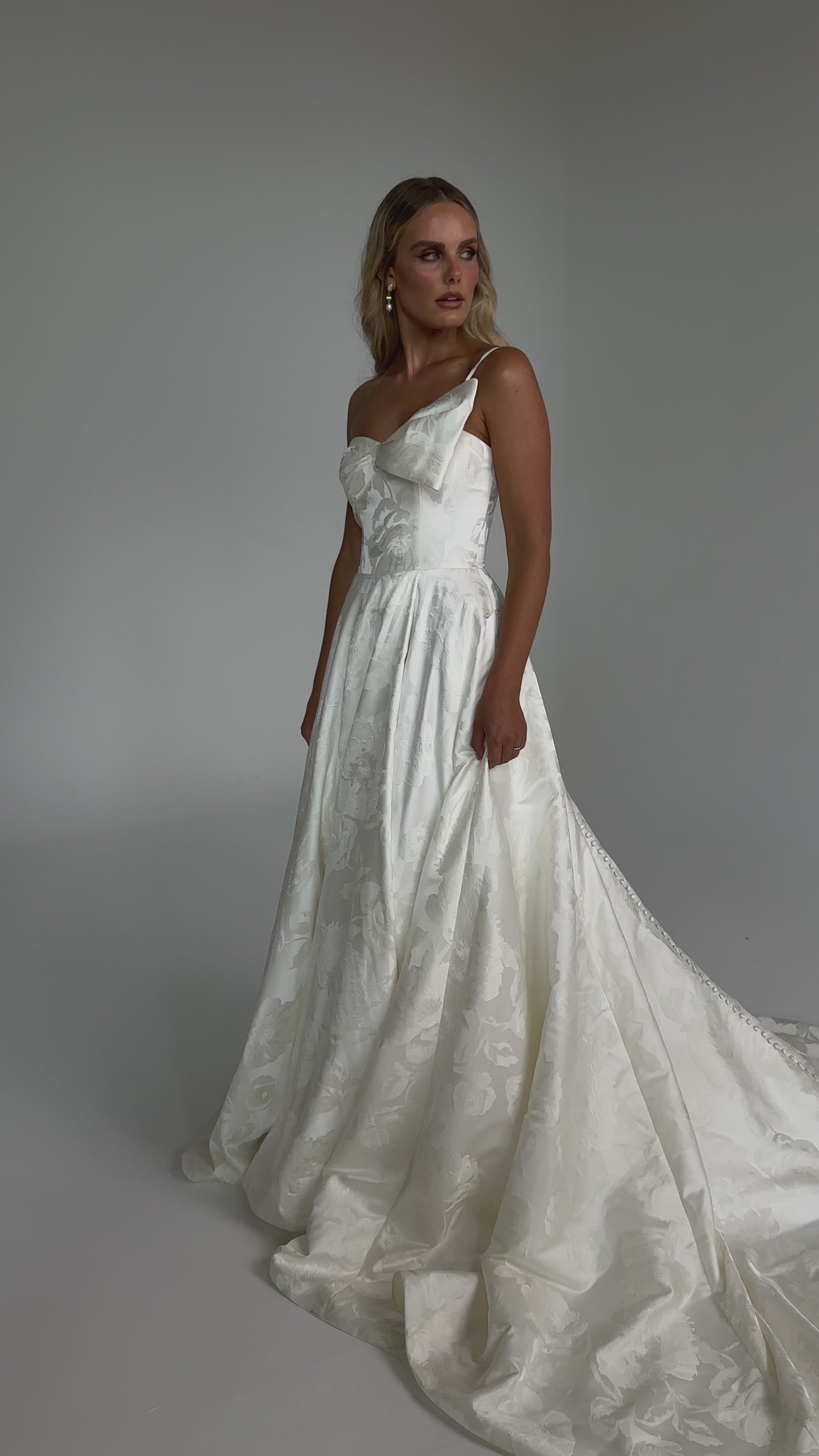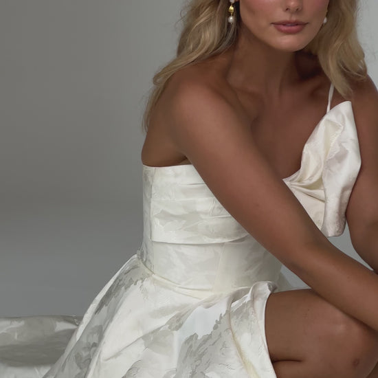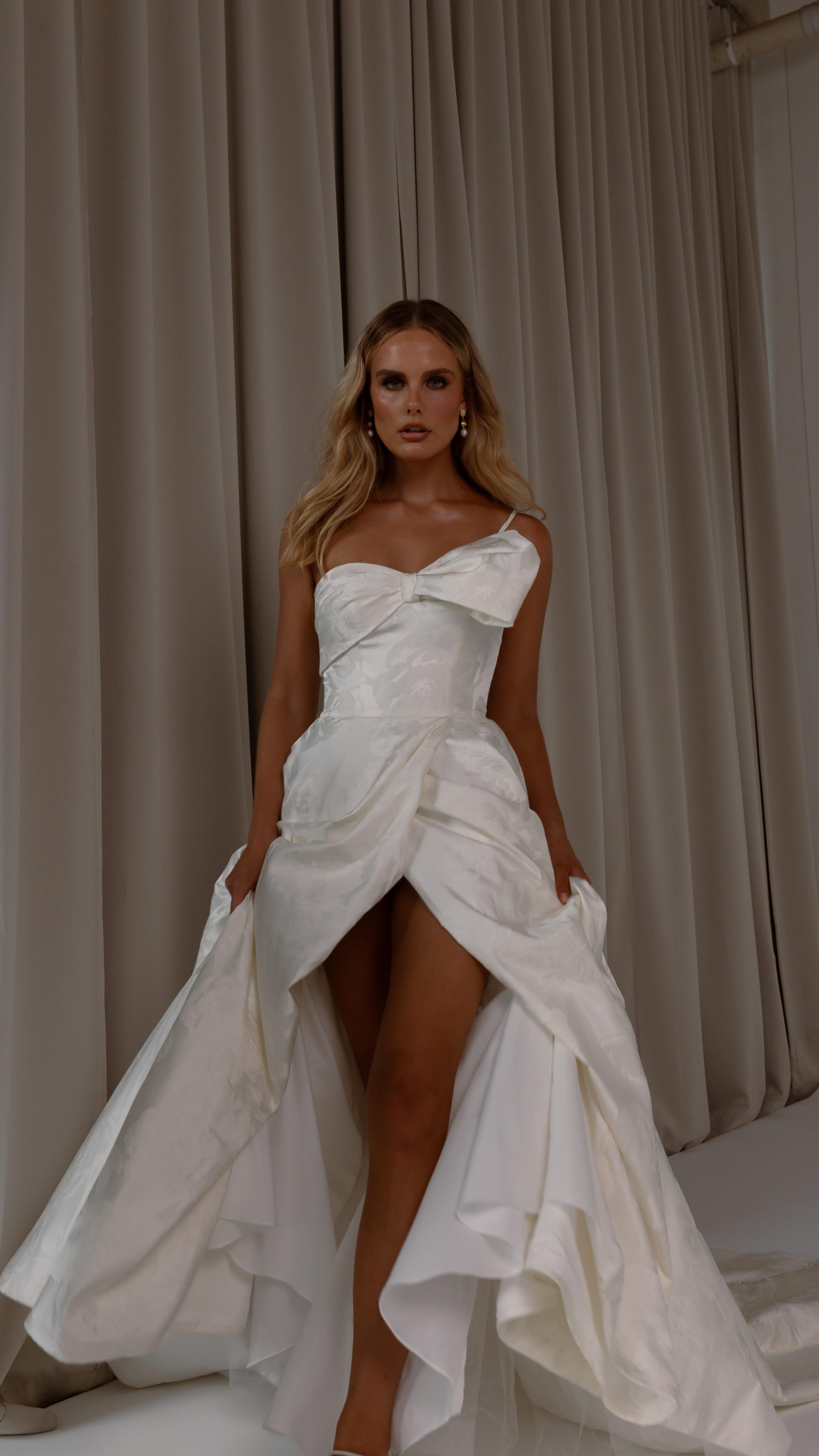 Make a bold yet graceful statement in our Ginger wedding dress by Tania Olsen Designs, designed for the modern bride with a flair for the dramatic. Crafted from luxe jacquard satin, the one-shoulder silhouette is elevated by a sculptural front bow, blending fashion-forward design with timeless sophistication.