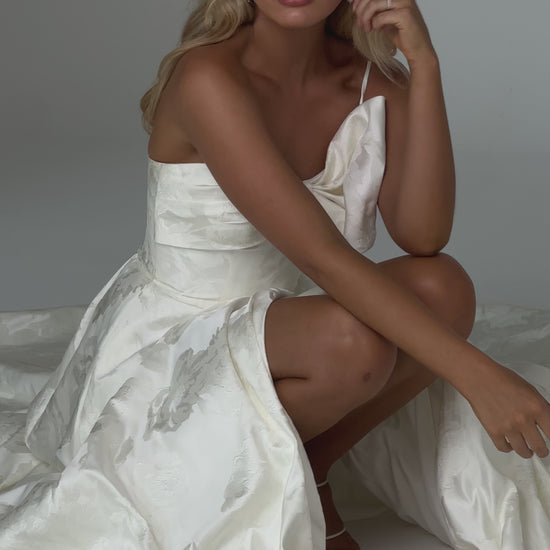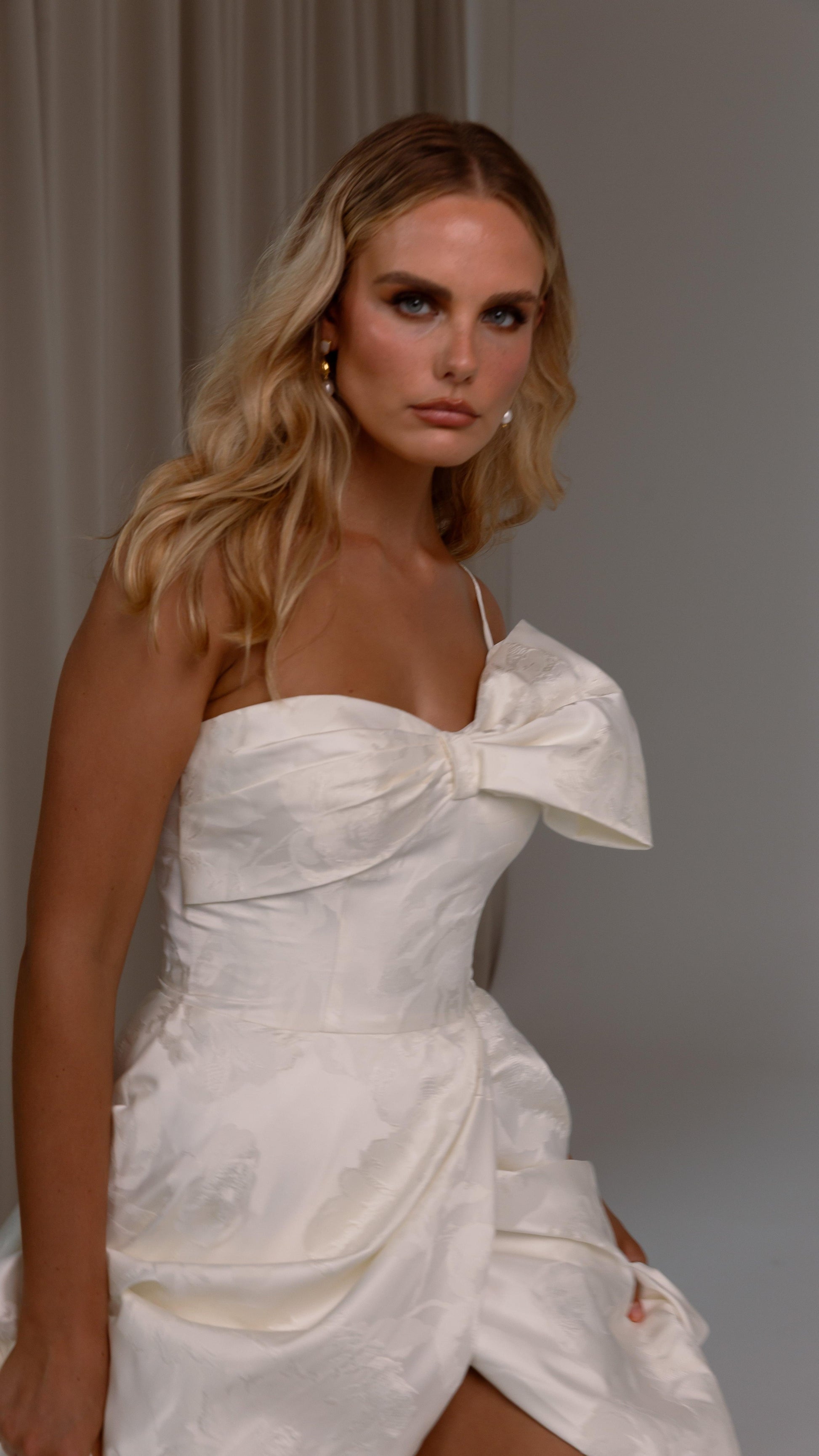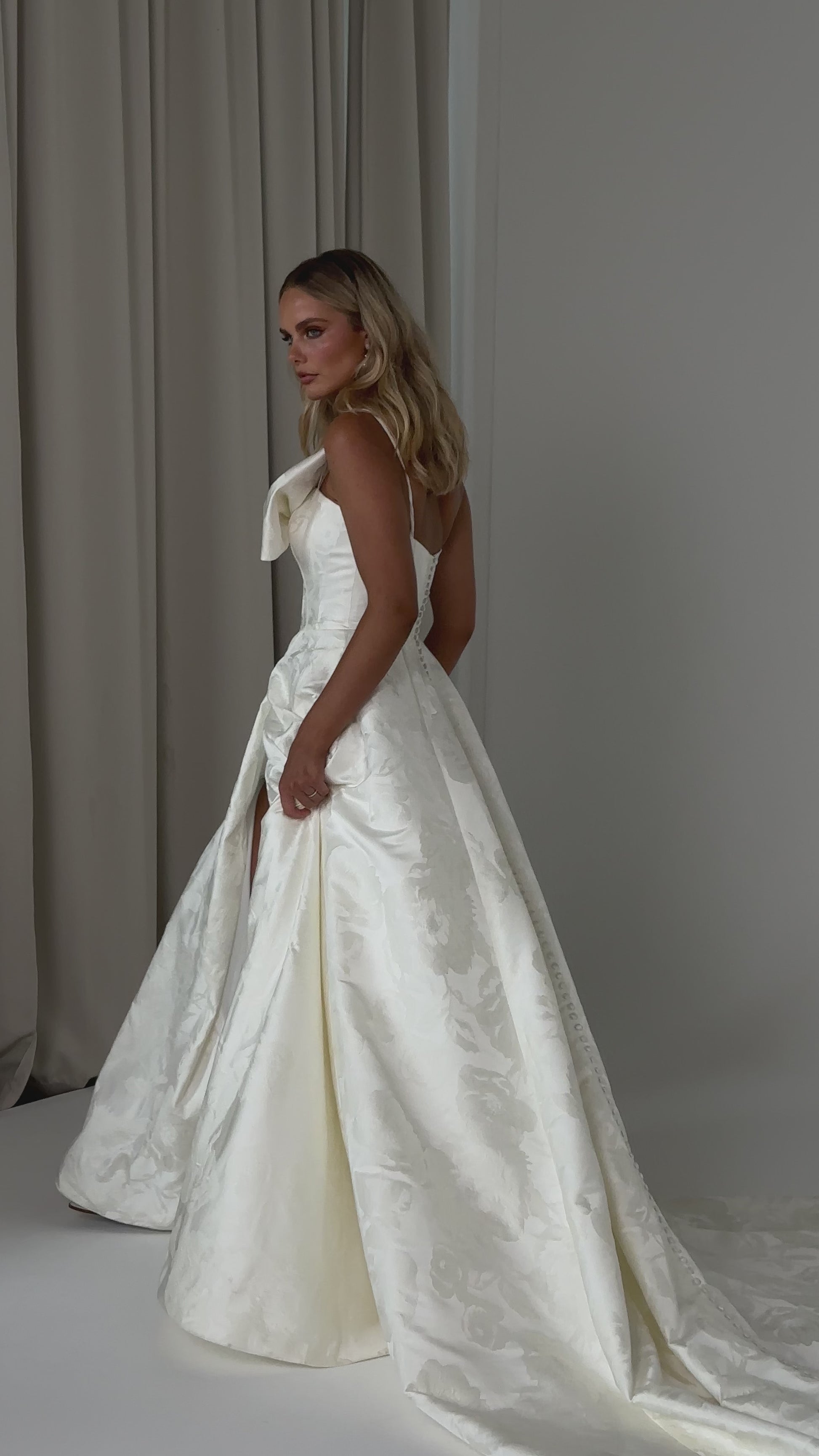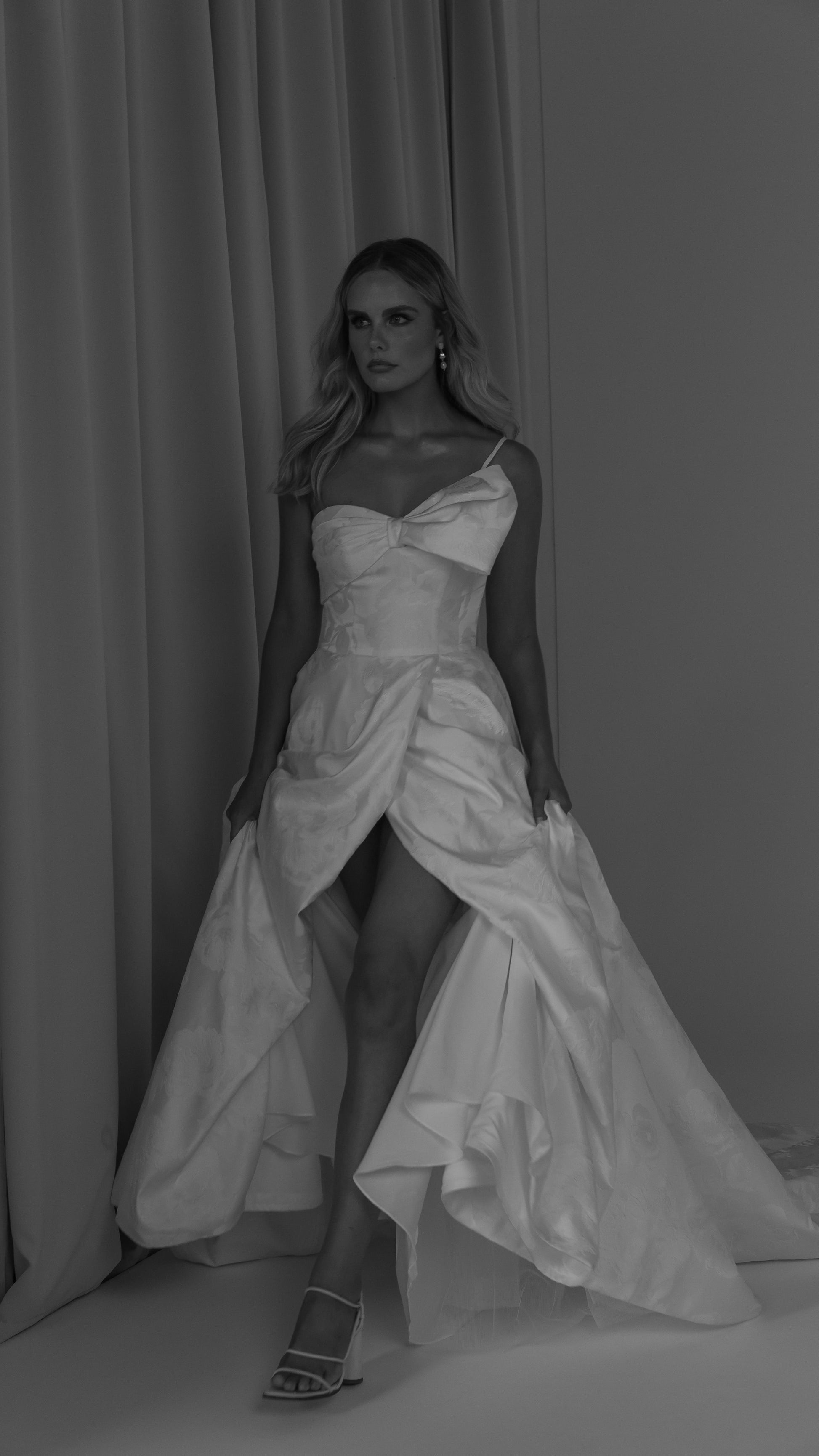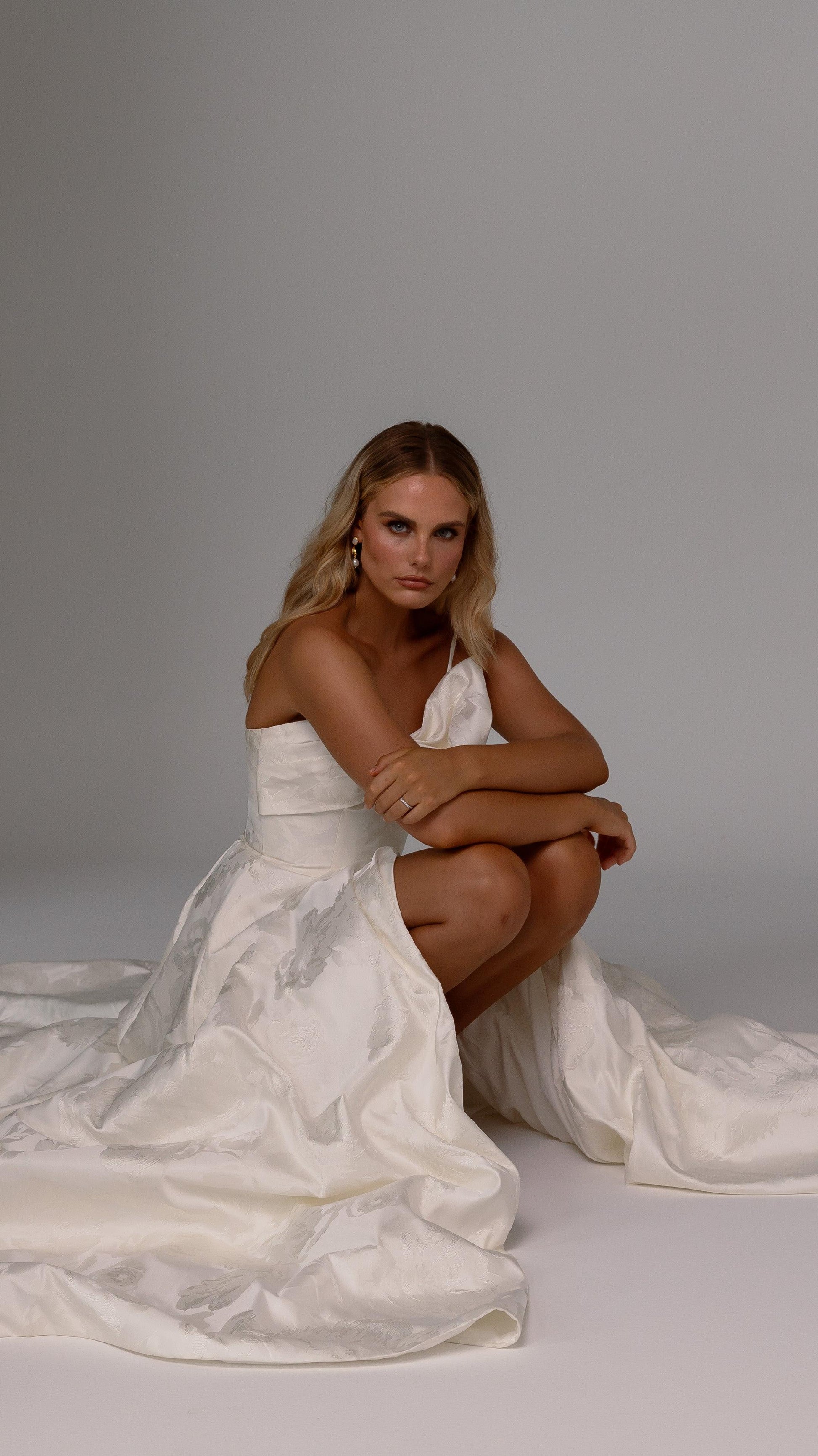 Make a bold yet graceful statement in our Ginger wedding dress by Tania Olsen Designs, designed for the modern bride with a flair for the dramatic. Crafted from luxe jacquard satin, the one-shoulder silhouette is elevated by a sculptural front bow, blending fashion-forward design with timeless sophistication.