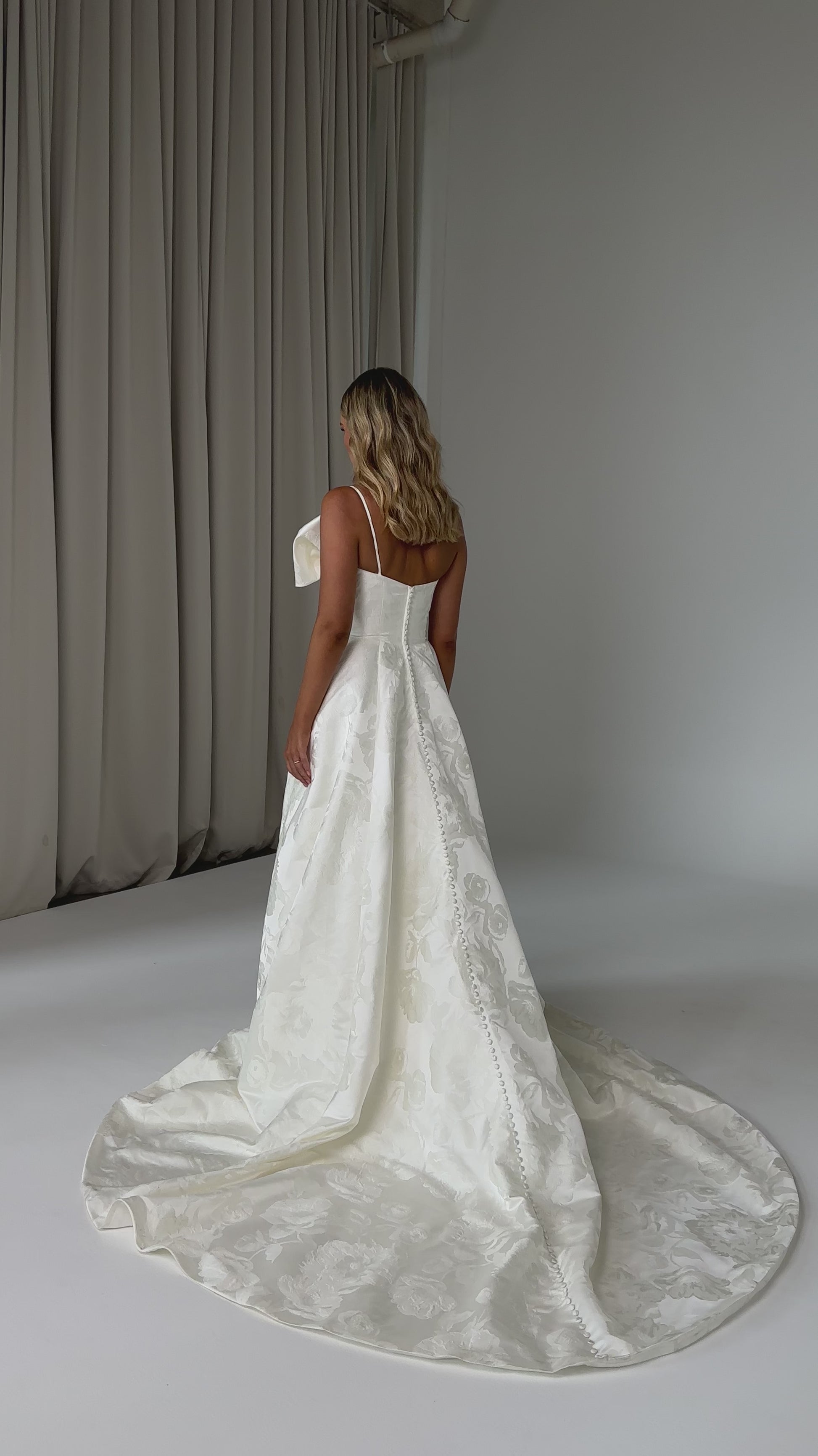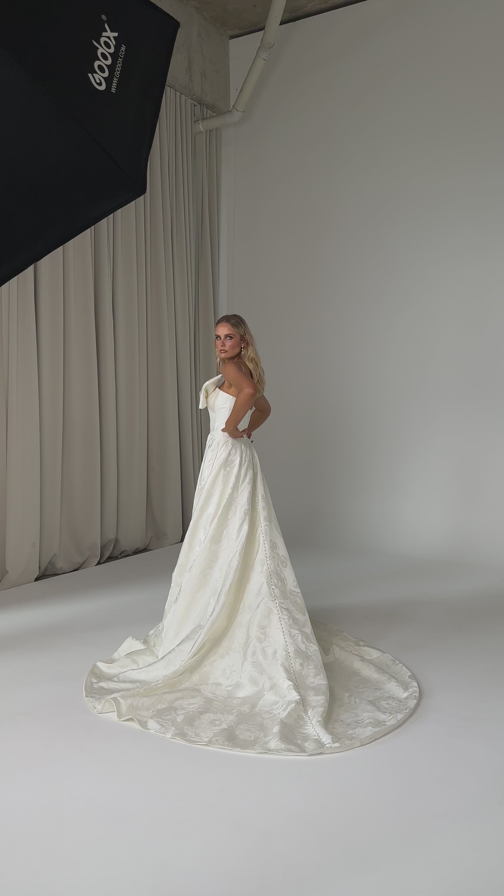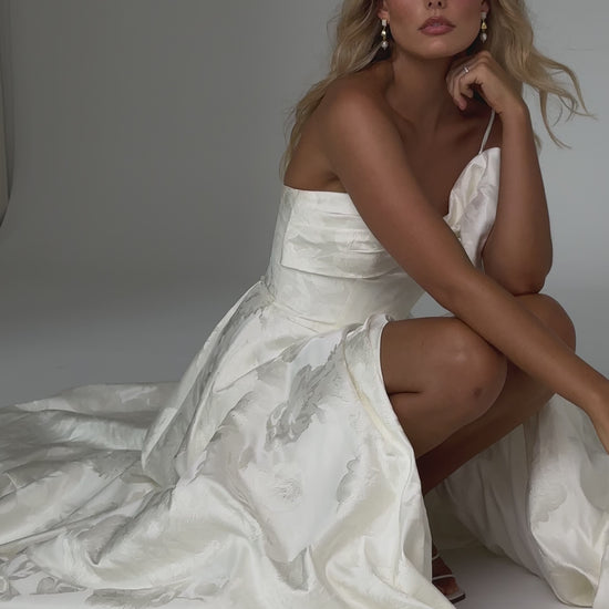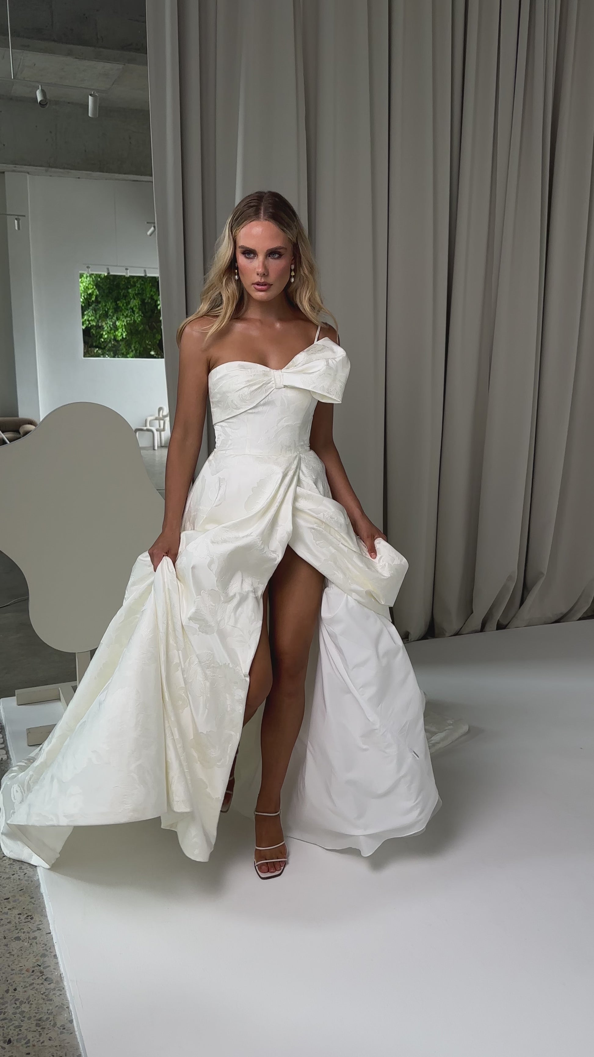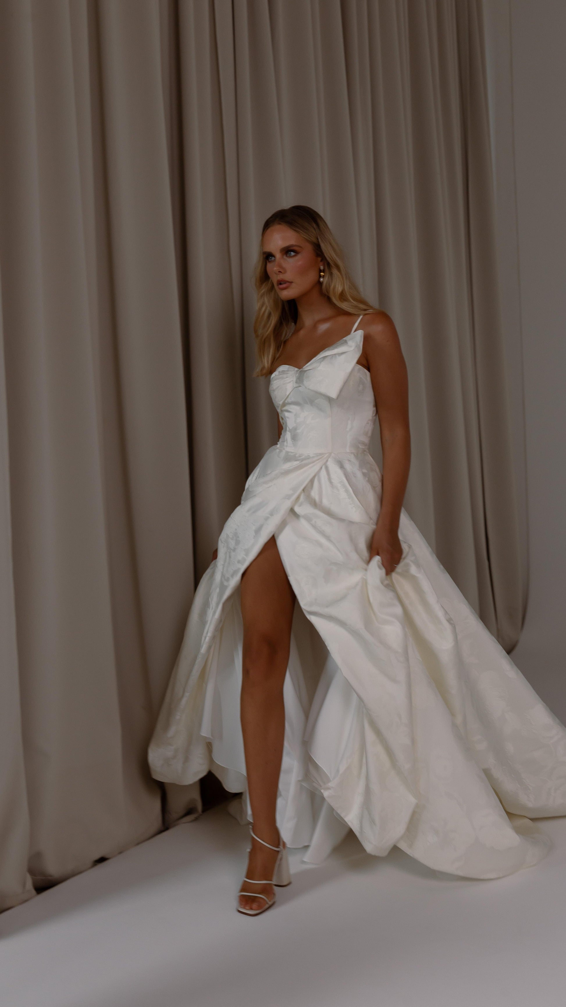 Make a bold yet graceful statement in our Ginger wedding dress by Tania Olsen Designs, designed for the modern bride with a flair for the dramatic. Crafted from luxe jacquard satin, the one-shoulder silhouette is elevated by a sculptural front bow, blending fashion-forward design with timeless sophistication.