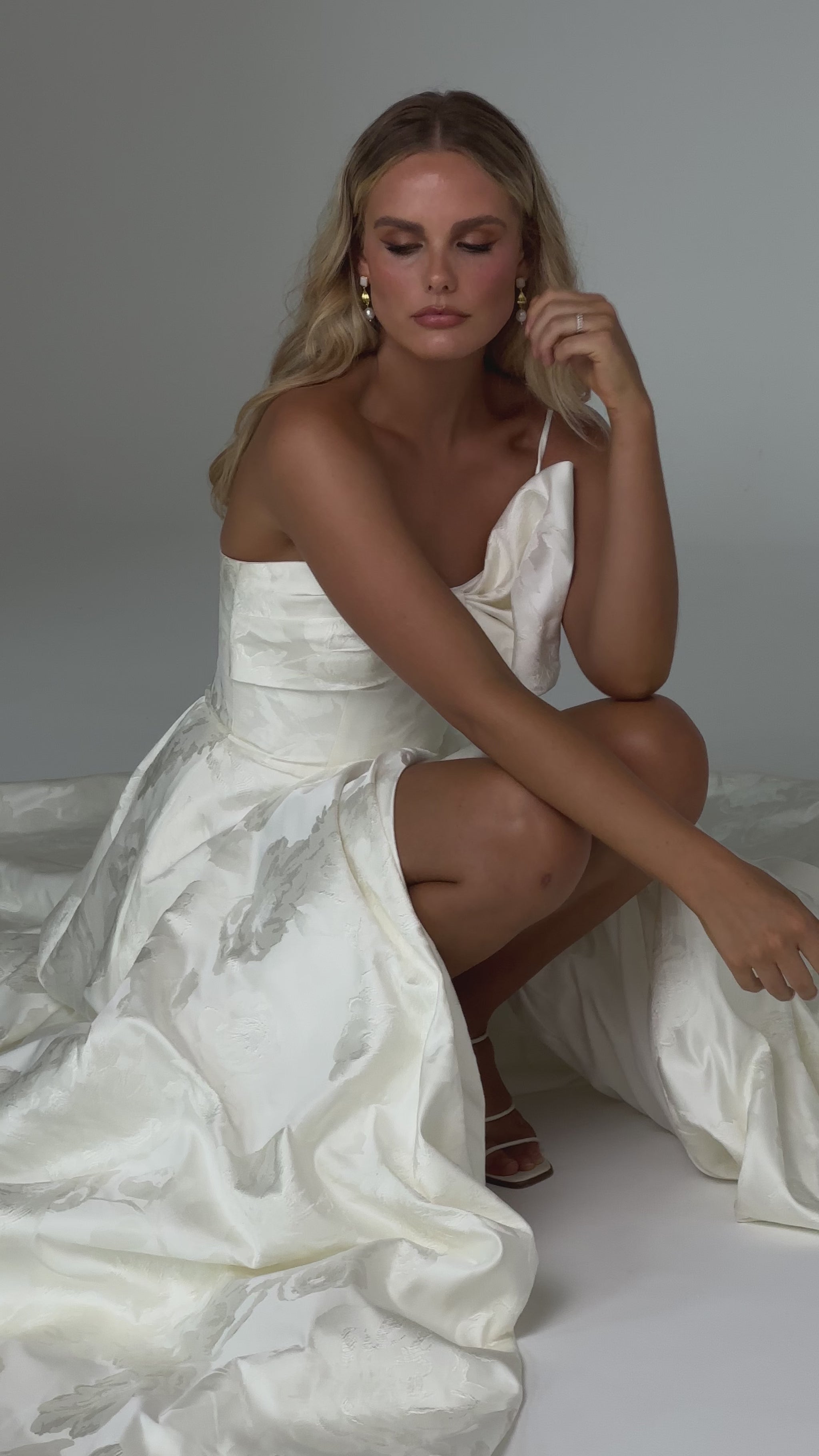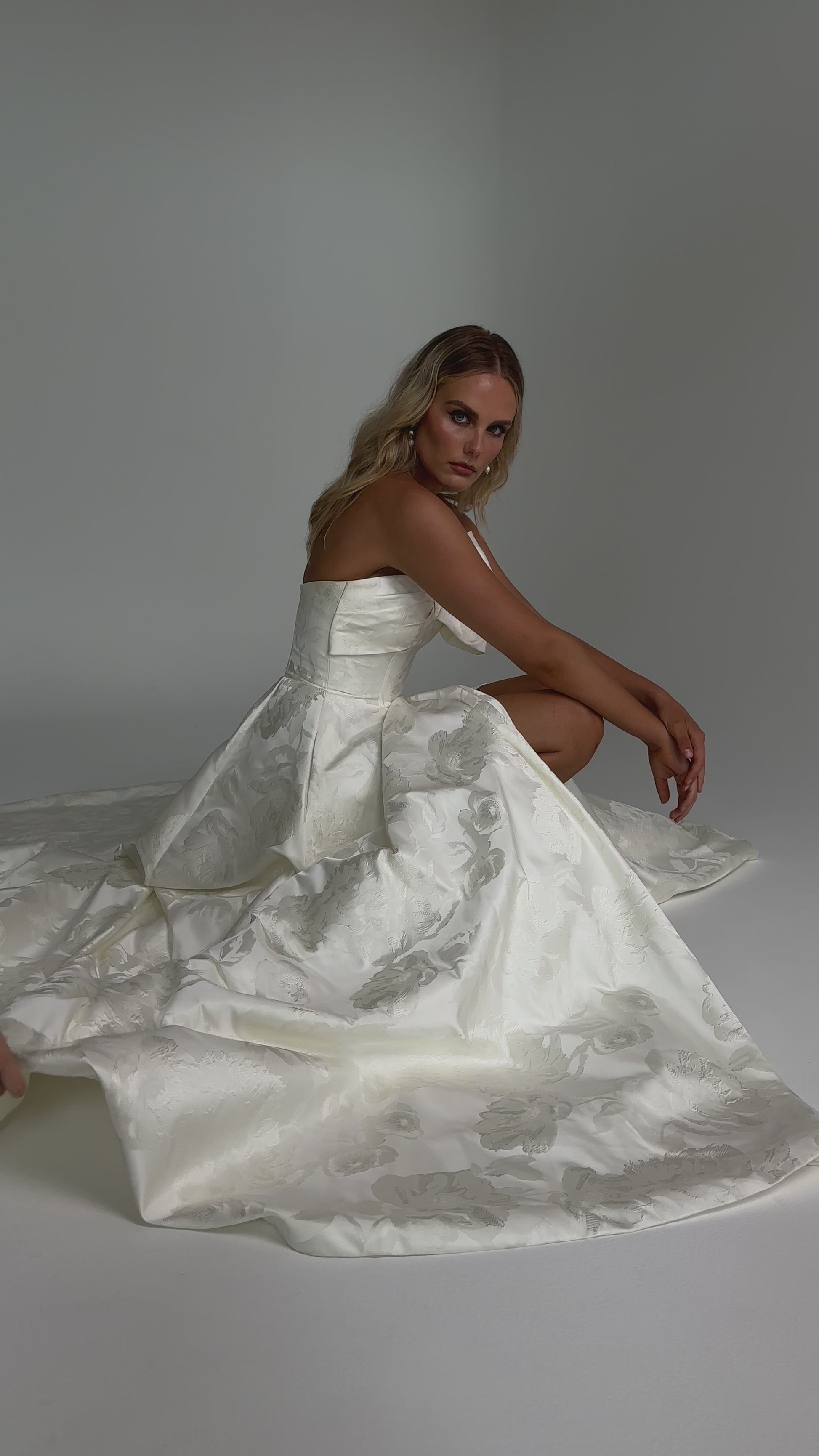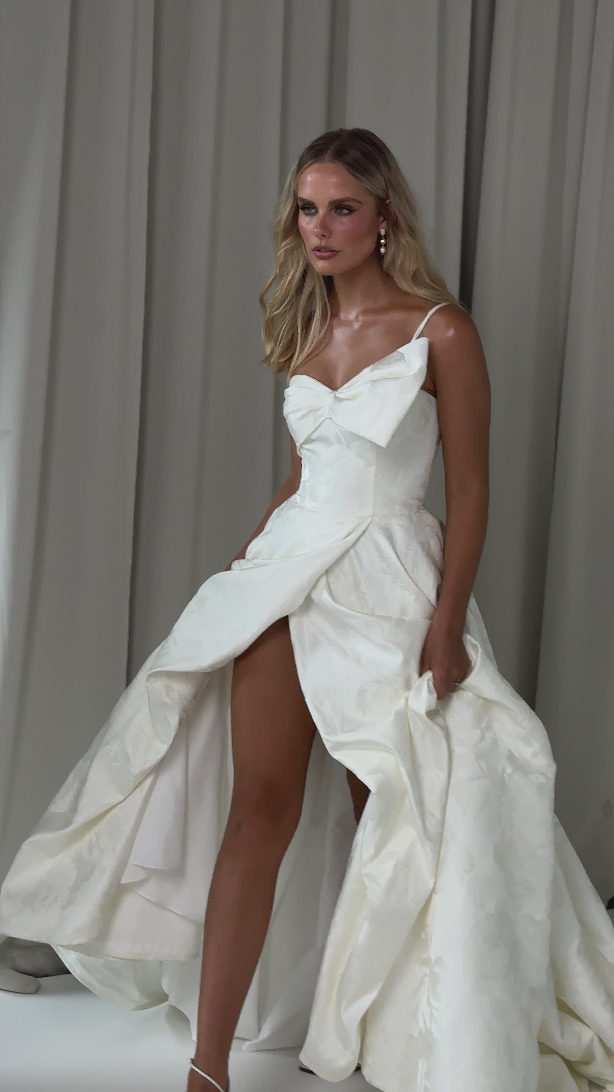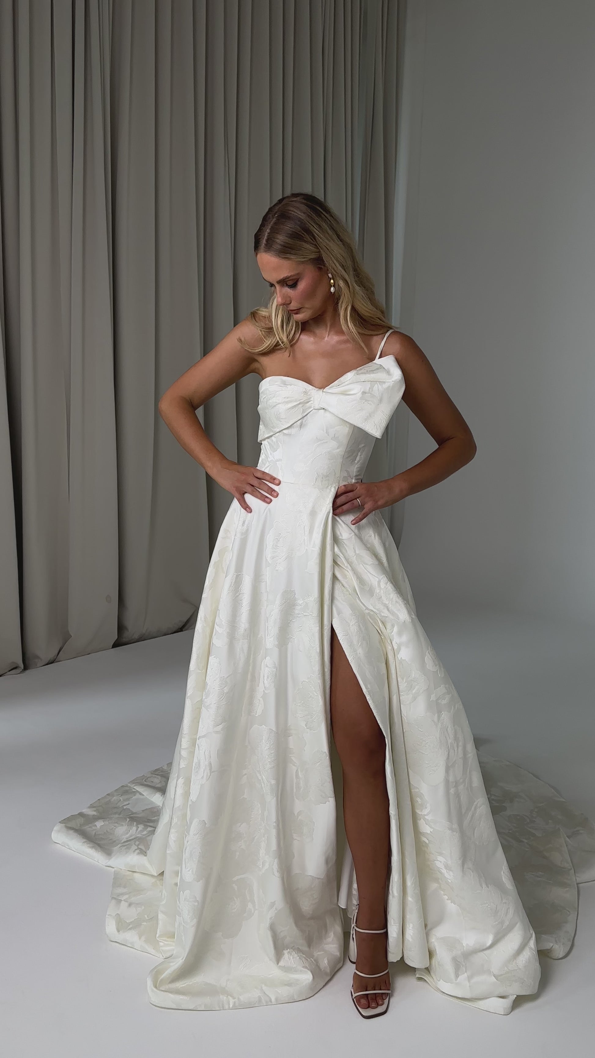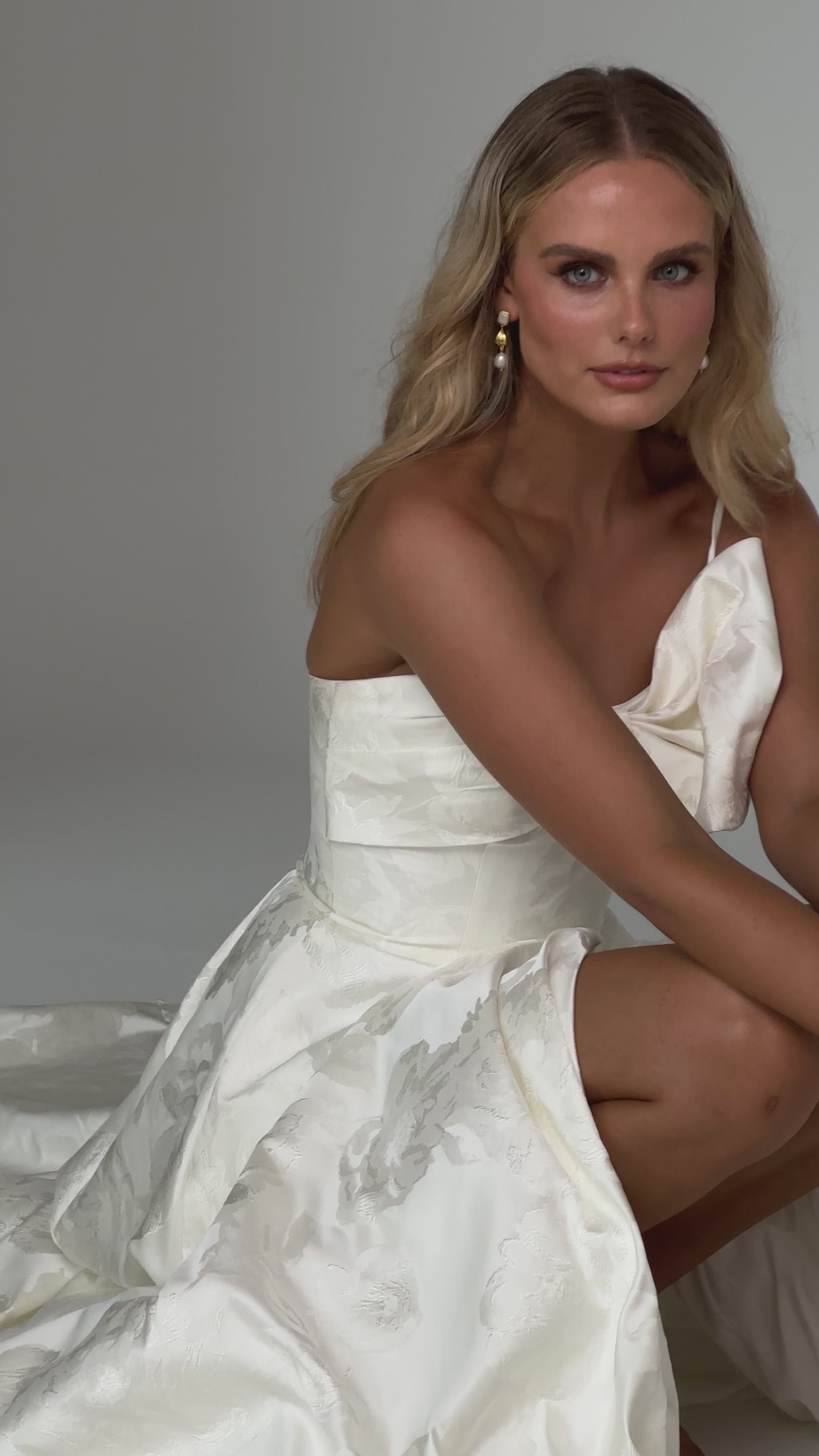 Make a bold yet graceful statement in our Ginger wedding dress by Tania Olsen Designs, designed for the modern bride with a flair for the dramatic. Crafted from luxe jacquard satin, the one-shoulder silhouette is elevated by a sculptural front bow, blending fashion-forward design with timeless sophistication.