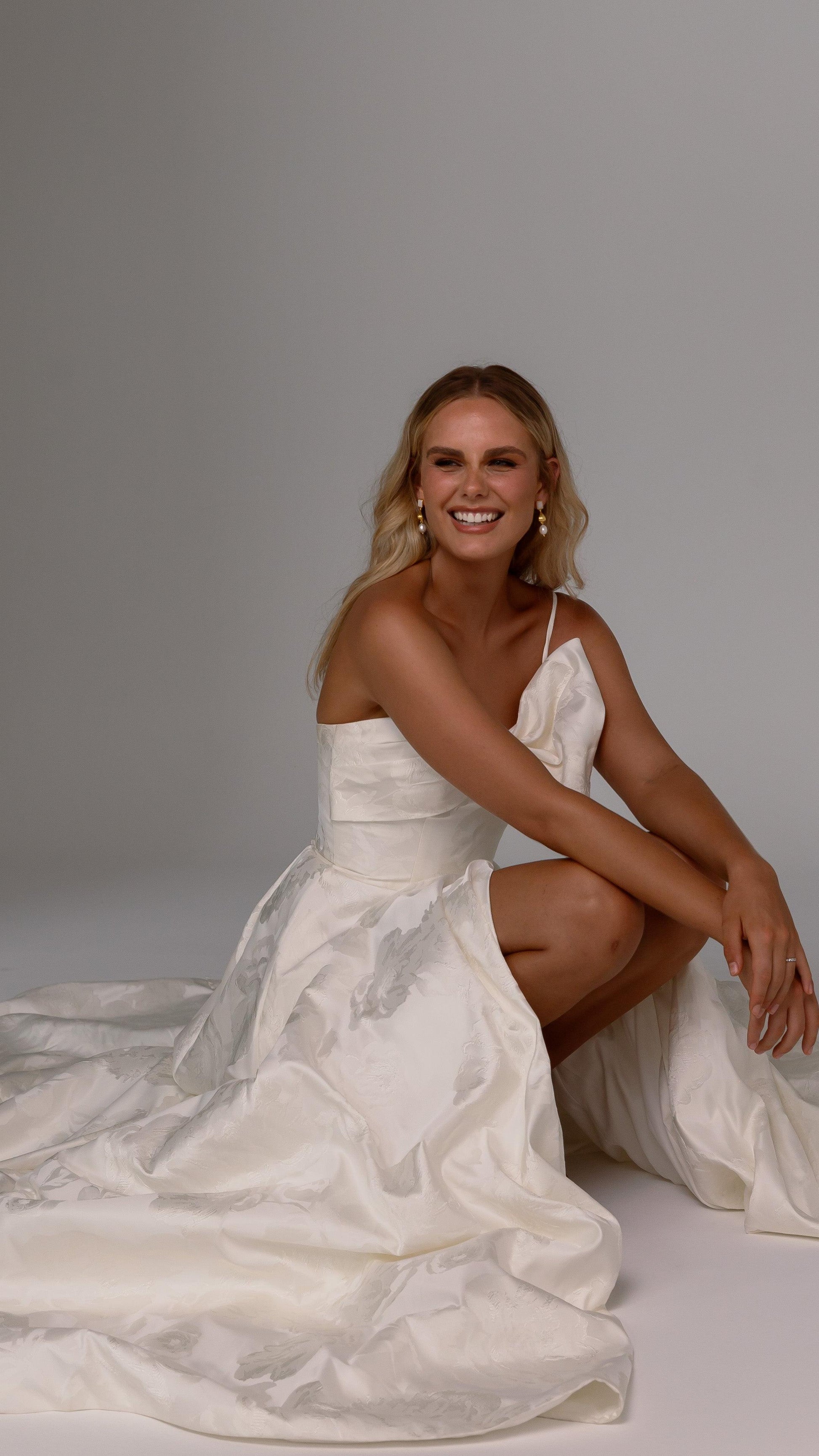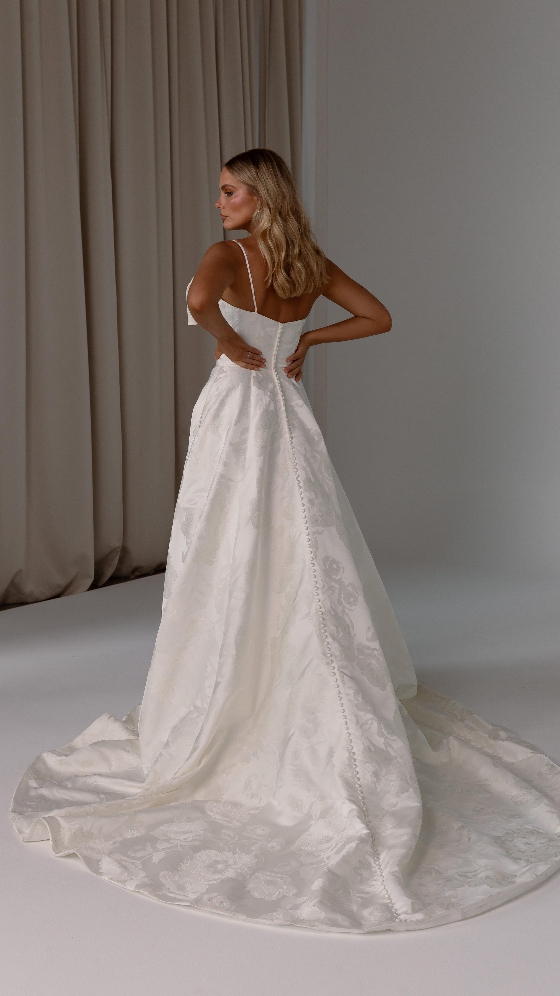 Built-in nude bra cups offer subtle support, while the bodice flows into an A-line skirt with a high-leg front split—adding a touch of allure to the refined structure. A chapel-length train creates beautiful movement down the aisle, and button accents trailing down the centre back lend a classic finish to the invisible zip closure.