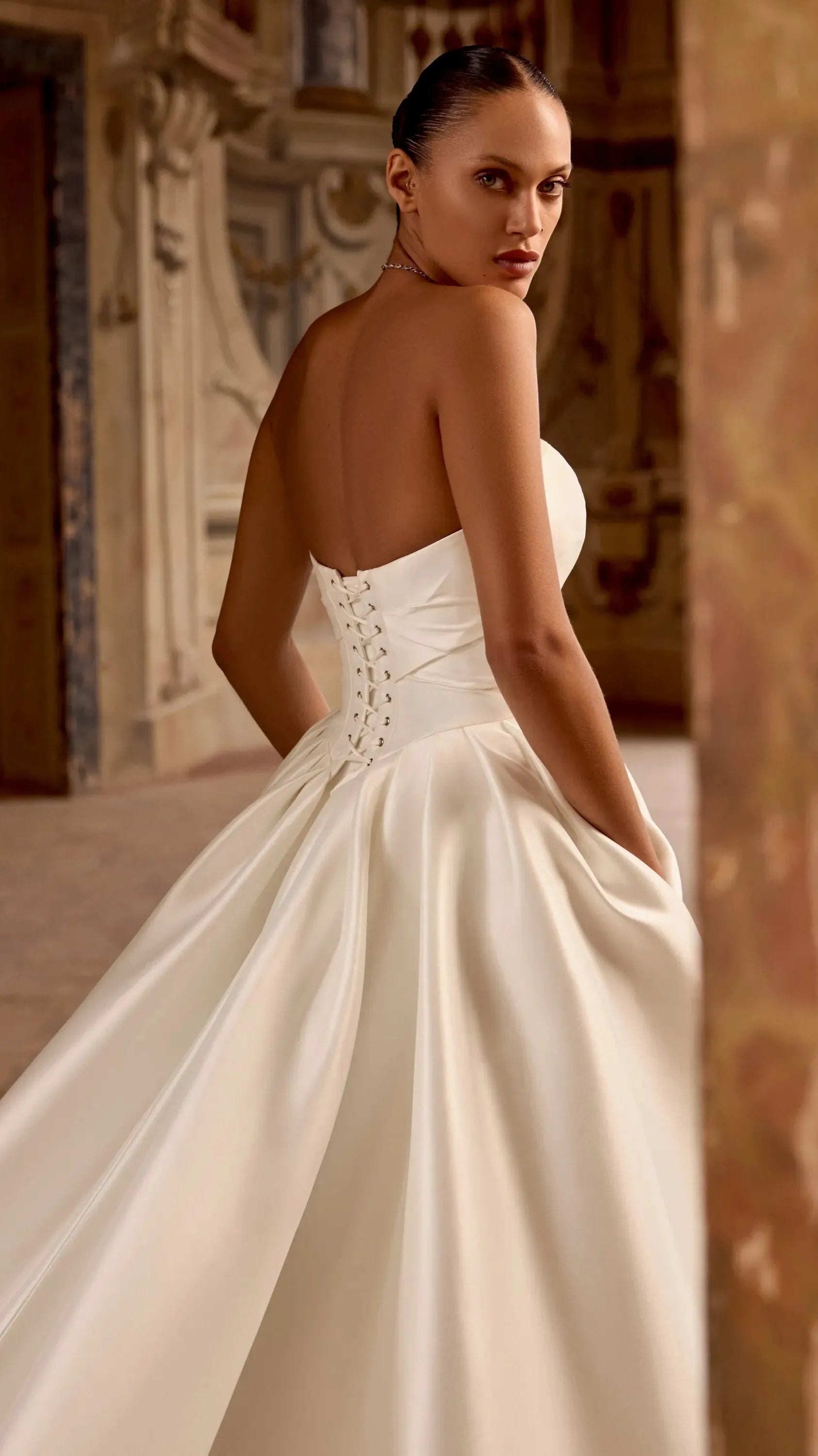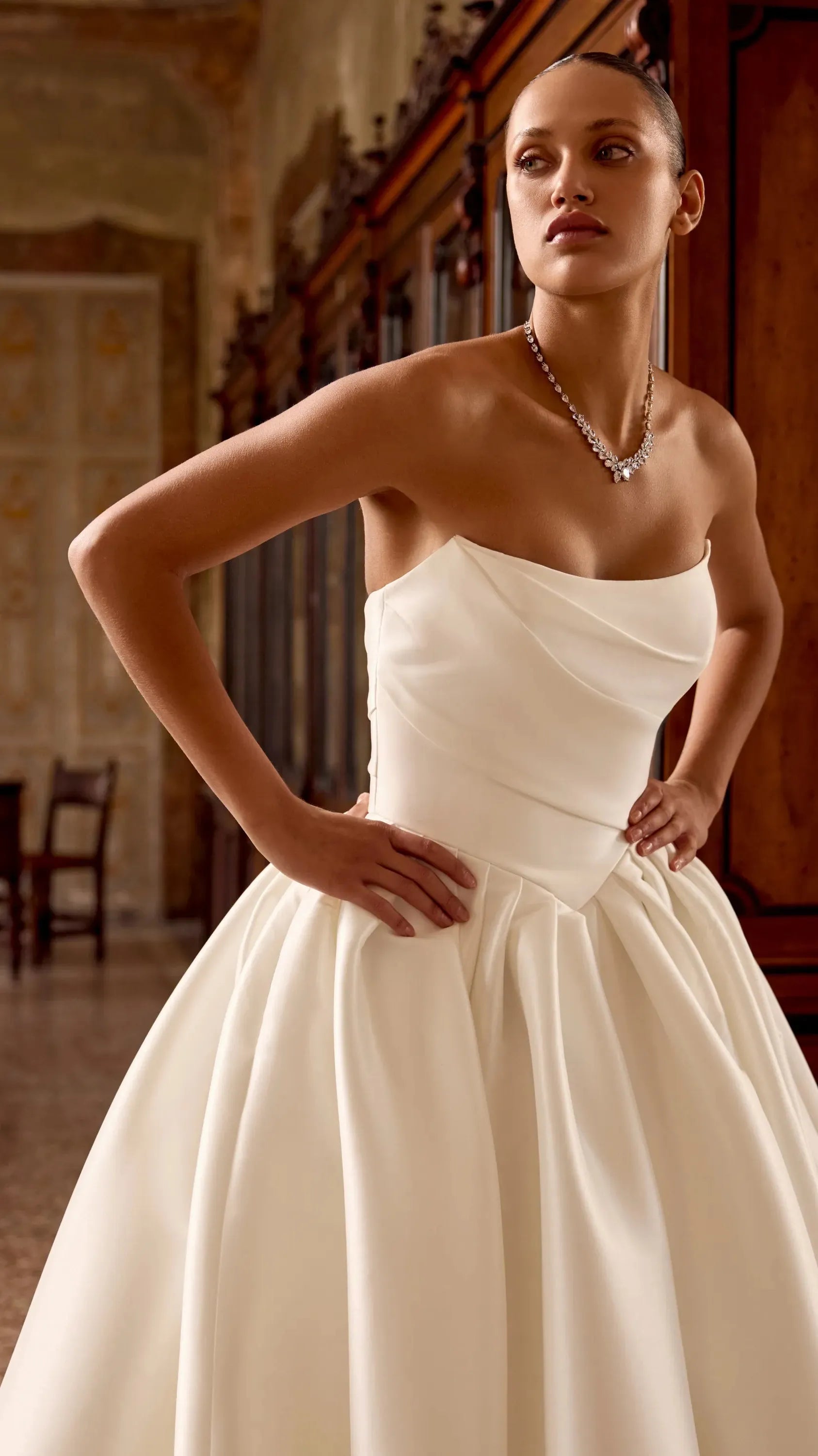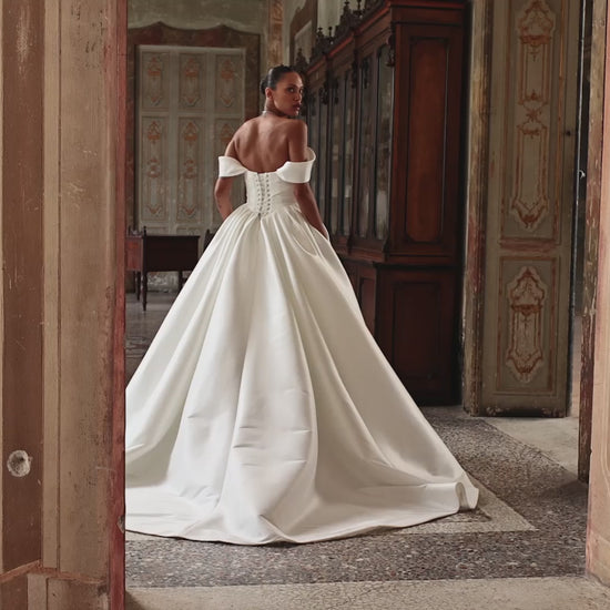 Kelsey - Clean Mikado ball gown with strapless scoop neckline. Bodice features ruching across front and back. Skirt is accented with knife pleating at the basque waistline and includes pockets. Finished with a lace up back with a modesty panel. Complete with a chapel length train. Version with zipper back closure available as 88436Z.