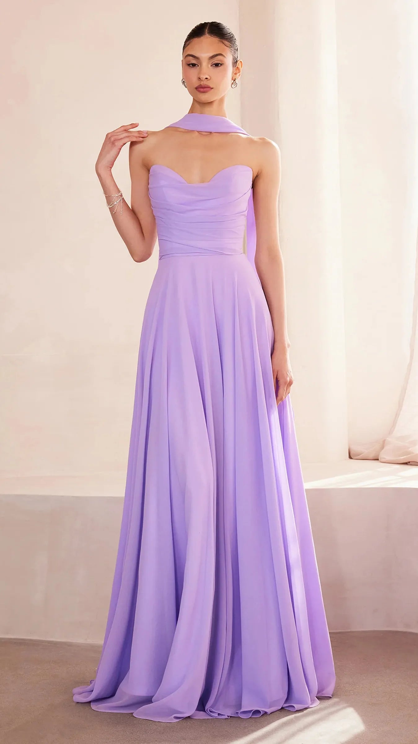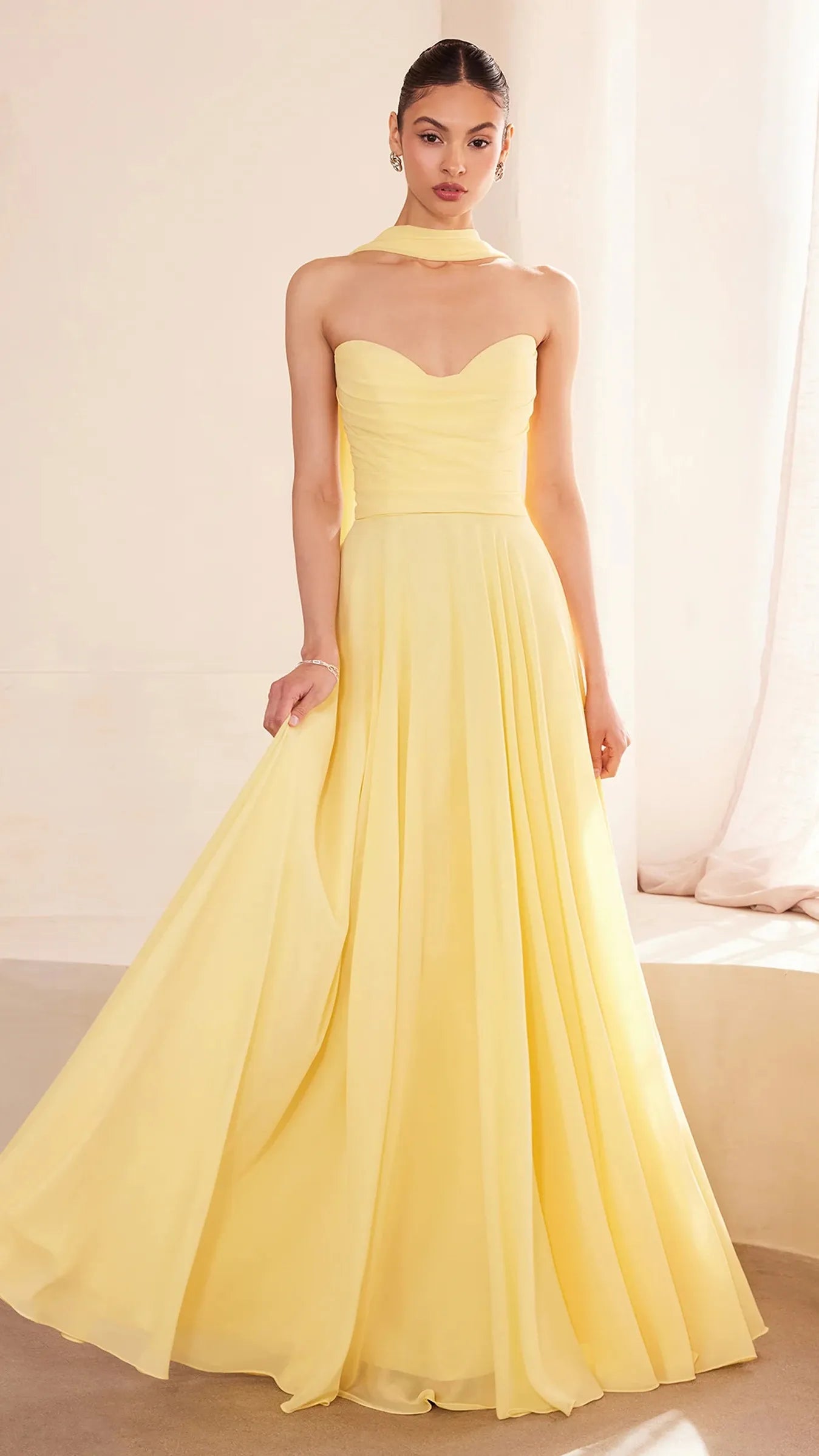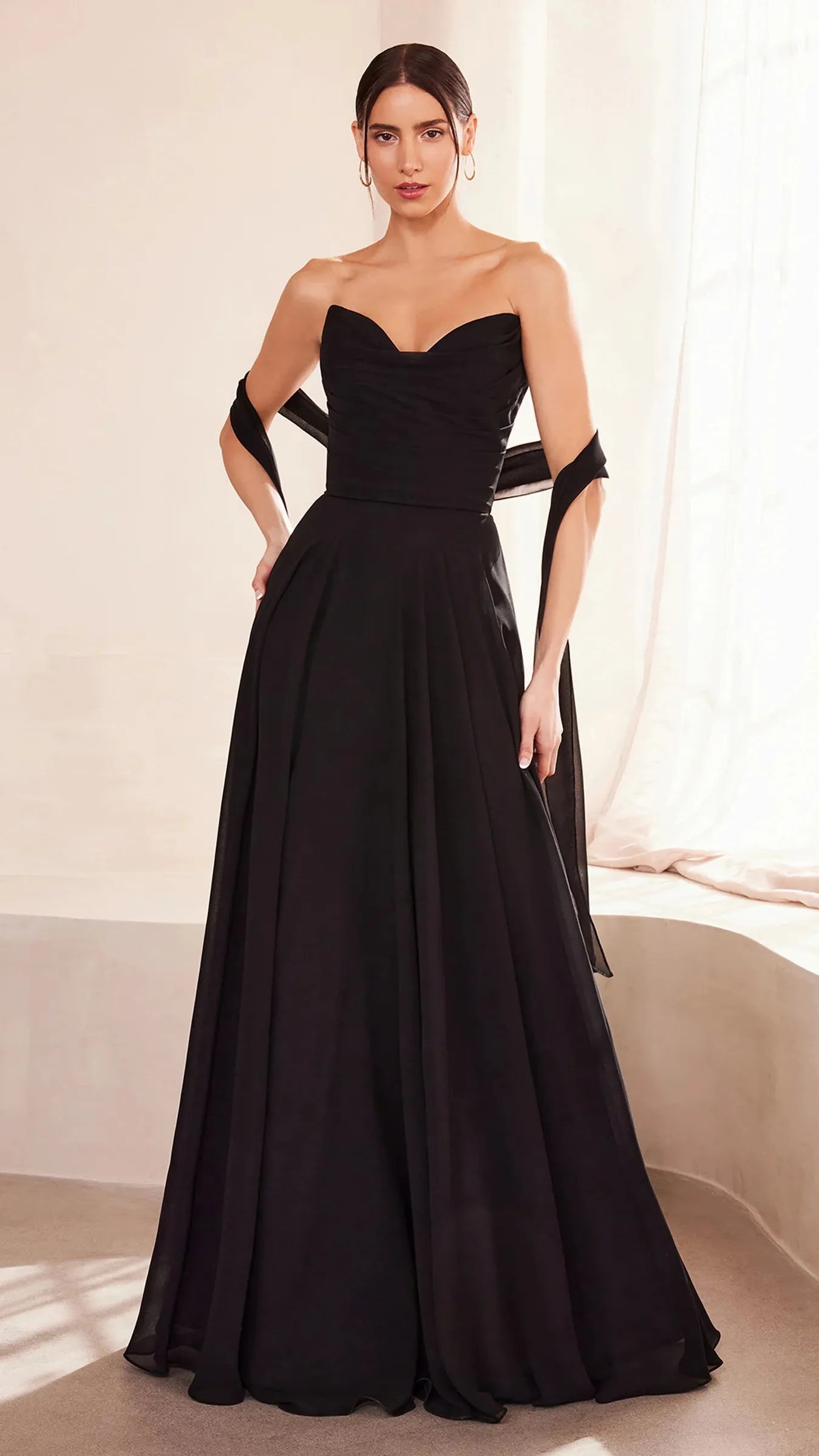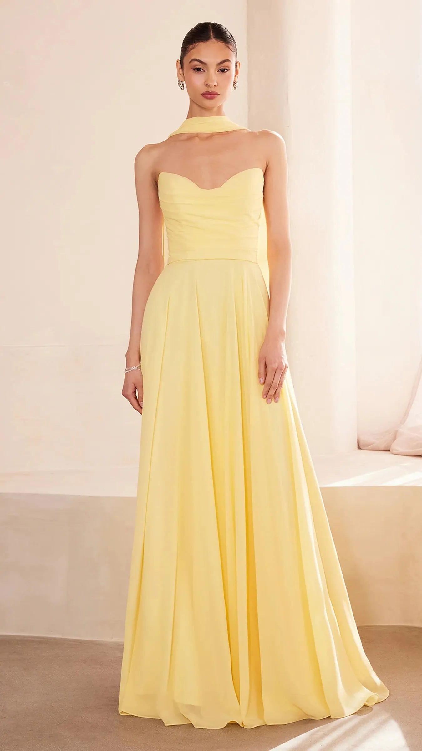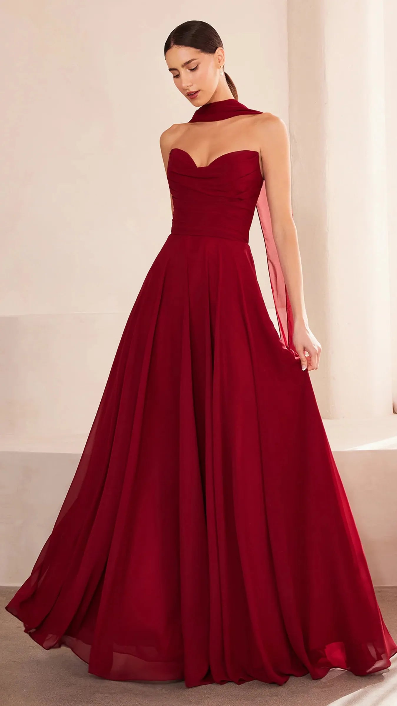 This stunning strapless chiffon gown combines timeless elegance with contemporary design elements. The sweetheart neckline beautifully frames the décolletage, adding a soft, romantic touch to the silhouette. Draping around the bodice enhances the gown's figure flattering fit, creating a graceful and refined look. The back bodice is a lace up corset, allowing for a customizable, secure fit that ensures comfort and style. A matching removable chiffon scarf is included, which can be draped around the shoulders or styled in various ways, offering added versatility and sophistication. Perfect for wedding guests, black-tie event, simple prom look, or any formal occasion, this gown is a showstopper that will make you feel confident and elegant.