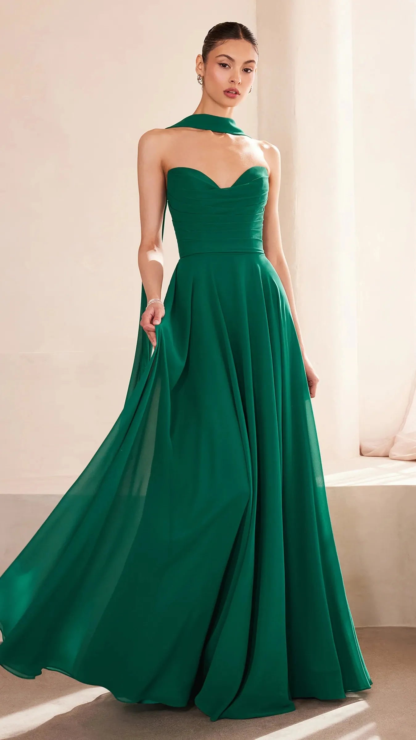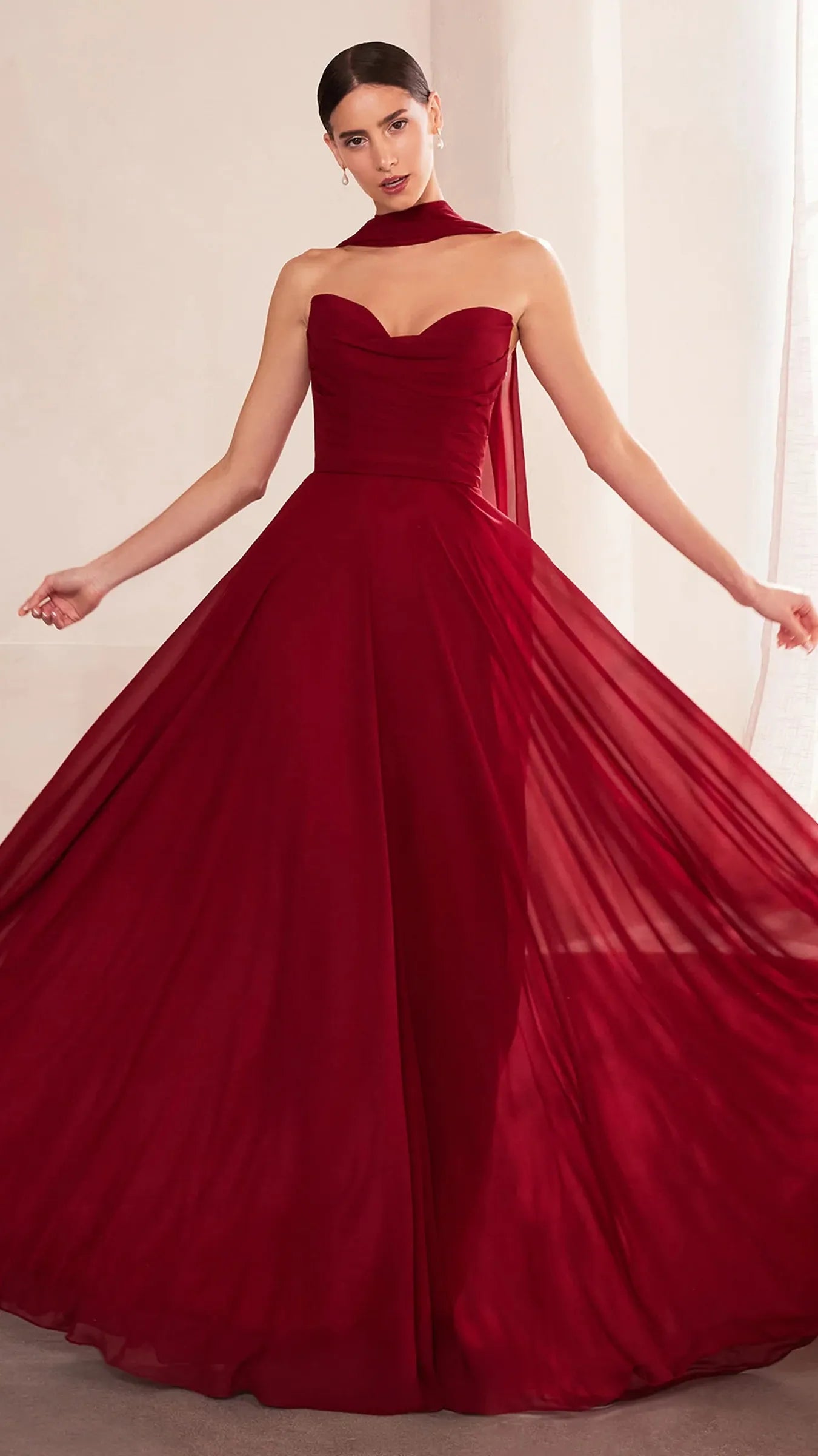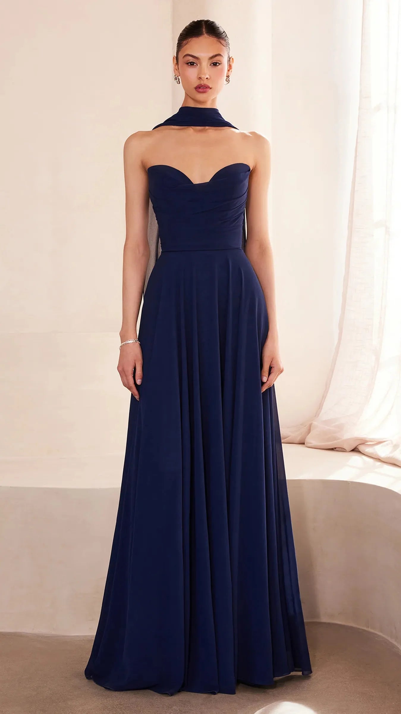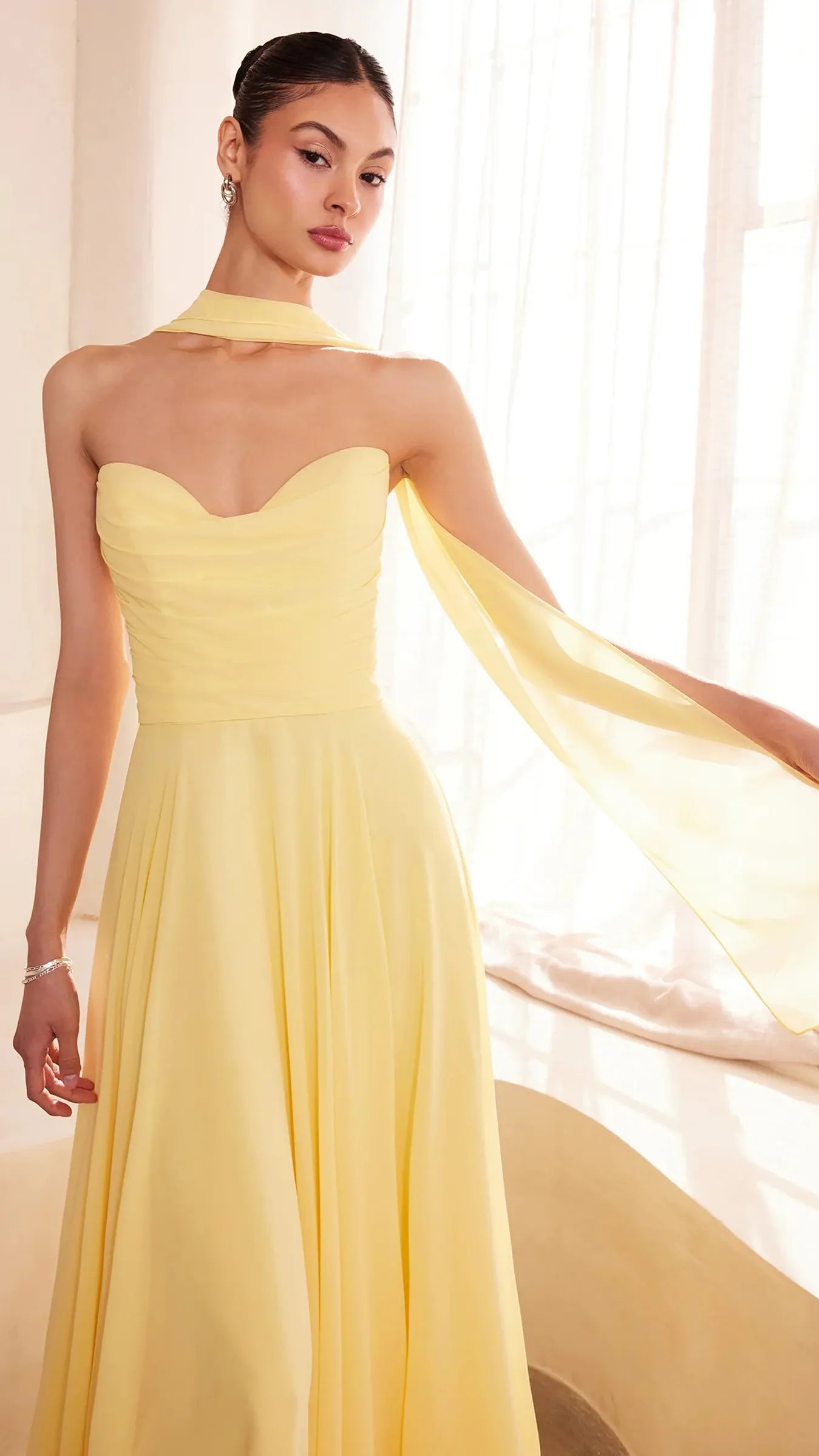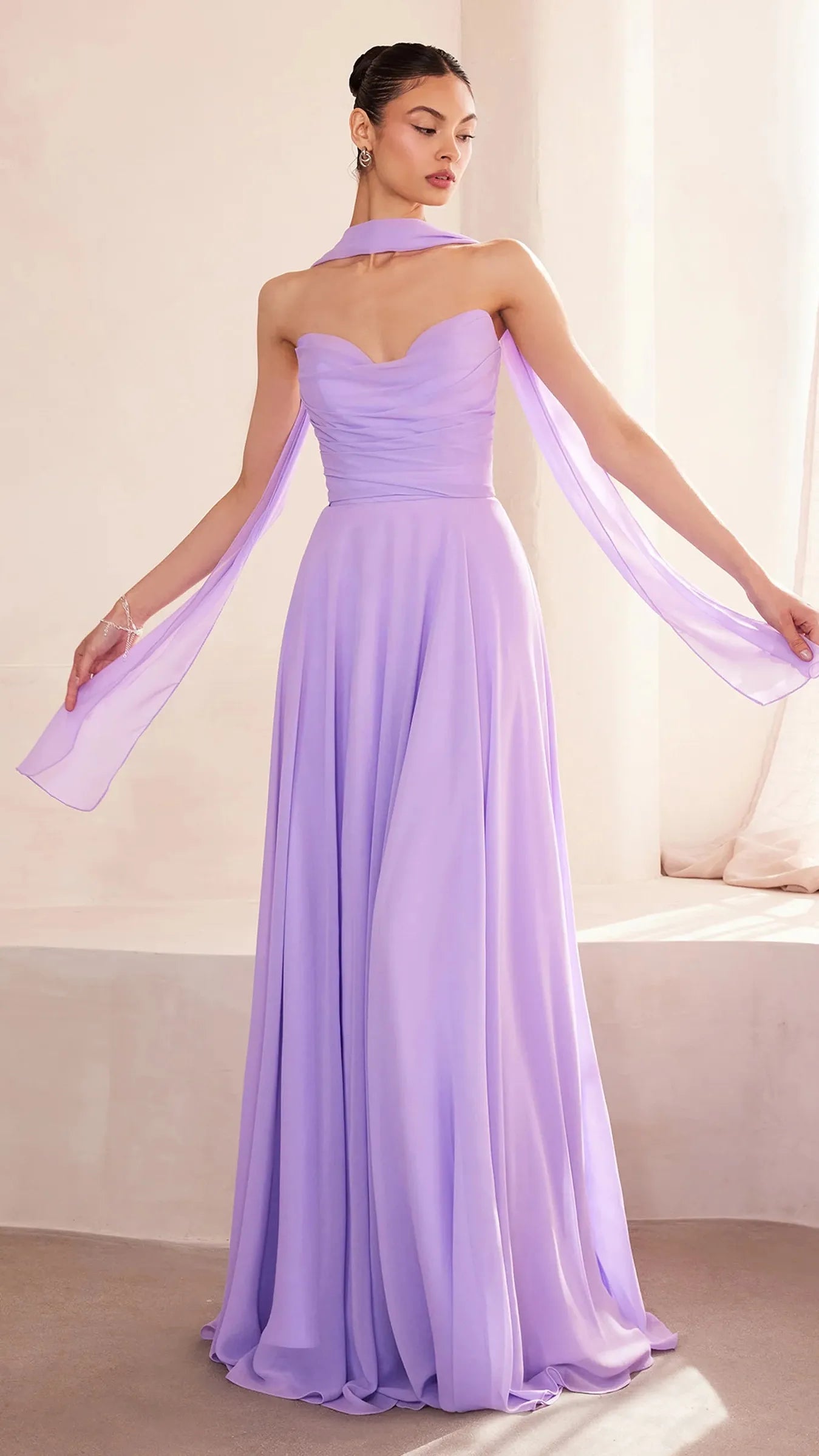 This stunning strapless chiffon gown combines timeless elegance with contemporary design elements. The sweetheart neckline beautifully frames the décolletage, adding a soft, romantic touch to the silhouette. Draping around the bodice enhances the gown's figure flattering fit, creating a graceful and refined look. The back bodice is a lace up corset, allowing for a customizable, secure fit that ensures comfort and style. A matching removable chiffon scarf is included, which can be draped around the shoulders or styled in various ways, offering added versatility and sophistication. Perfect for wedding guests, black-tie event, simple prom look, or any formal occasion, this gown is a showstopper that will make you feel confident and elegant.