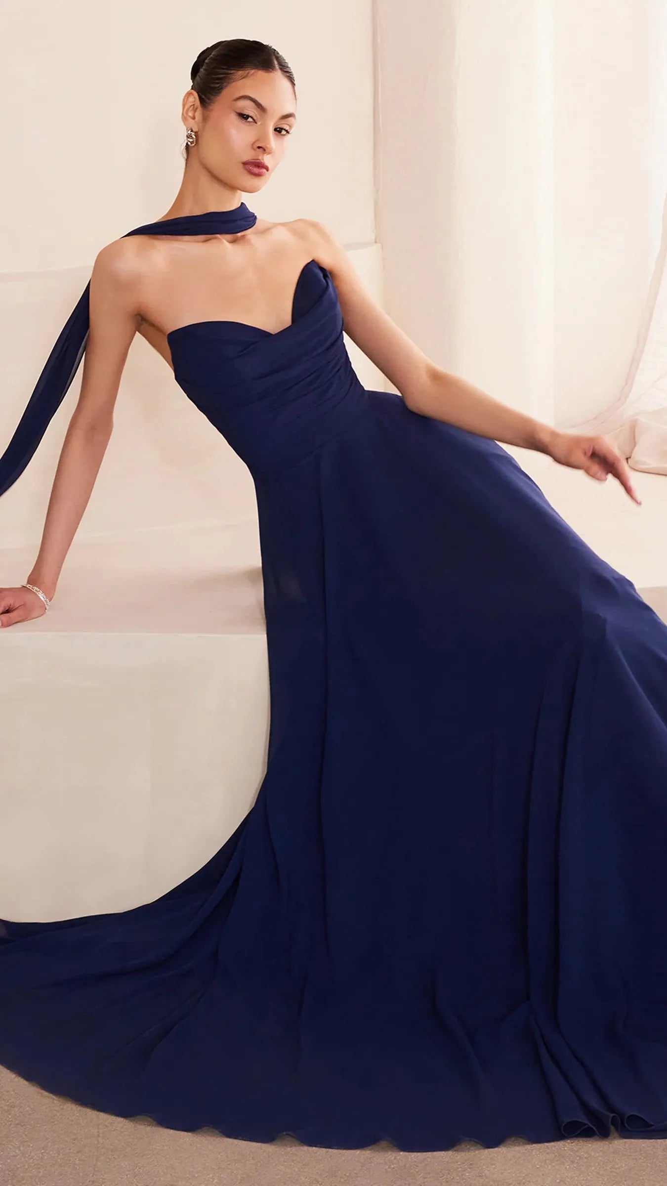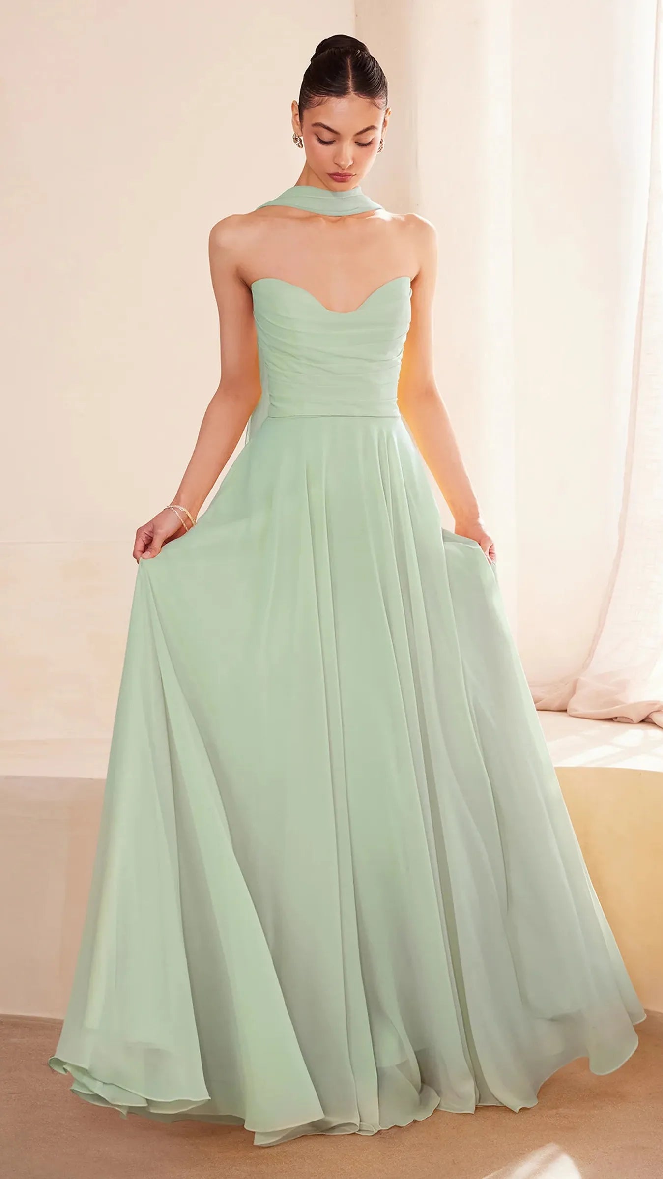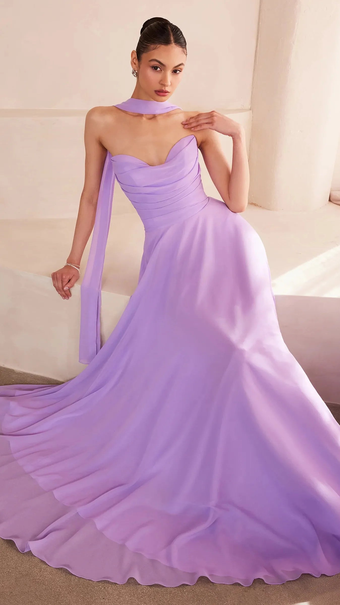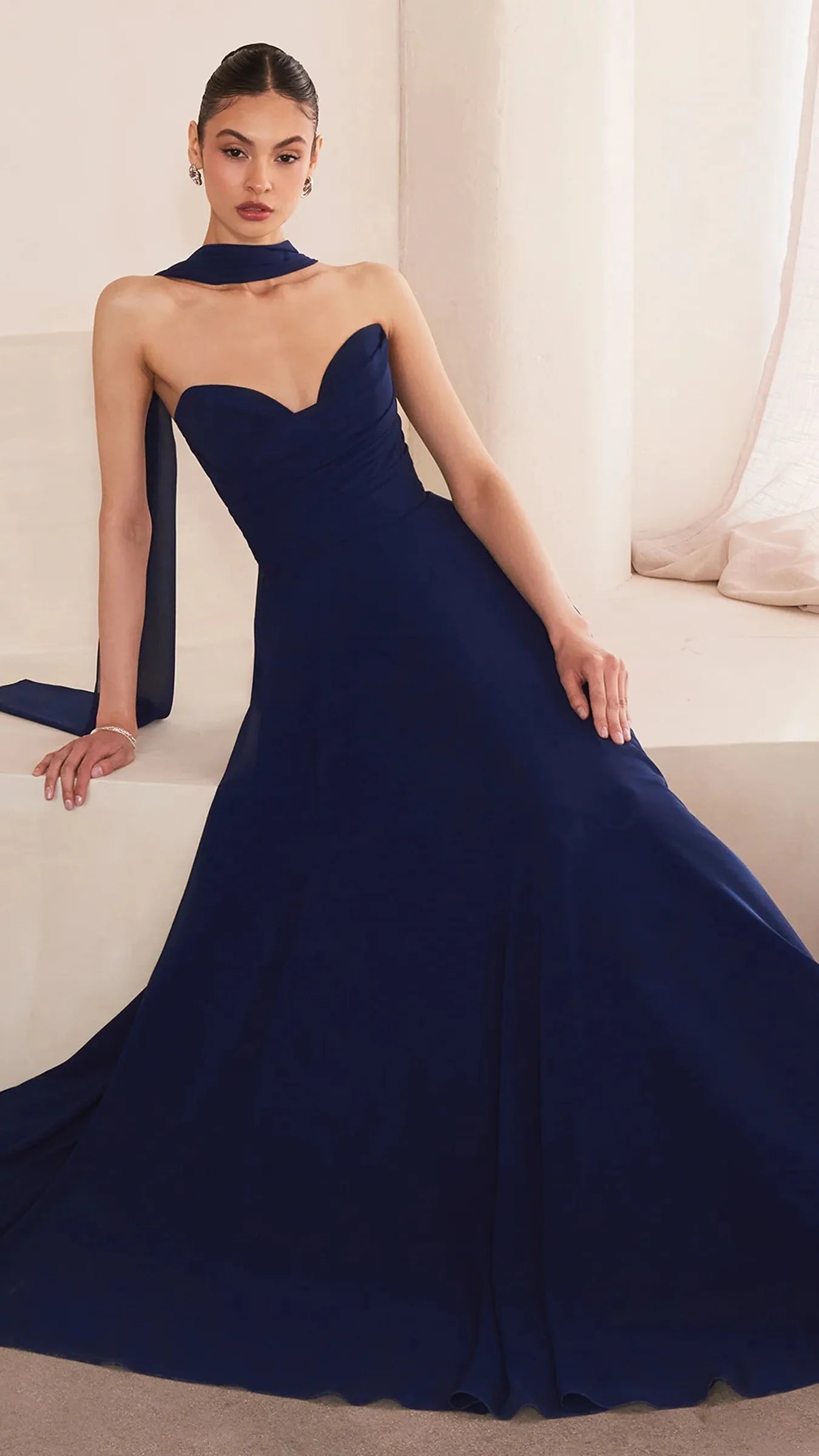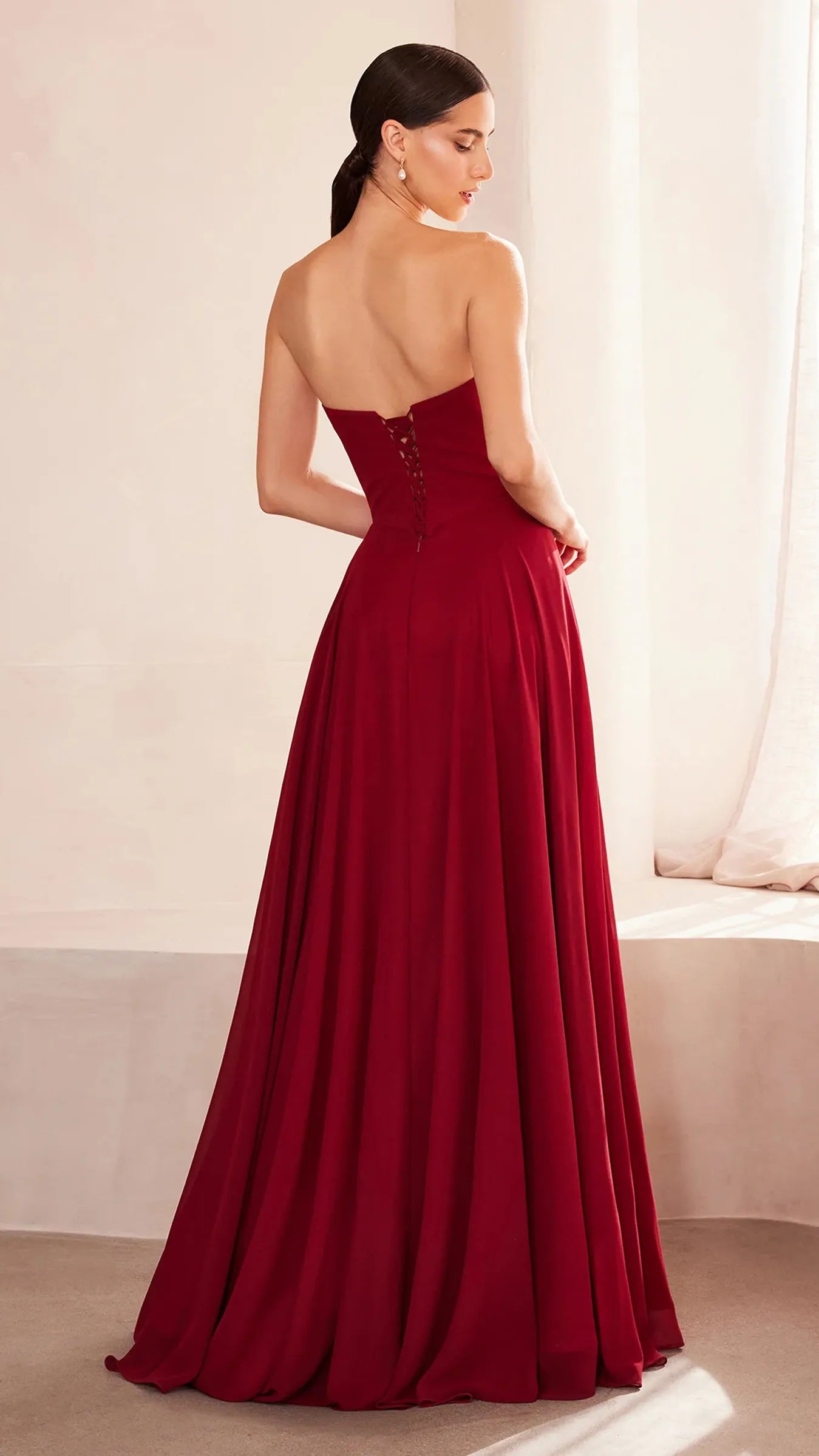 This stunning strapless chiffon gown combines timeless elegance with contemporary design elements. The sweetheart neckline beautifully frames the décolletage, adding a soft, romantic touch to the silhouette. Draping around the bodice enhances the gown's figure flattering fit, creating a graceful and refined look. The back bodice is a lace up corset, allowing for a customizable, secure fit that ensures comfort and style. A matching removable chiffon scarf is included, which can be draped around the shoulders or styled in various ways, offering added versatility and sophistication. Perfect for wedding guests, black-tie event, simple prom look, or any formal occasion, this gown is a showstopper that will make you feel confident and elegant.