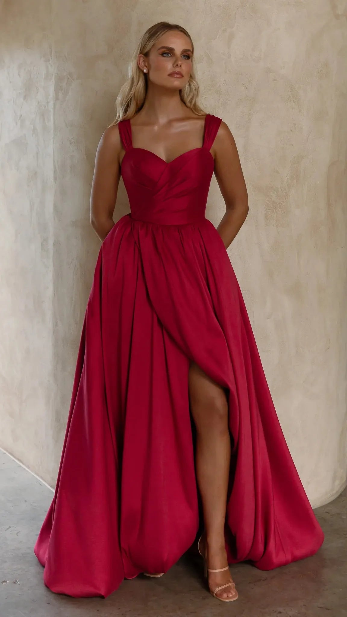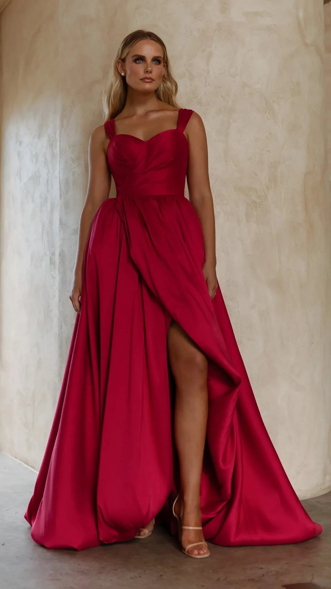 Exuding timeless elegance, our Lyla Formal Dress is crafted from sumptuous brushed Mikado that gives structure and a subtle sheen. The sweetheart neckline and wide, supportive straps create a graceful, feminine silhouette while ensuring comfort. Flowing into a voluminous A-line skirt, the design is elevated by a daring front split that adds movement and a touch of modern allure. Finished with a sleek zip closure at the back, this gown is the perfect balance of romance and refined sophistication.