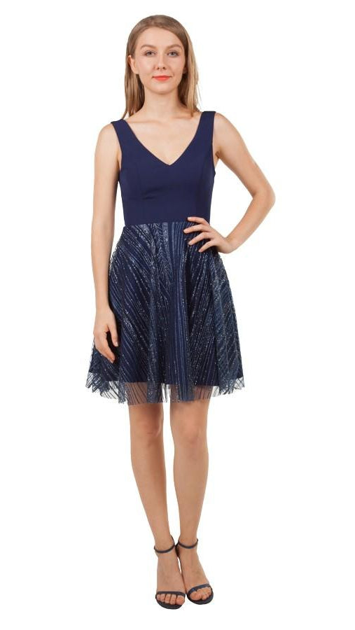 This stunning above the knee cocktail dress with V neckline and A-line silhouette, featuring a fitted bodice and patterned glitter tulle skirt overlay. Made in a spandex polyester fabric.