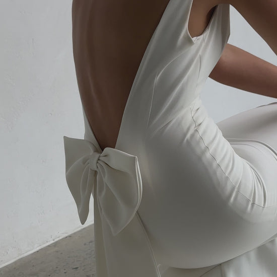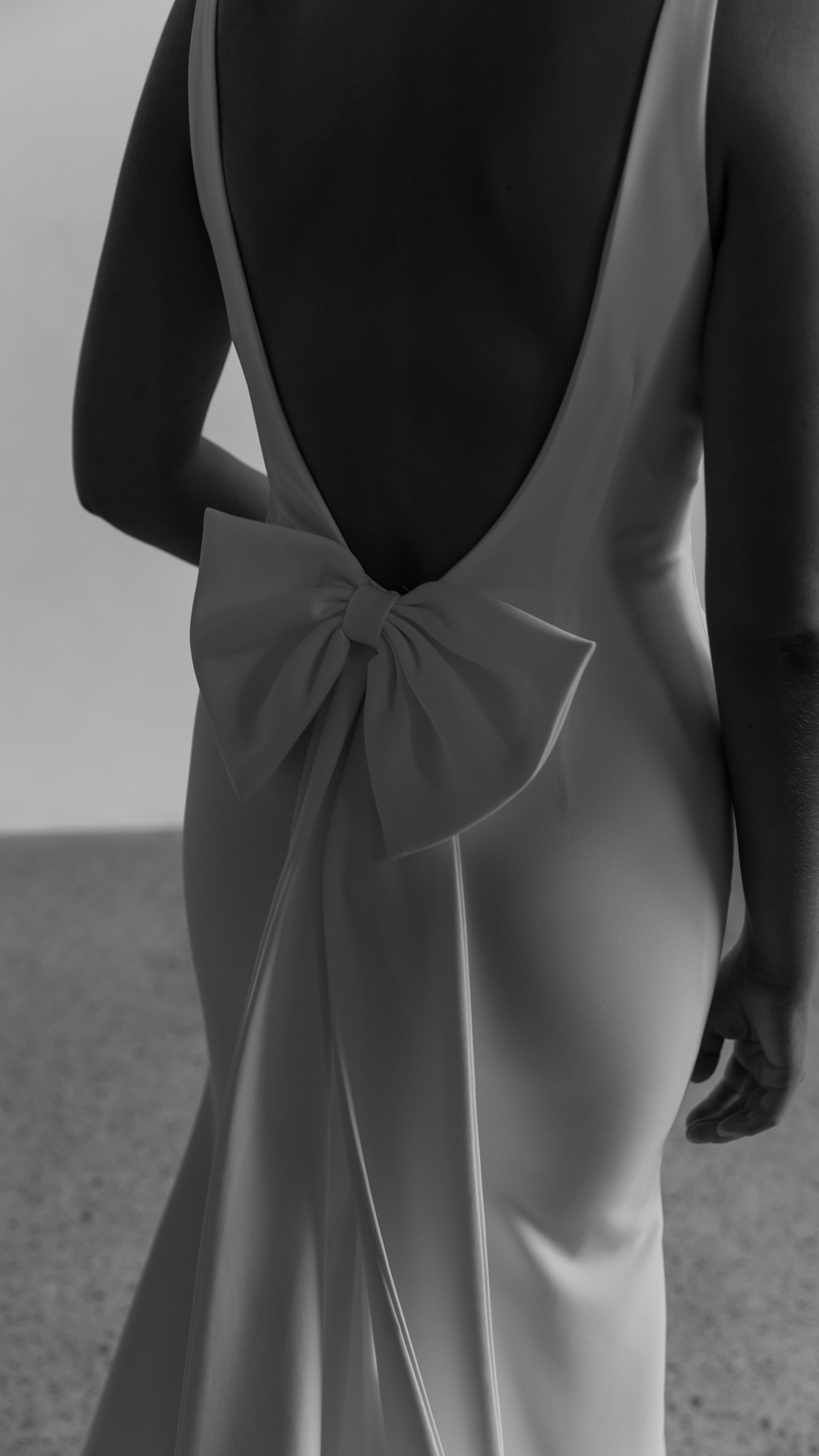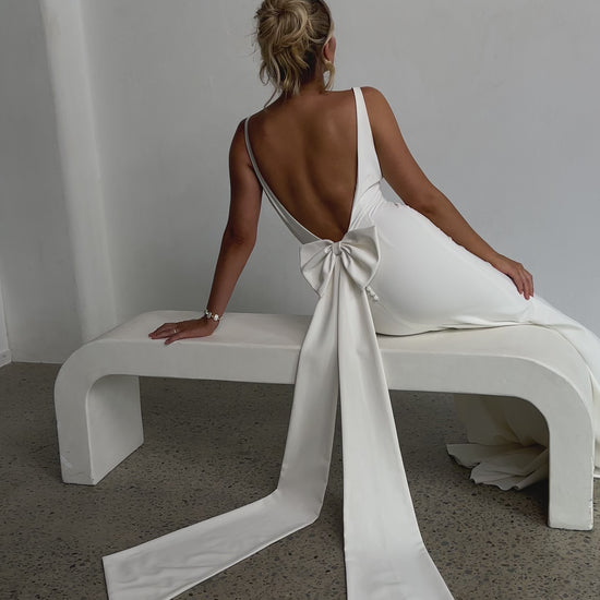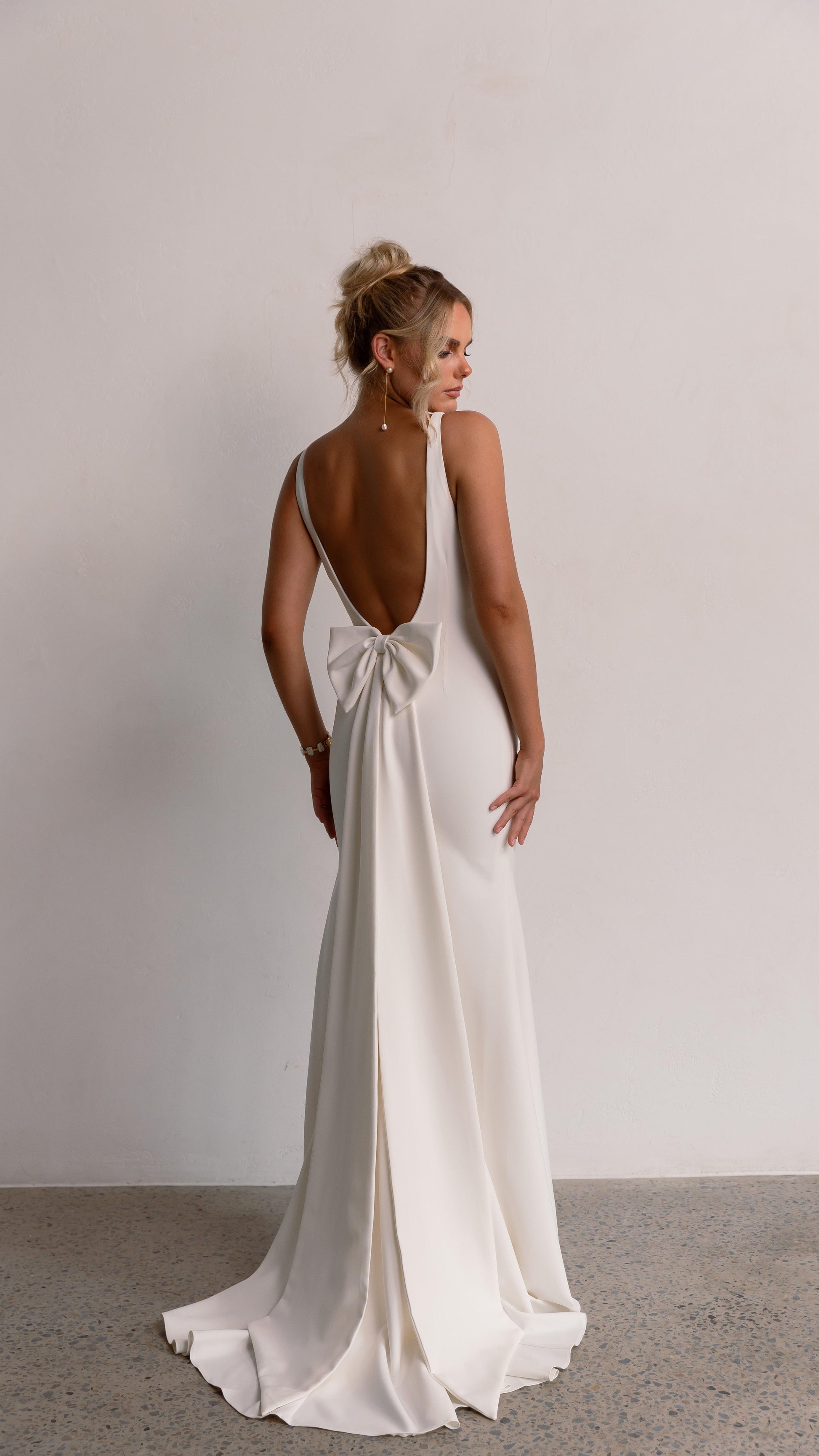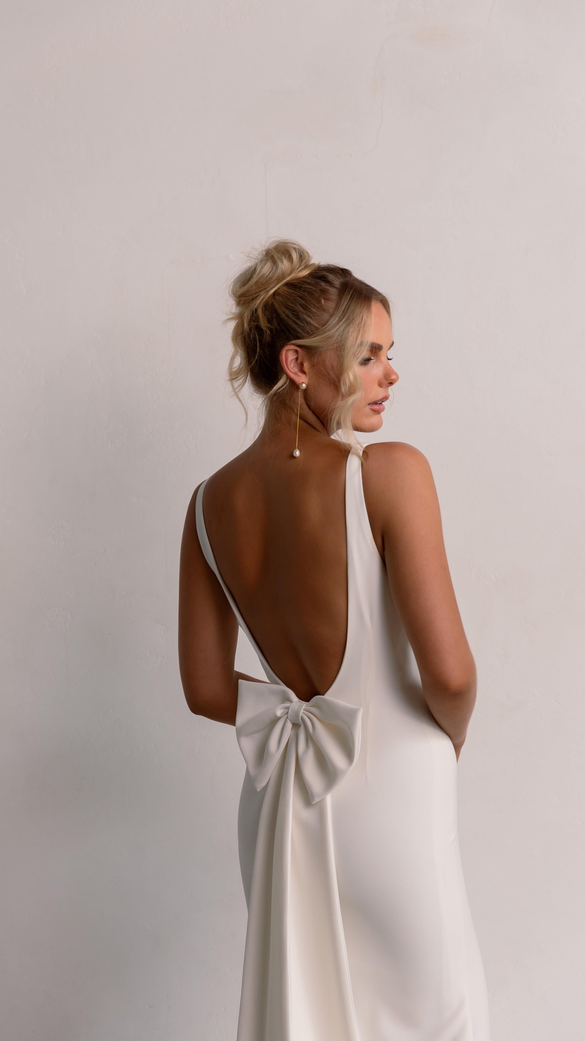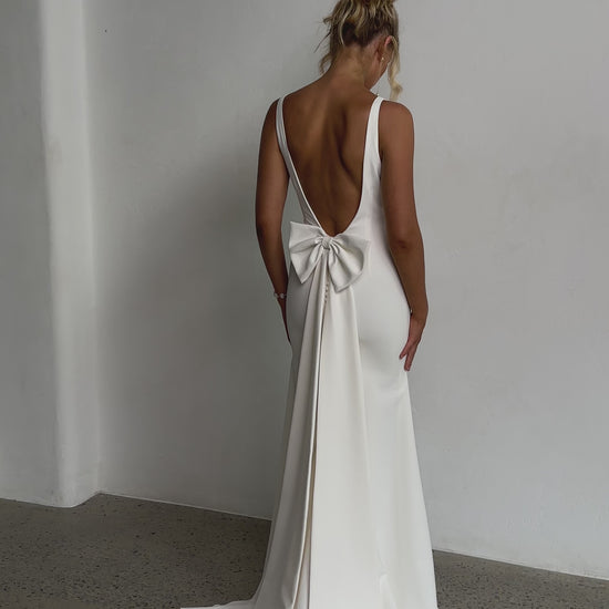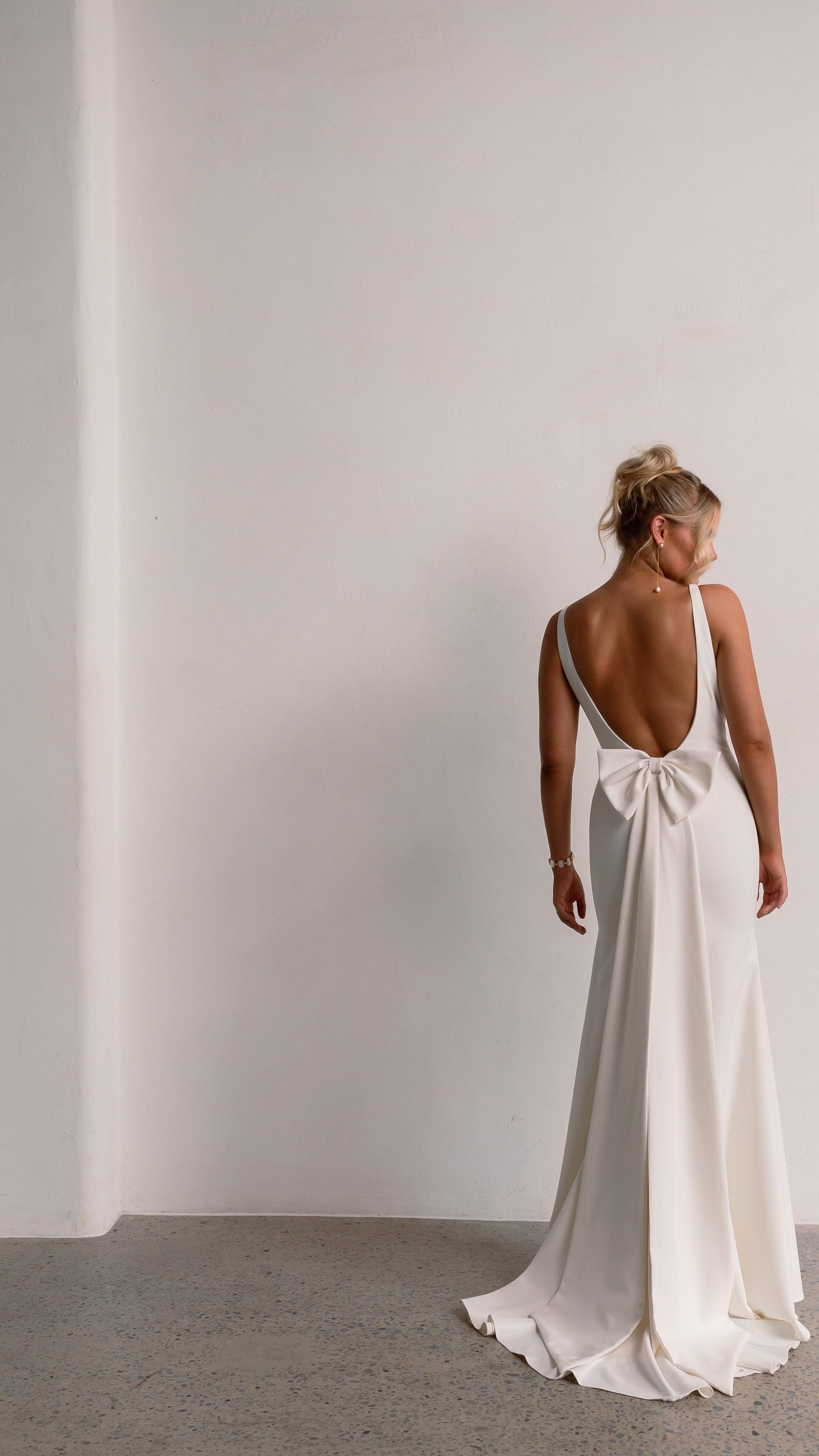 The fitted design gently flares into a subtle mermaid hem, while a statement bow at the back adds a soft, romantic accent. Fully lined and finished with a graceful chapel-length train, this gown moves beautifully and photographs like a dream.