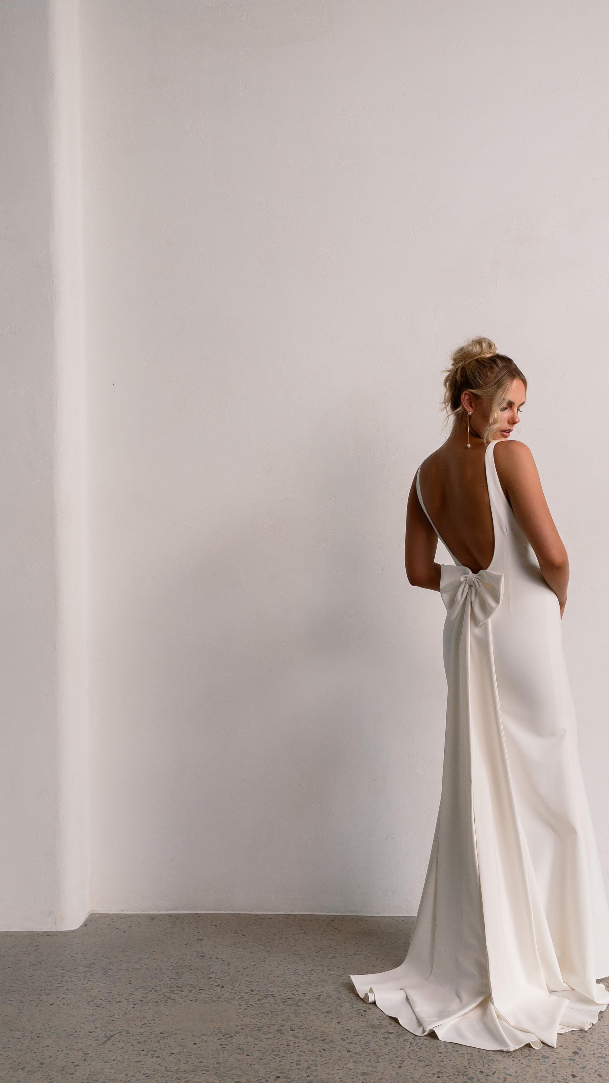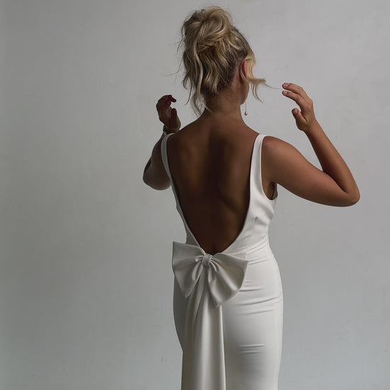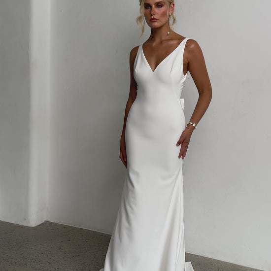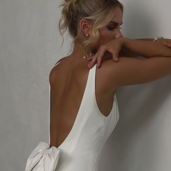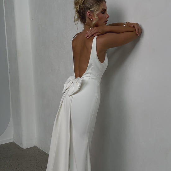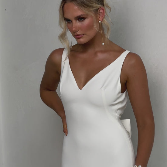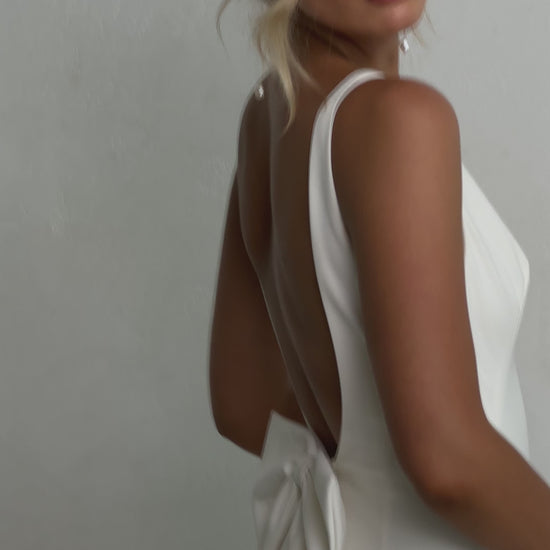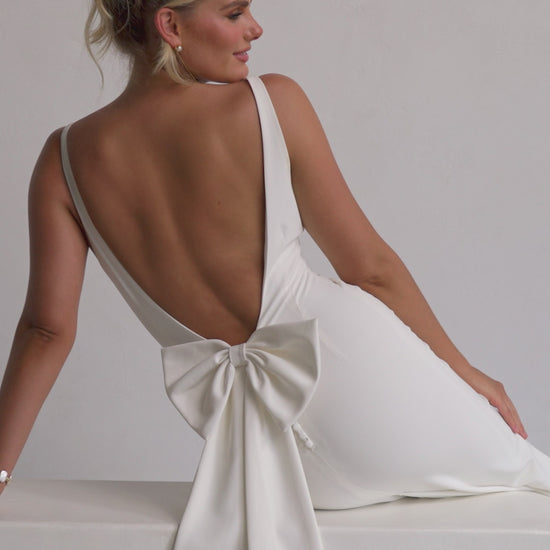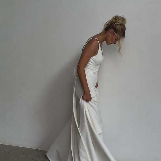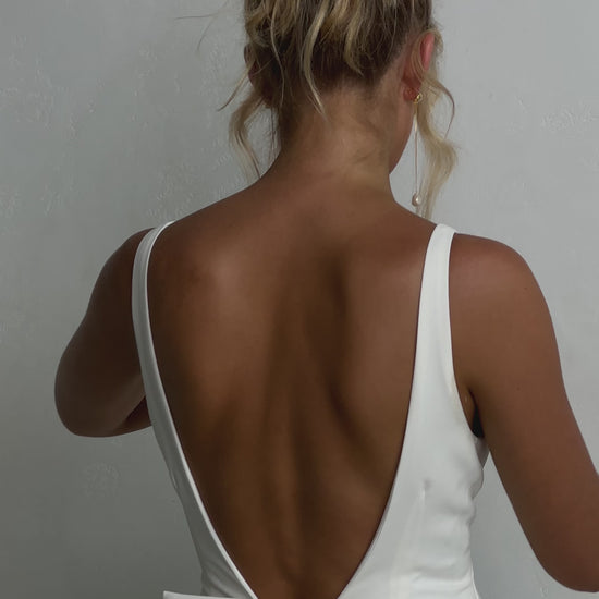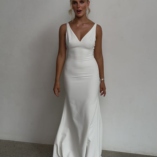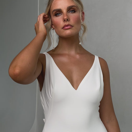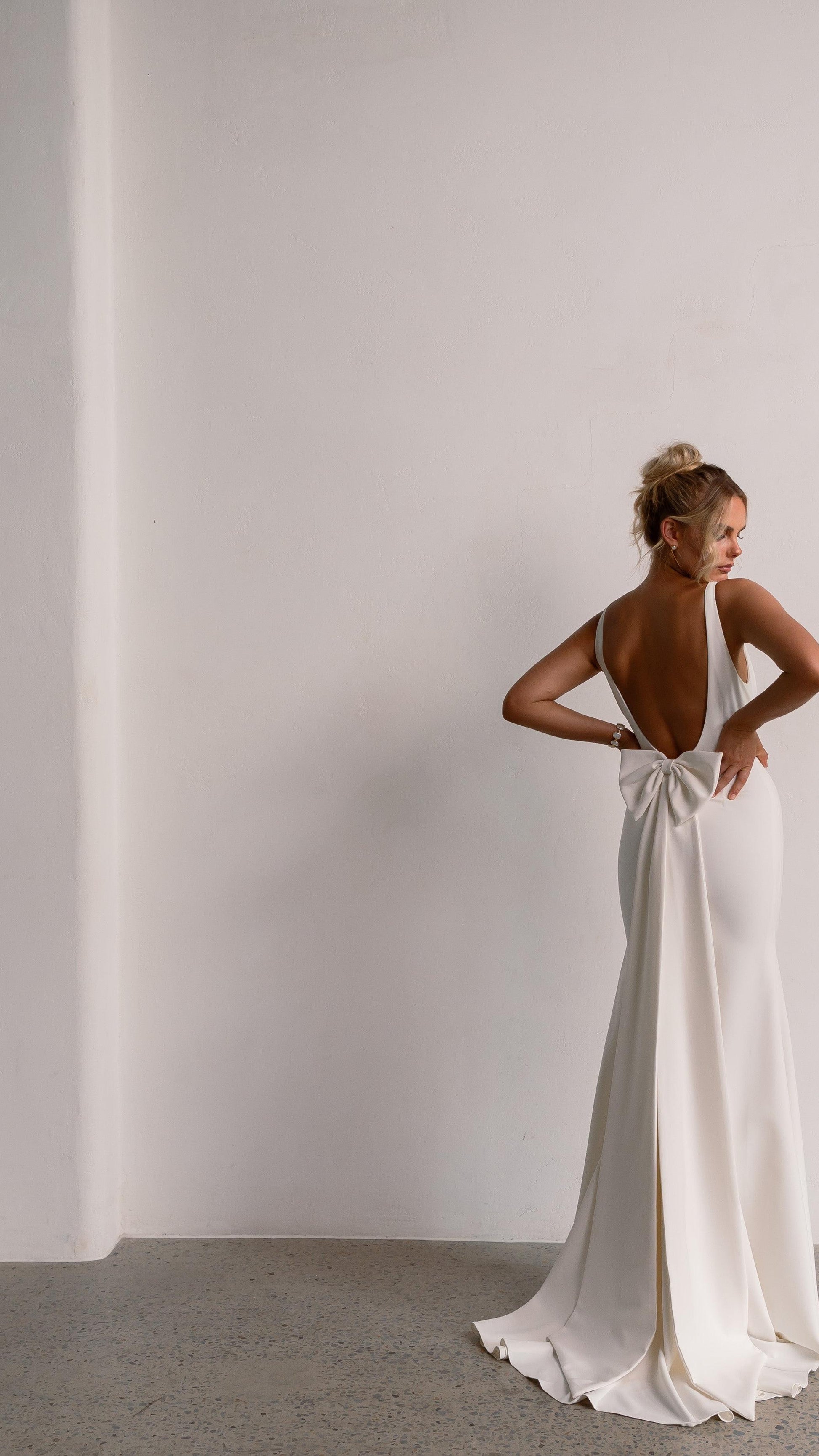 Sleek and sophisticated, our Pippa wedding dress by Tania Olsen Designs is designed for the modern bride who embraces timeless elegance with a touch of flair. Crafted with nude built-in bra cups for seamless support, the gown features a flattering V-neckline at the front and wide straps that lead to a striking, plunging scoop back—creating a stunning silhouette from every angle.
