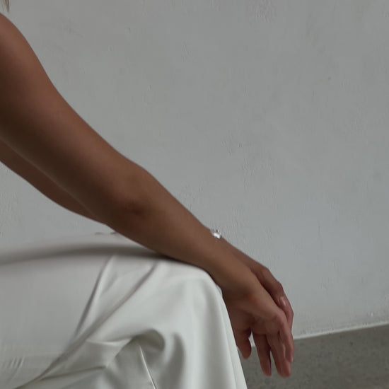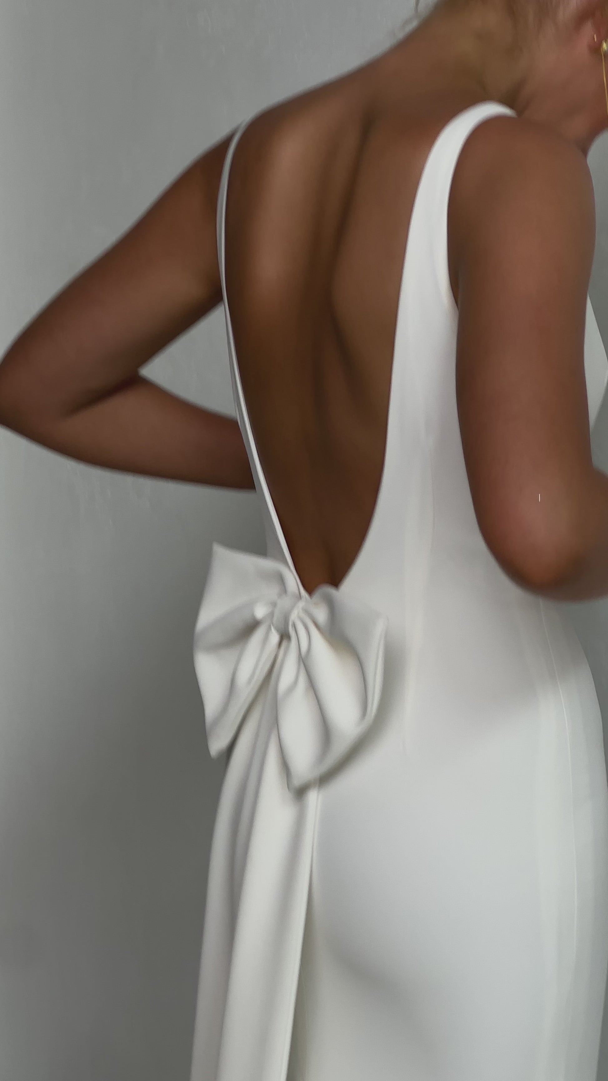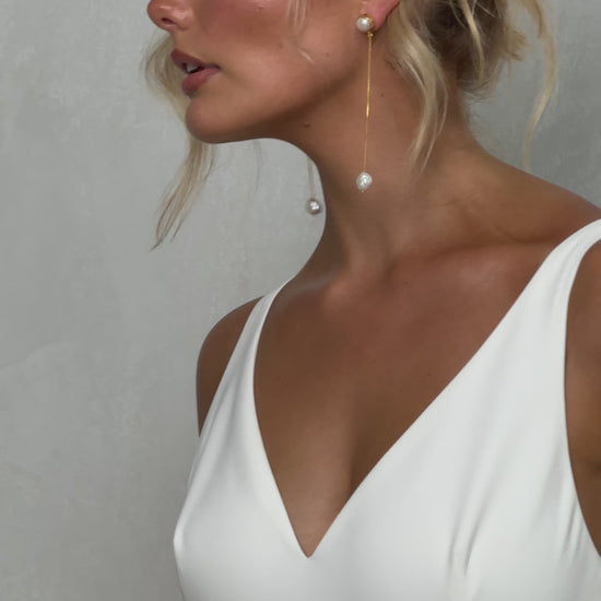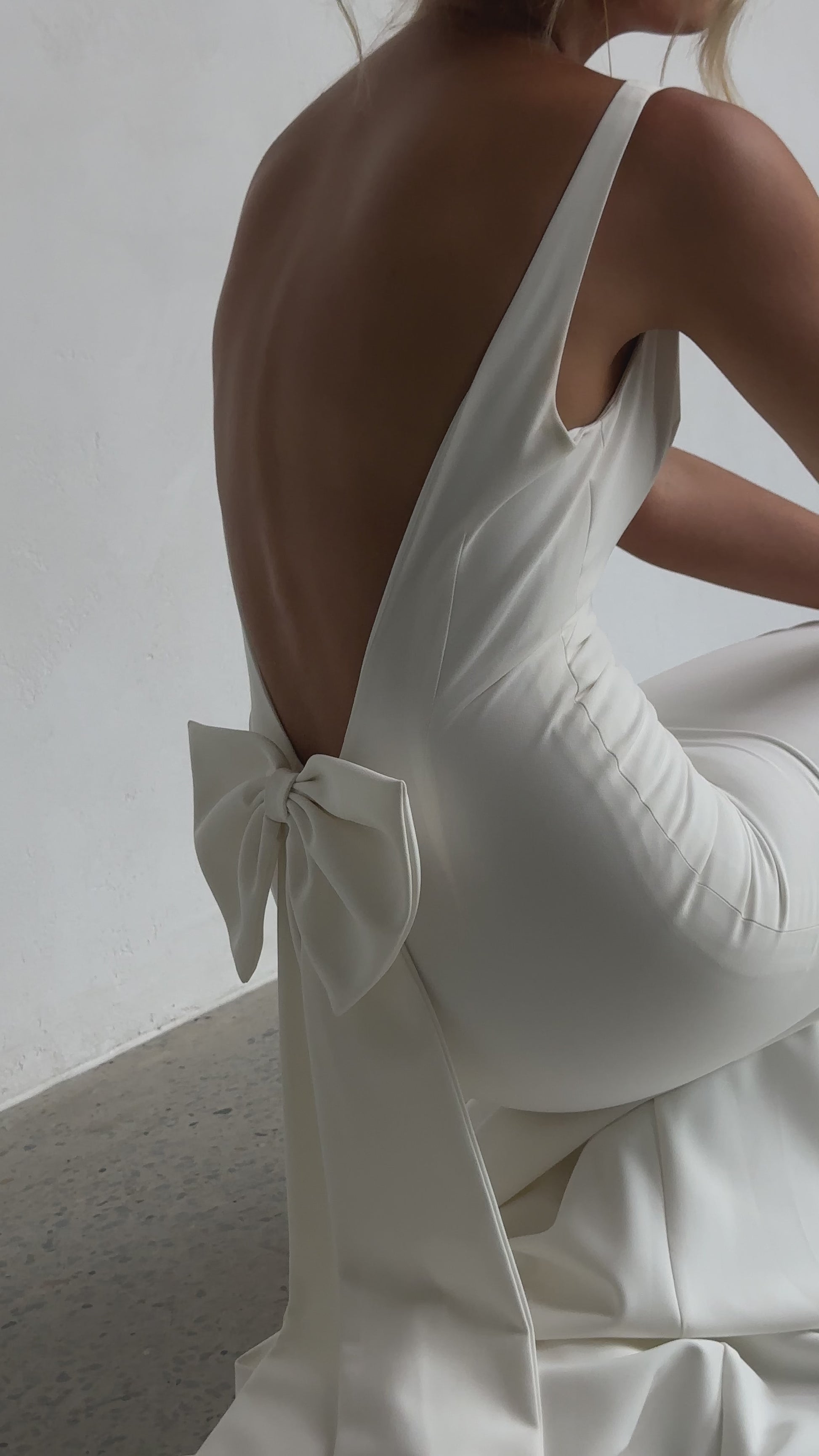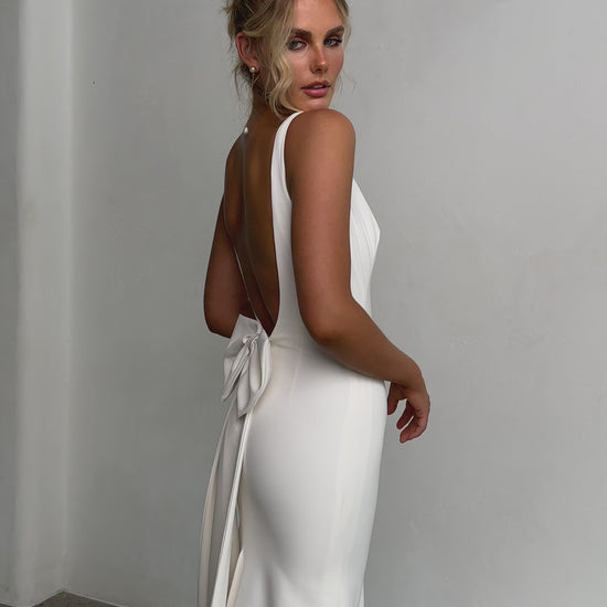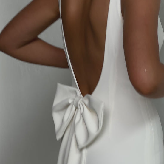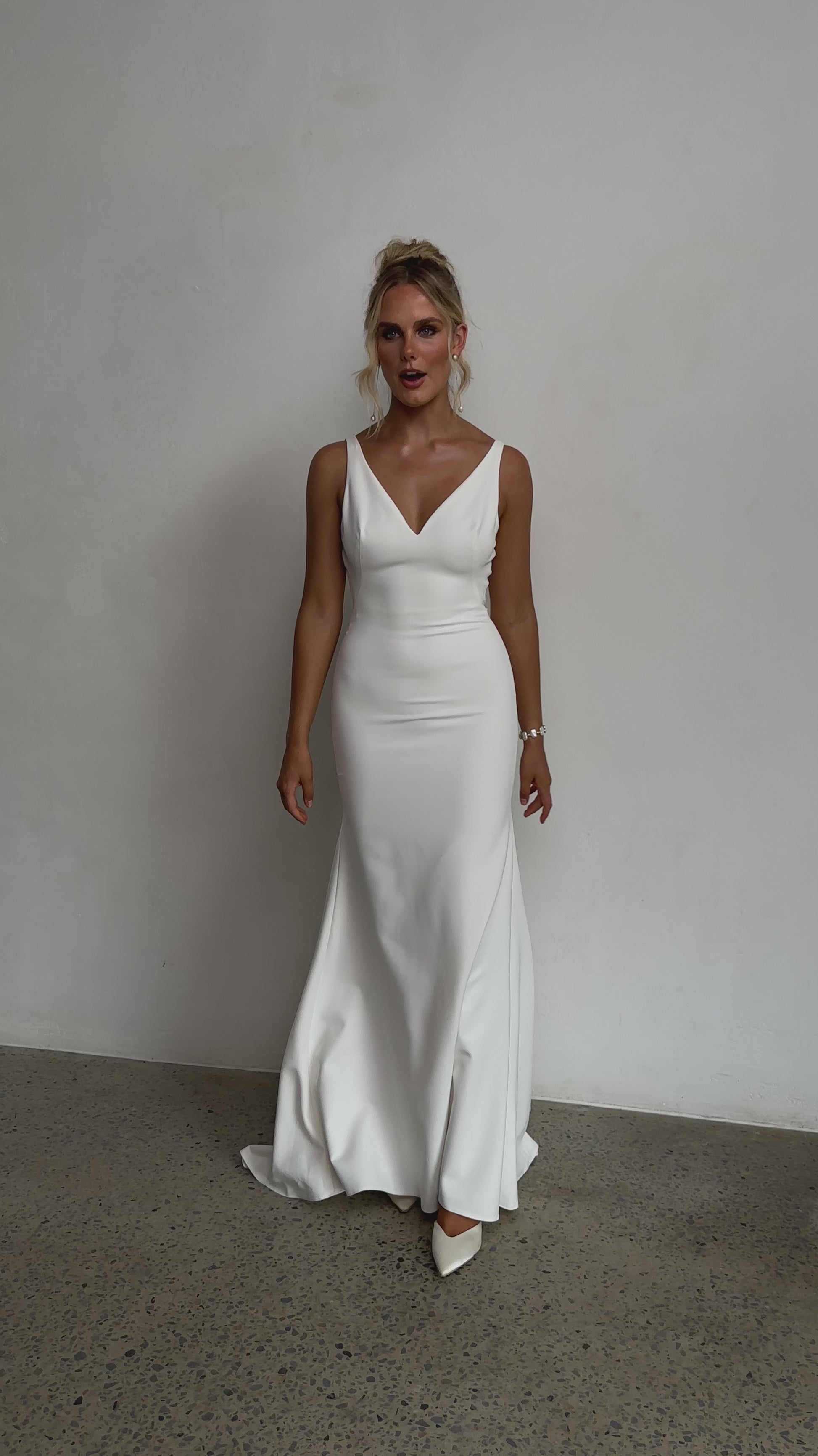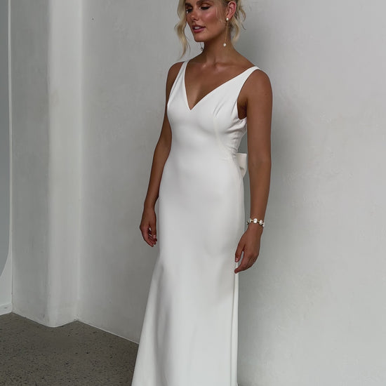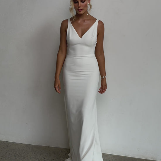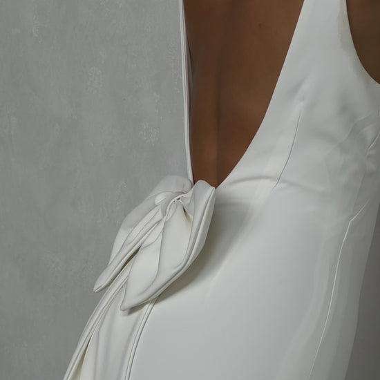 Sleek and sophisticated, our Pippa wedding dress by Tania Olsen Designs is designed for the modern bride who embraces timeless elegance with a touch of flair. Crafted with nude built-in bra cups for seamless support, the gown features a flattering V-neckline at the front and wide straps that lead to a striking, plunging scoop back—creating a stunning silhouette from every angle.