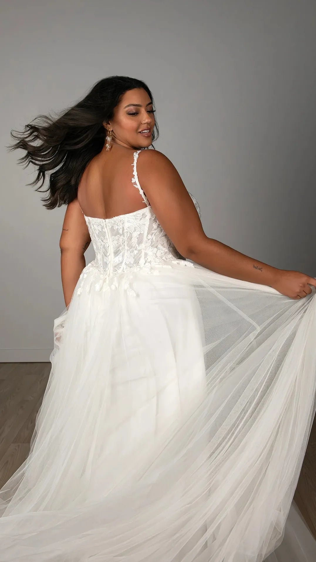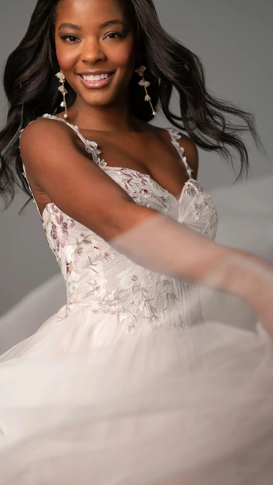 Capturing the essence of romantic bridal fashion, Style SY8113 enchants with its soft A-line silhouette and ethereal, colorful embroidered lace. Delicate, petal-adorned spaghetti straps lead to a deep sweetheart neckline, where a sheer bodice features a stunning twisted ruched knot detail. A subtly scooped back adds a hint of allure, while layers of frothy pink tulle cascade into a soft A-line skirt, creating a dreamy, weightless effect. This enchanting dress is a breathtaking blend of whimsy and elegance for the bride who embraces playful romance. This gown is also available in plus sizes and with a variety of bodice lining options.