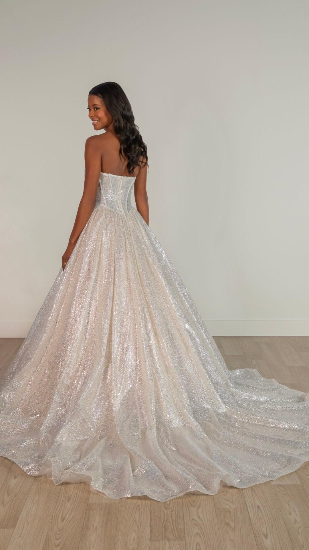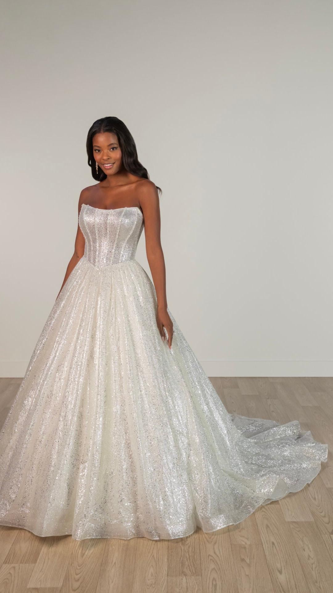 A true showstopper designed for the modern princess, Style SY8133 is designed for the fashion-forward bride. This enchanting ballgown features a strapless cat-eye neckline that flows into a striking corset-style bodice with exposed boning, adding a touch of regal allure. From the basque waist, layers of shimmering tulle cascade gracefully, creating a glittering, dramatic effect with every step. Blending timeless elegance with contemporary glamour, this princess-worthy wedding dress is made for both the aisle and the dance floor. This gown is also available in plus sizes.