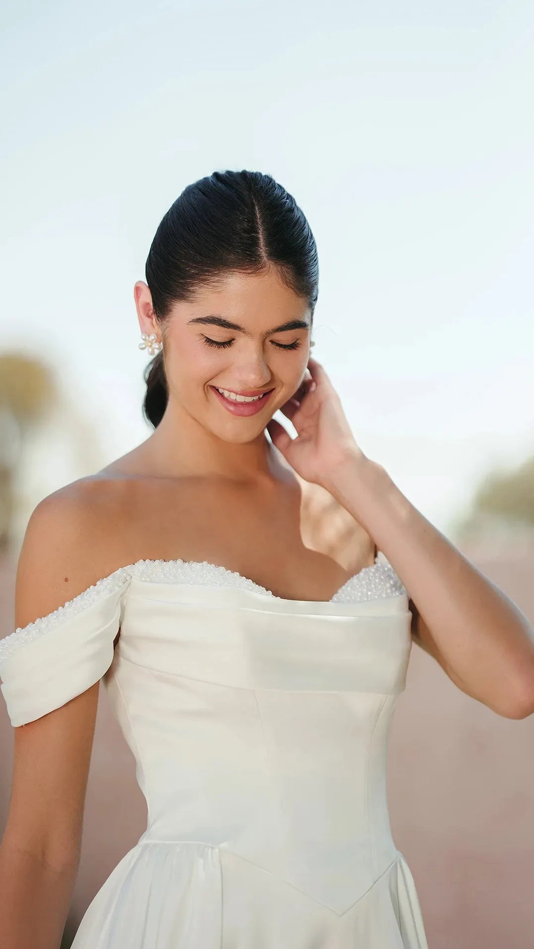 Stye SY8236 is pure satin sophistication for the modern princess bride. This glamourous A-line silhouette gives a smooth, luminous finish from bodice to hem. A peekaboo pearl sweetheart neckline adds a touch of shine, layered with a draped satin band for refined romance. The basque waistline cinches the figure before flowing into a voluminous skirt with dramatic hip volume, creating the iconic and refined ballgown silhouette. Finished with pearl buttons down the back, this regal wedding dress is a timeless vision of elegance, also available in plus sizes.
