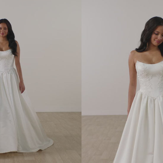 Style SY8239 offers a fresh take on classic bridal elegance with its stunning ballgown silhouette crafted from Grand Satin fabric. The strapless bodice is adorned with delicate lace appliqués, adding texture and romantic detail while maintaining a sleek and modern feel. Featuring a chic scooped cat-eye neckline and expertly place seaming, the bodice accentuates the natural hourglass shape. From the defined basque waist, sculpted pleats unfold into a full, voluminous skirt that exudes regal sophistication. A line of fabric-covered buttons trails from the bodice down the dramatic train, completing this clean, structured gown designed to make a lasting impression. Also available in plus sizes.