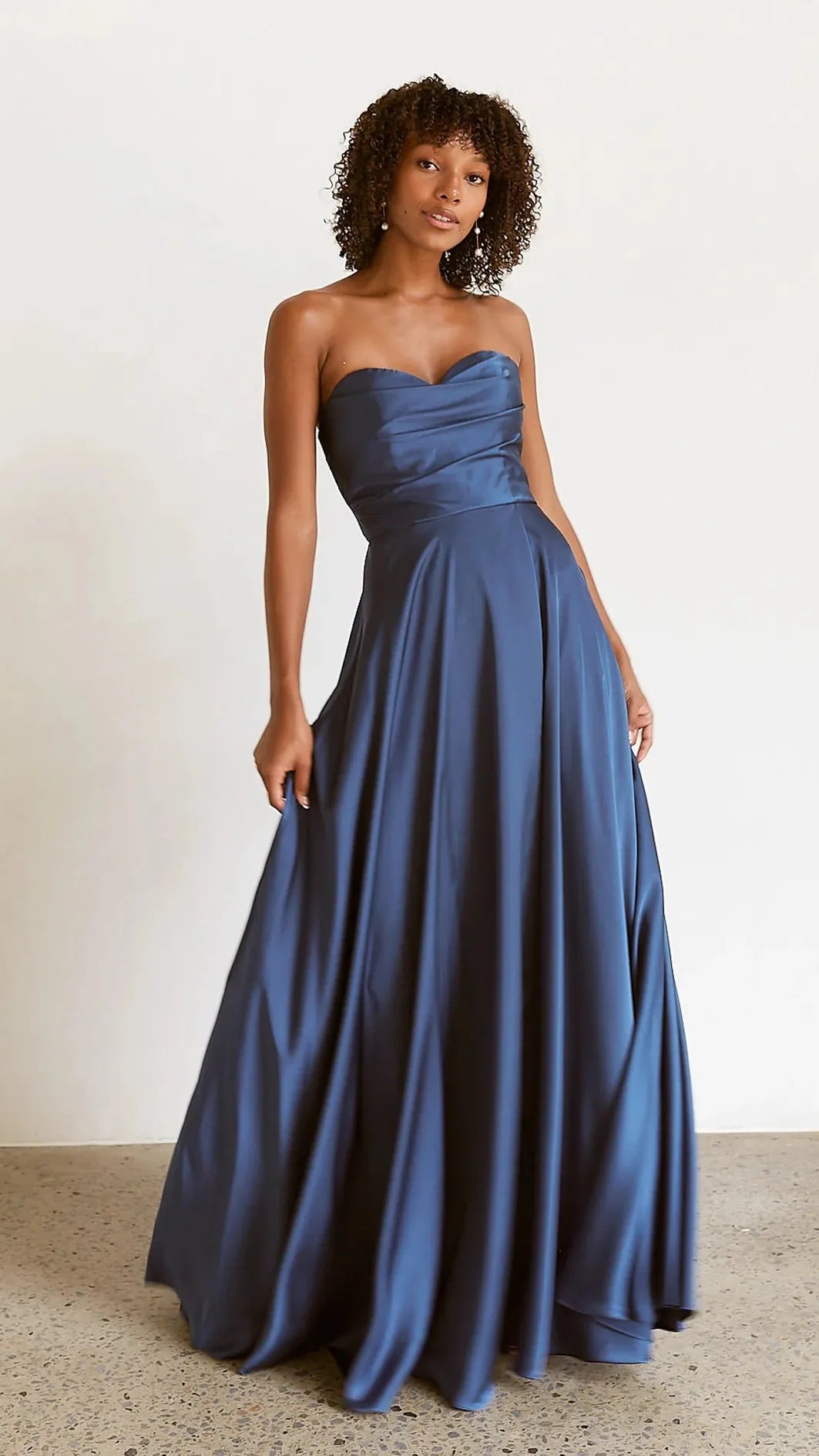- Strapless sweetheart neckline with draped bodice detail to enhance silhouette